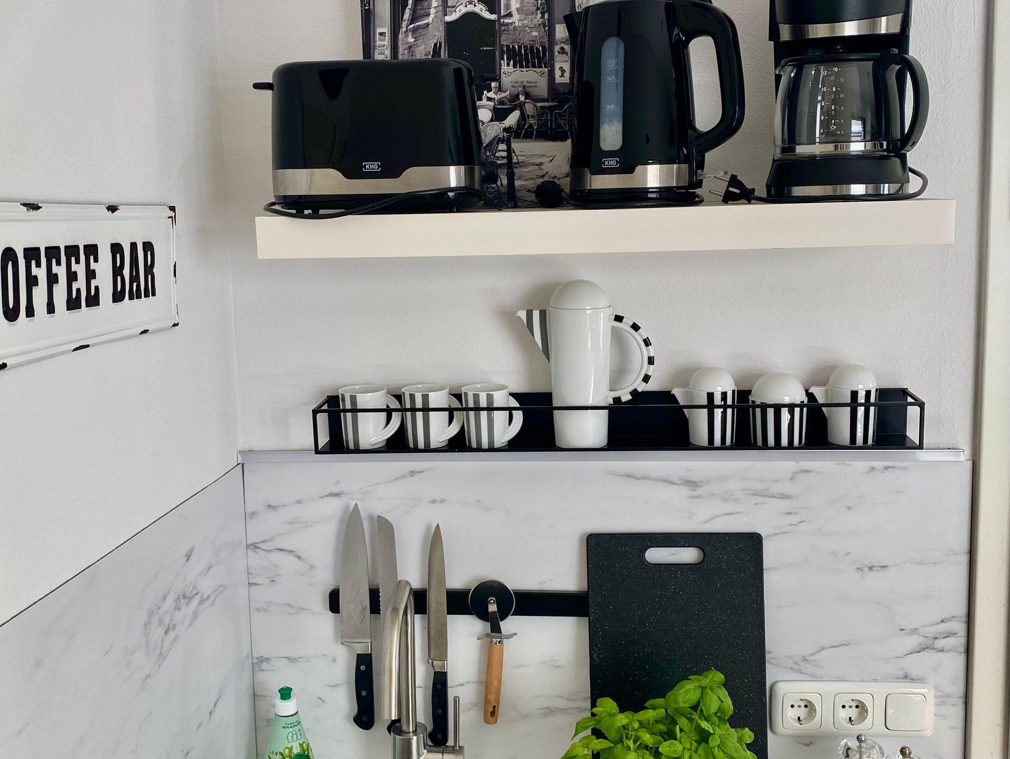 Doppelbett mit Bettwäsche, Pantry - Küche mit kleinem Kühlschrank & Herd, Bad mit Dusche/WC, Fön und Handtüchern. Es gibt einen Smart TV und WLan. Die Pantry-Küche ist mit Geschirr, Besteck, Gläsern, einer Nespressomaschine und einer Filterkaffeemaschine, einem Toaster, Wasserkocher und anderen Gebrauchsgegenständen ausgestattet.