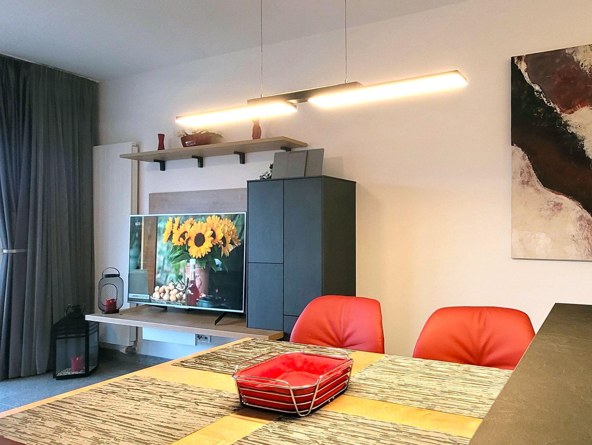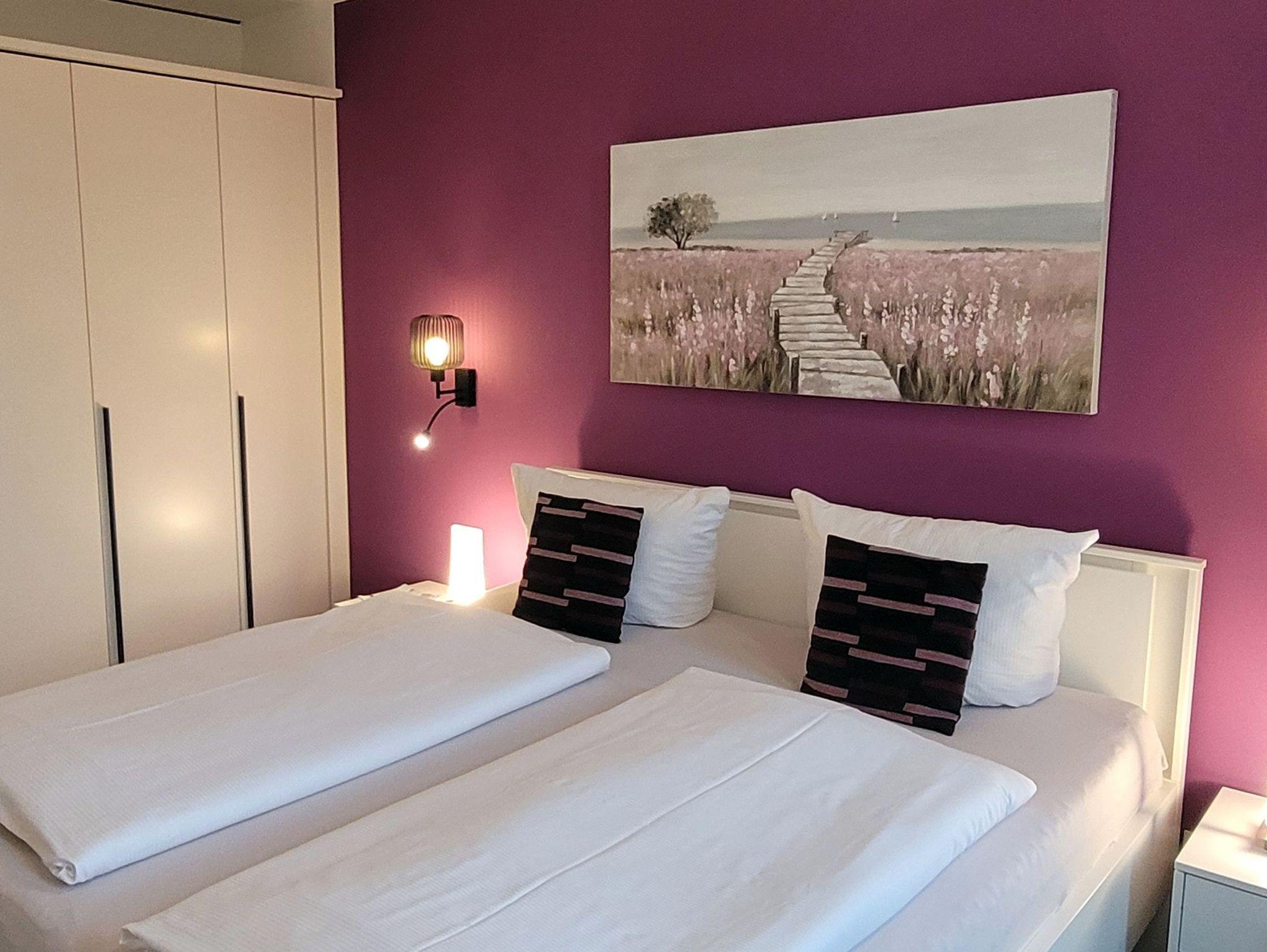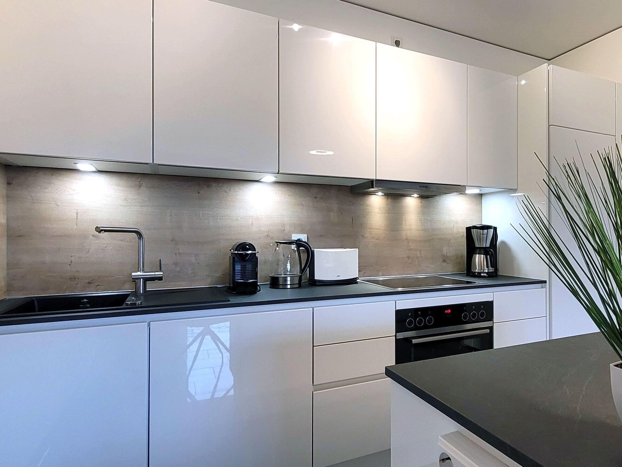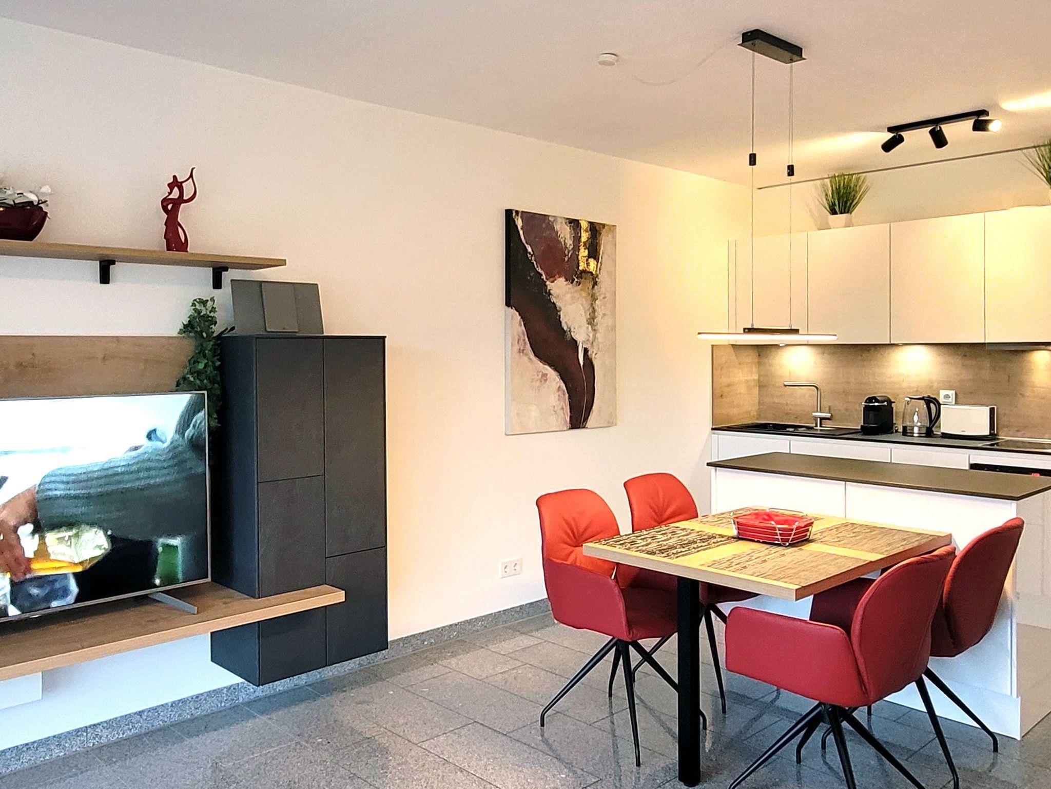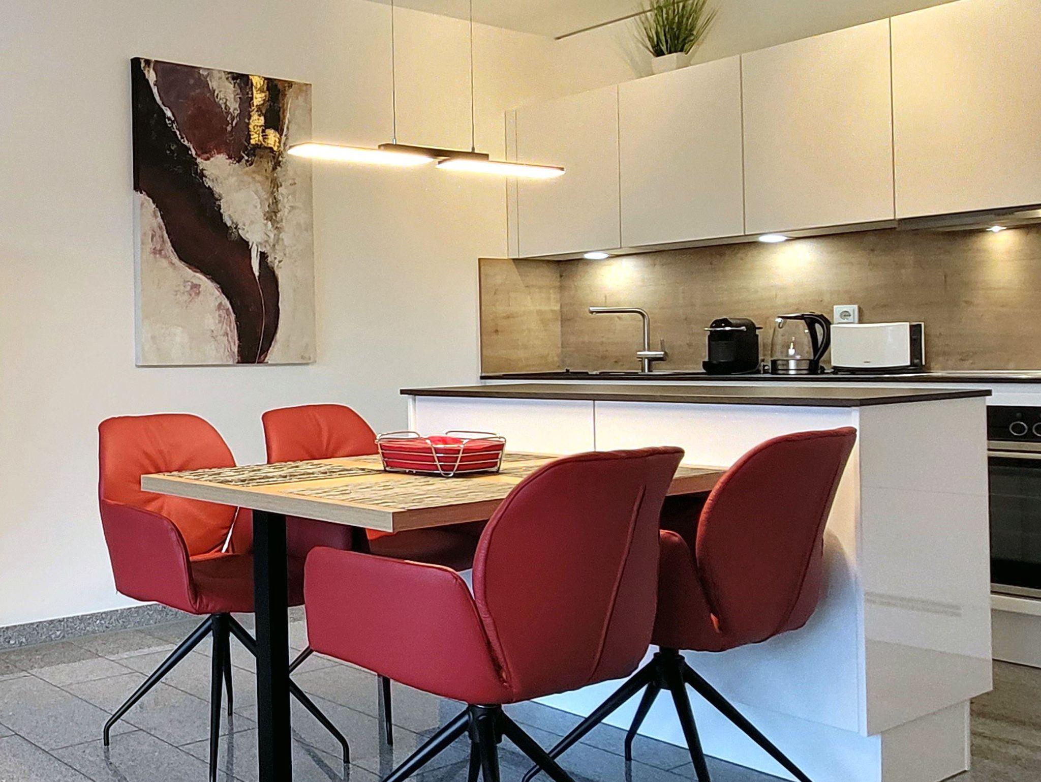 Die Ferienwohnung ist stilvoll mit Granitfliesen ausgestattet. Neben einem schönen Schlafzimmer gibt es eine voll eingerichtete moderne Küche mit Geschirrspülmaschine, Backofen und Mikrowelle. Die Wohnung ist für 4 Personen eingerichtet: Neben dem Schlafzimmer gibt es im Wohnzimmer noch ein Qualitäts-Schlafsofa. Das moderne Badezimmer ist mit hochwertiger Sanitärkeramik und einer begehbaren Dusche ausgestattet. Die Wohnung verfügt über kostenloses WLAN.