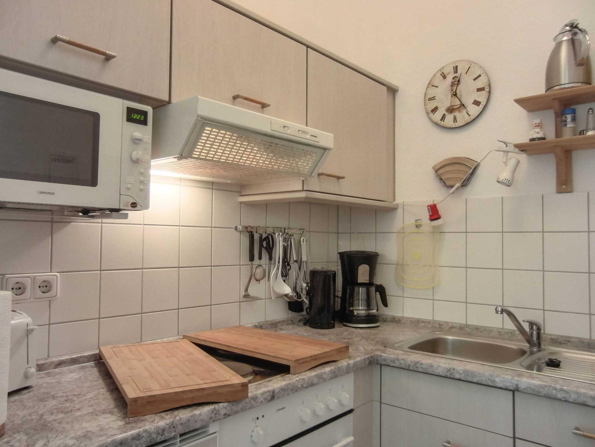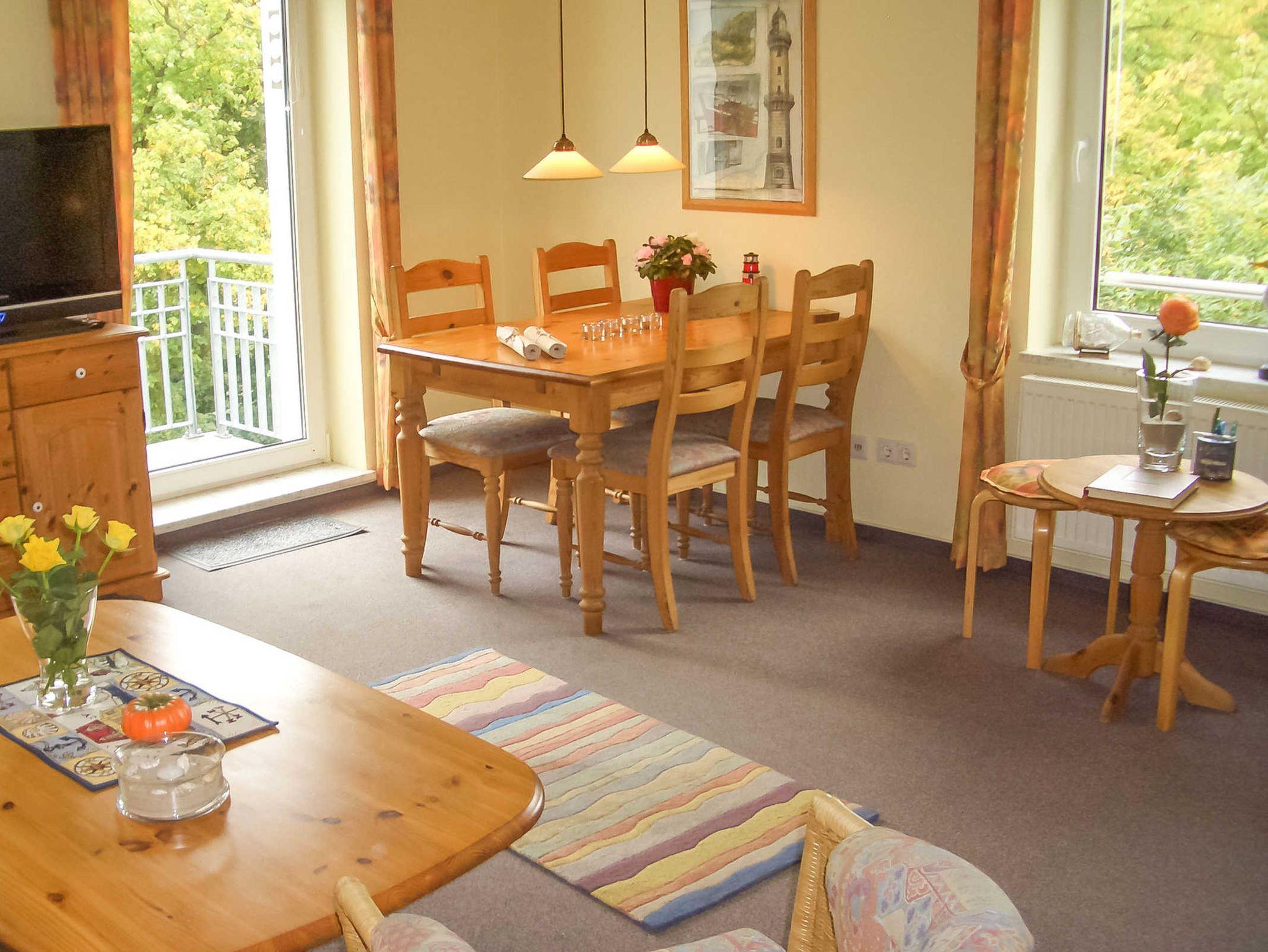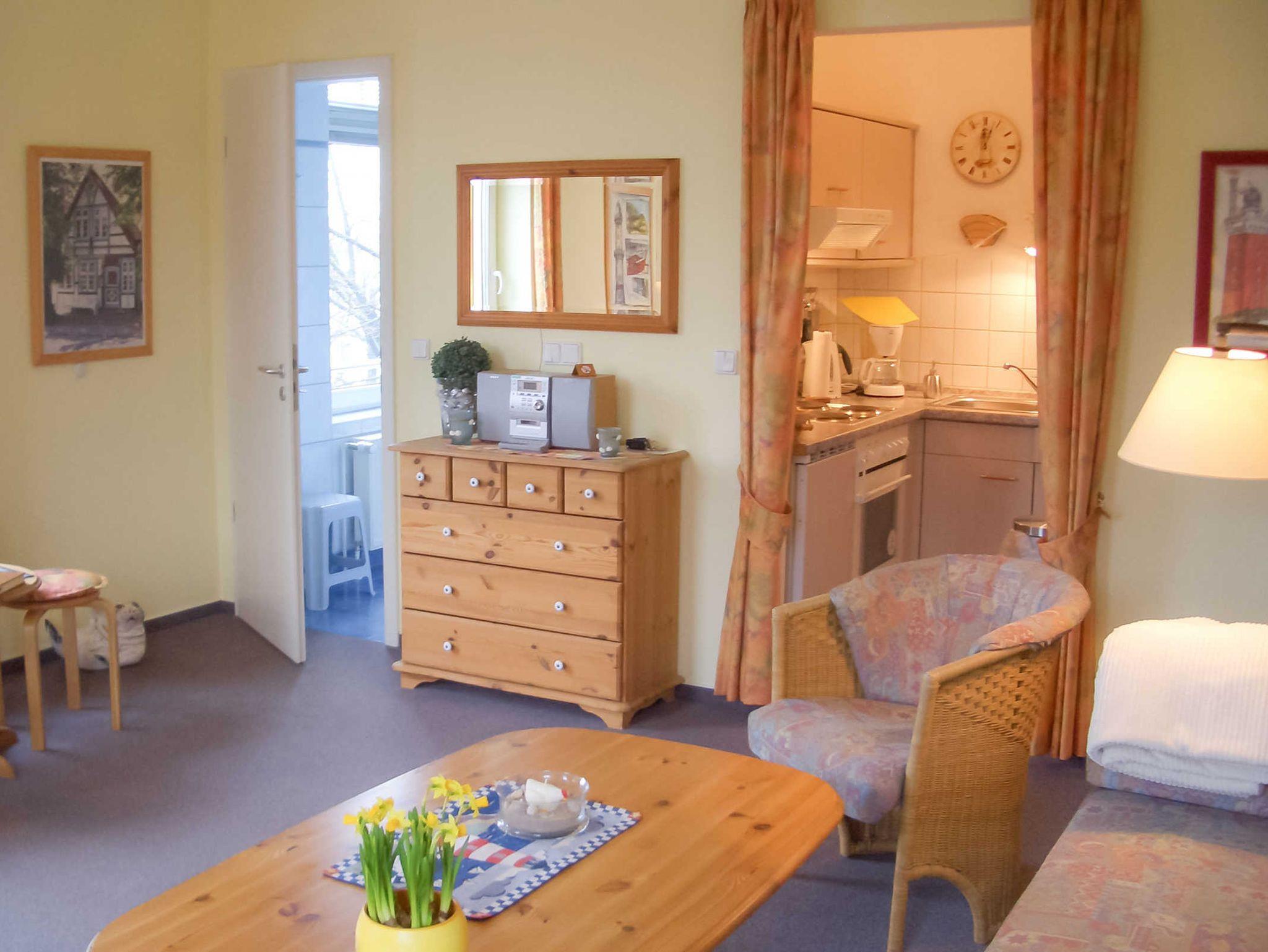 Die 2-Raum-Ferienwohnung besteht aus einem Wohnraum mit Essbereich, einem Schlafzimmer, einer Küche sowie einem Duchbad. Außerdem verfügt die Wohnung über einen Balkon.
