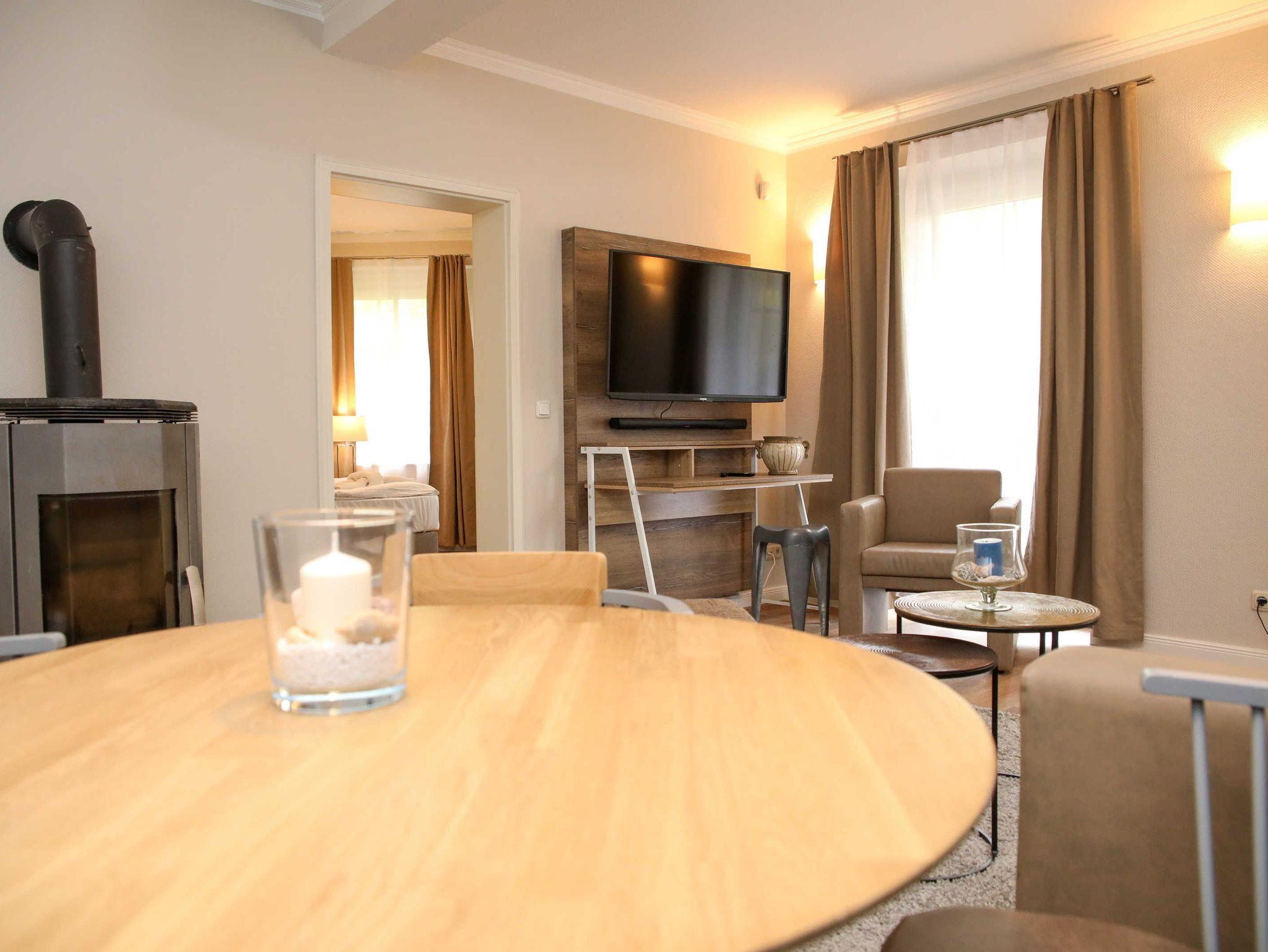 Die 2-Zimmer-Ferienwohnungen mit einer Größe von ca. 45-55 qm mit Balkon oder Terrasse bieten viel Platz für bis zu 4 Personen in separaten Wohn- und Schlafzimmern mit Doppelbett sowie ein neu gestaltetes Duschbad. Im Wohnzimmer befindet sich ein Kamin.