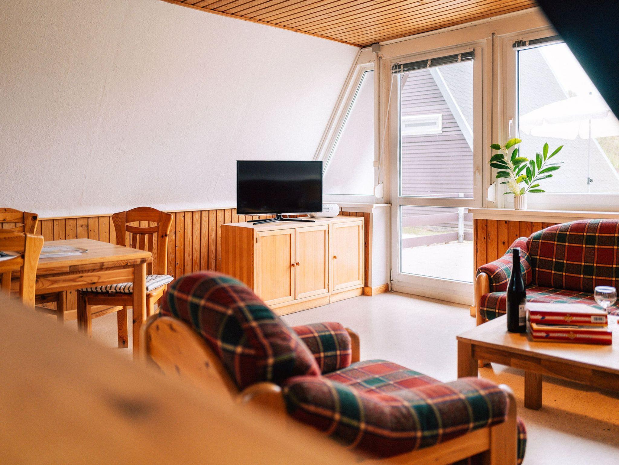 gemütliches Wohnzimmer mit TV zum Entspannen, zum Teil offene Küche mit Kaffeemaschine, Wasserkocher, Toaster, Mikrowelle, Herd mit Ofen, Badezimmer mit Dusche/ WC.