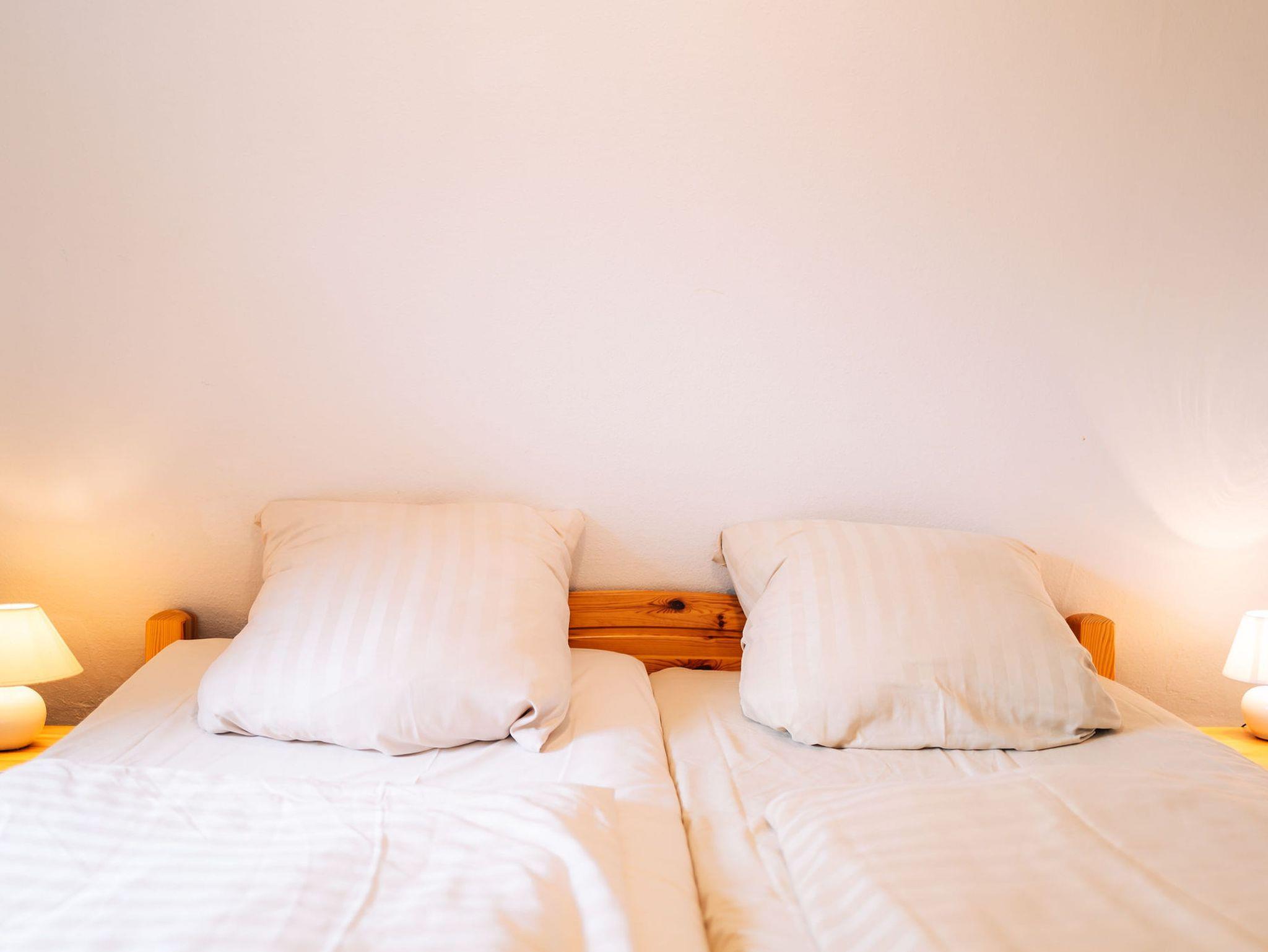 Eine steile Raumspartreppe führt zu den zwei Schlafräumen - ein Schlafzimmer mit Doppelbett, ein Schlafzimmer mit zwei Einzelbetten. Die Bettwäsche ist inklusive. Handtücher bitte mitbringen!