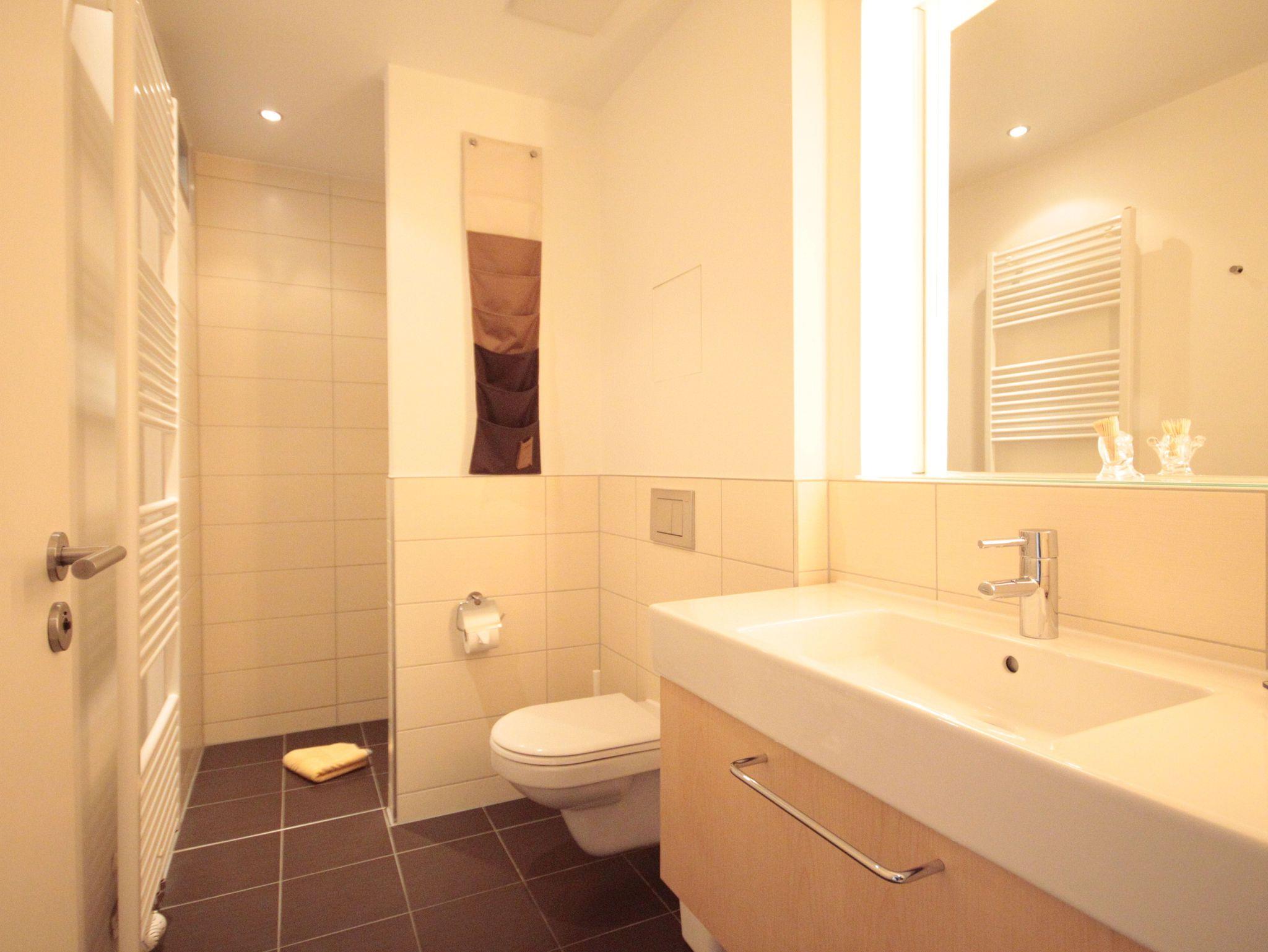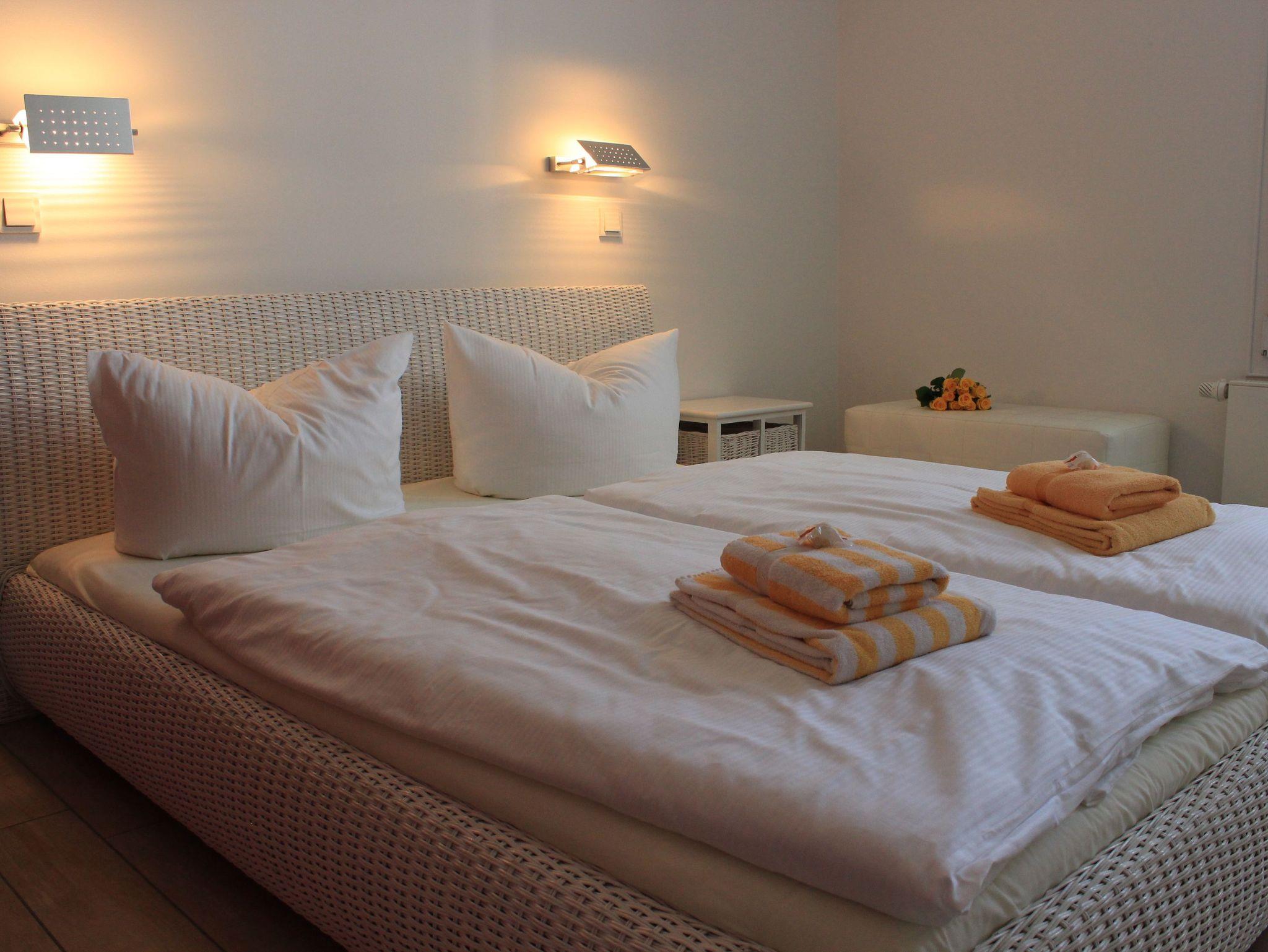 Die Wohnung ist hochwertig und geschmackvoll möbliert, die bodentiefen Fenster geben den Blick in den Kurpark frei. Beide Schlafzimmer haben einen zusätzlichen Fernseher.