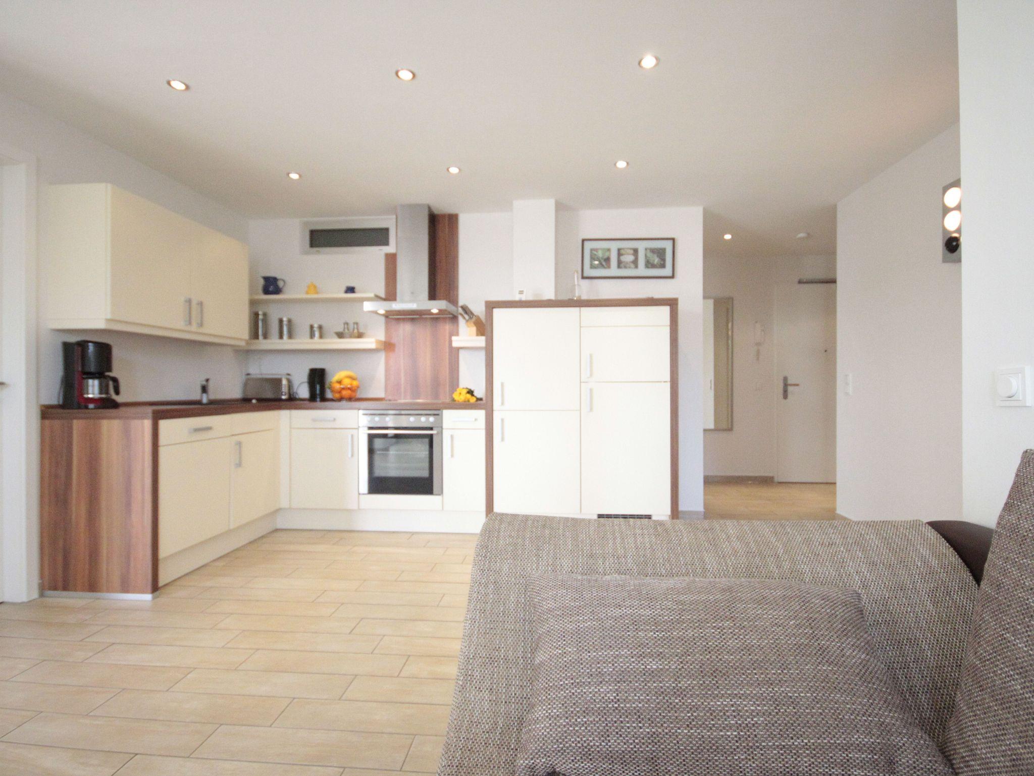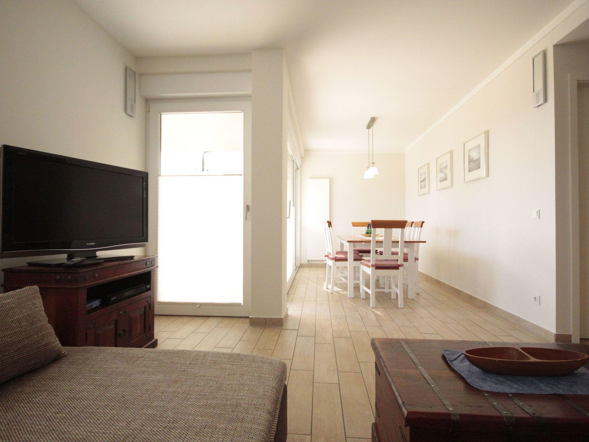Hochwertige Ferienwohnung mit viel Platz für 4 Personen. Eine große Terrasse mit Blick in den Kurpark ist direkt vom Wohnbereich zu betreten. Die Terrasse ist saisonbedingt (Mai bis September) möbliert.
