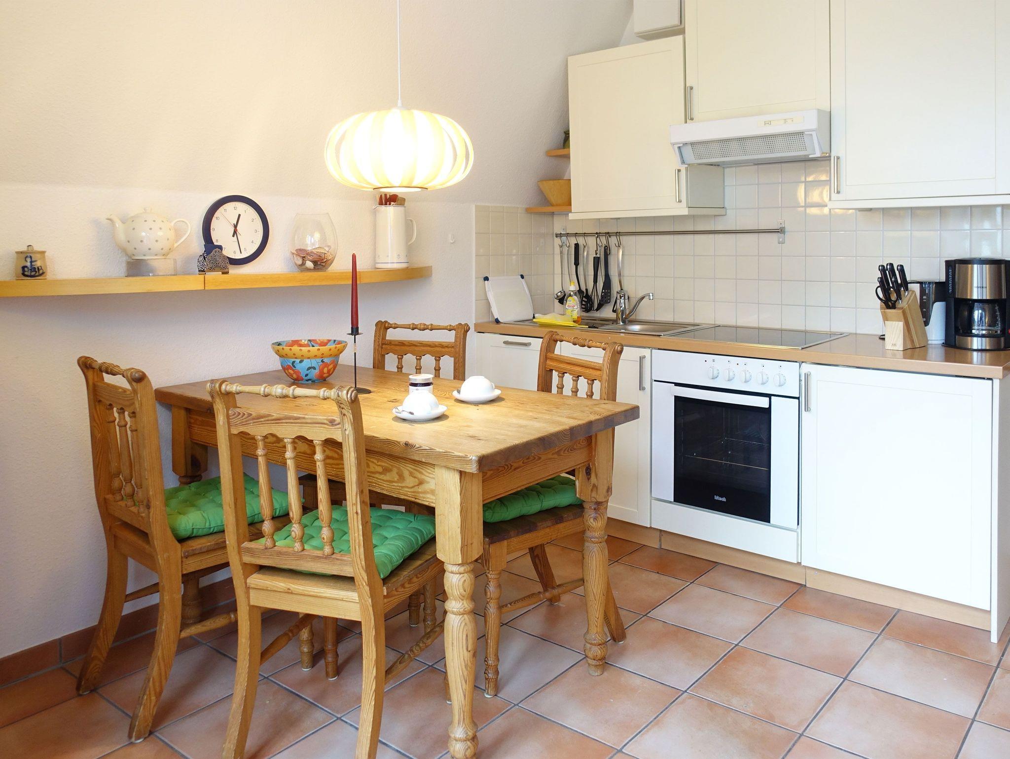 Viele Details und leichte Holzmöbel sorgen für eine komfortable Einrichtung der Ferienwohnung. Hier fühlt sich jeder wohl, egal ob er jung oder alt ist. Die untere Etage umfasst den Wohn- und Essbereich, die Küche, das Bad mit einer kleinen Badewanne und eine separate Toilette. Die Küchenzeile im Ess- und Wohnbereich verfügt über ein 4-Platten-Ceranfeld, einen Backofen und eine Spülmaschine.