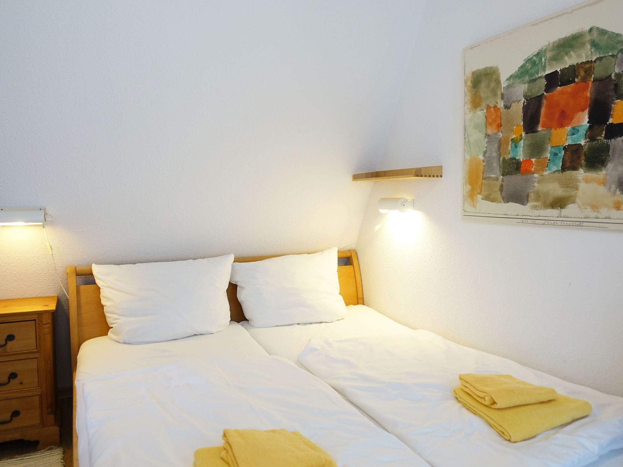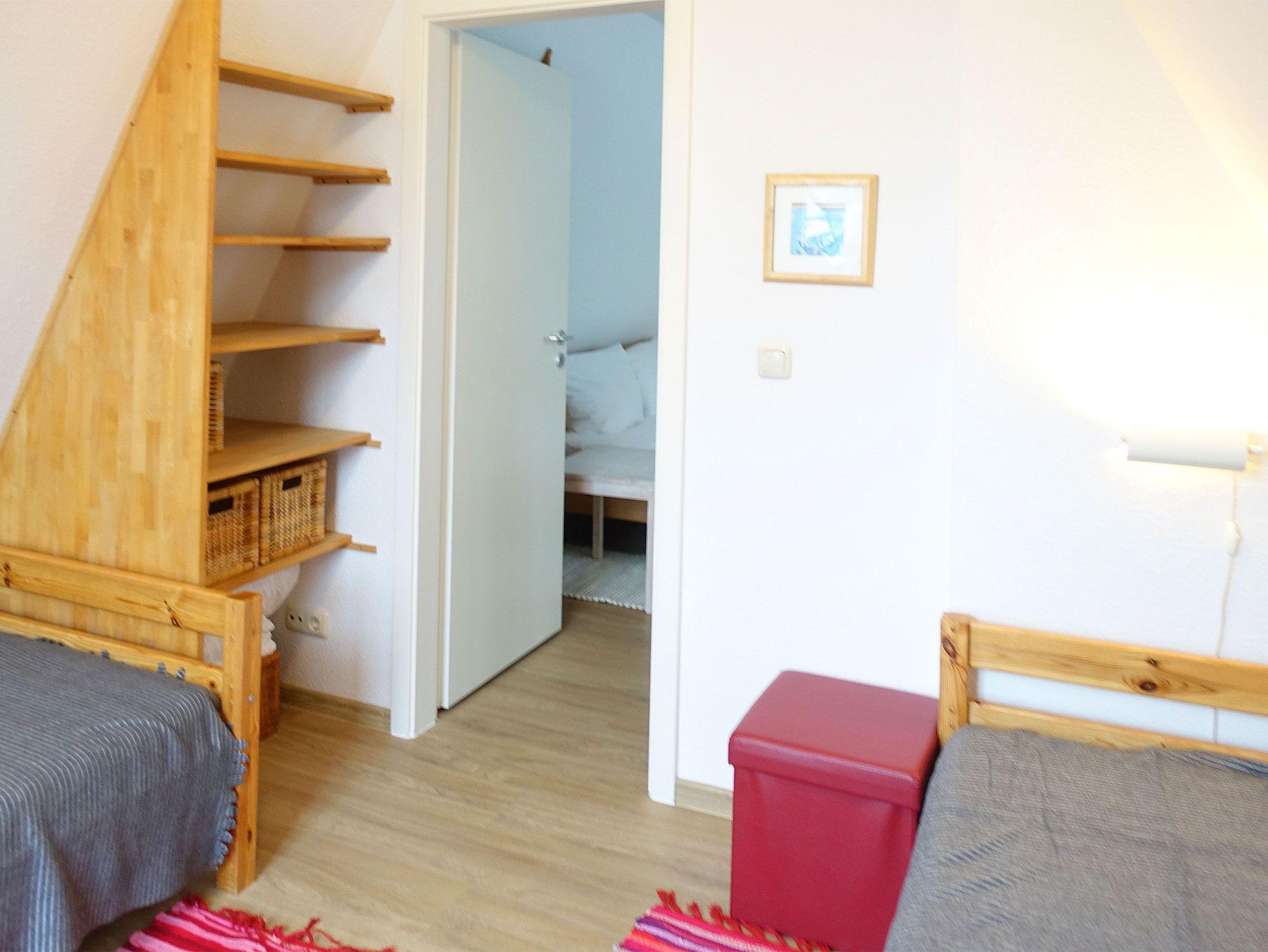 Sie erreichen die Schlafbereiche auf der oberen Etage mit einer komfortablen Holztreppe. Es gibt hier eine offene Galerie mit einem 1,60 m breiten Doppelbett. Man erreicht ein eigenes Schlafzimmer mit zwei Einzelbetten von der Galerie aus. Ein Babybett kann in beiden Schlafbereichen untergebracht werden.