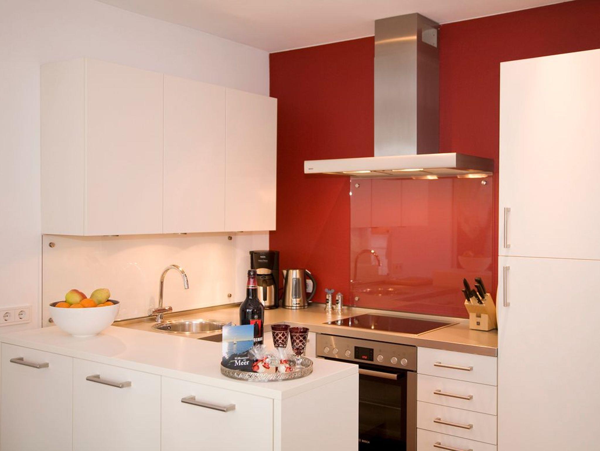 Das Wohnzimmer ist großzügig geschnitten und wirkt hell und freundlich. Natürlich haben Sie hier Zugang zu einem Flachbildschirm. Über die bodentiefen Fenster zum Balkon haben Sie einen Blick auf die vorbeifahrenden Schiffe. Die offene Küche bietet eine vollständige Ausstattung für alle Kochbedürfnisse, einschließlich Geschirrspülmaschine und Backofen. Es ist ausreichend Geschirr vorhanden.