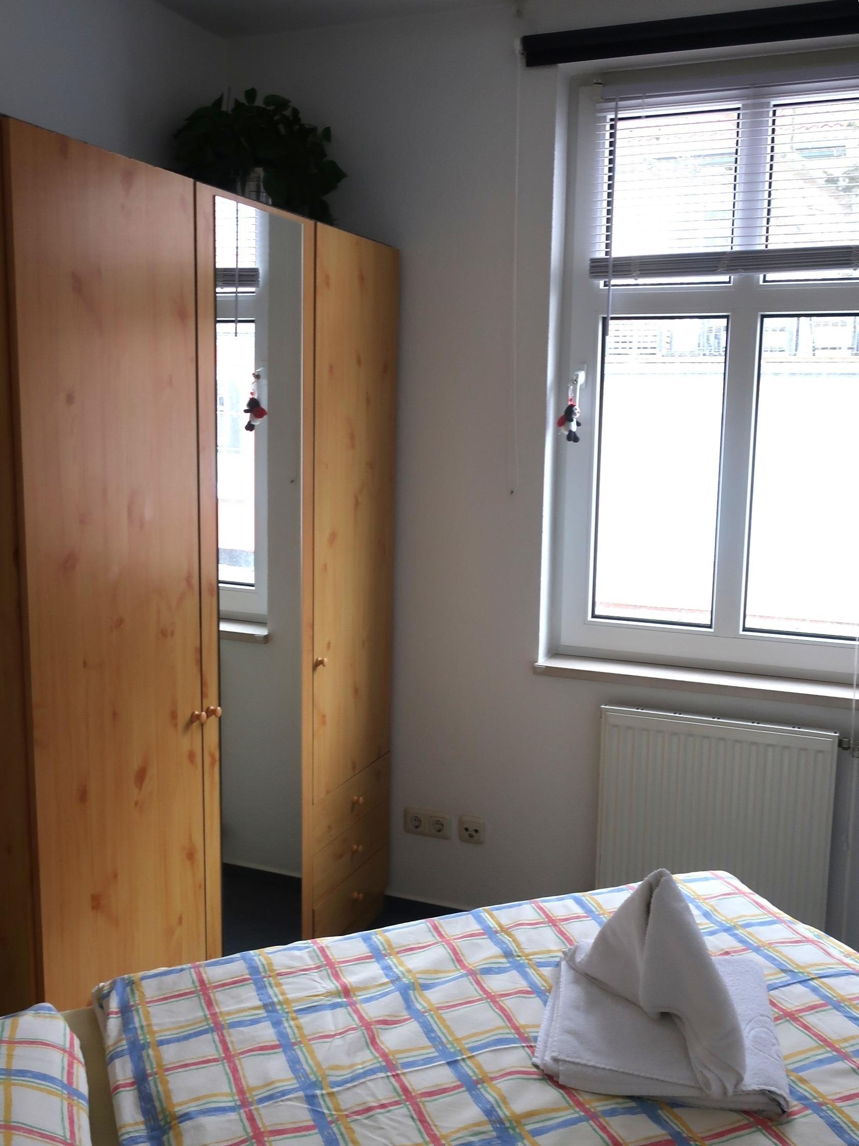 Im separaten Schlafzimmer befindet sich ein Doppelbett (180 cm x 200 cm) und ein Kleiderschrank. Das Bad ist mit einem Waschbecken, Toilette und Dusche ausgestattet. Seife und ein Fön sind vorhanden.