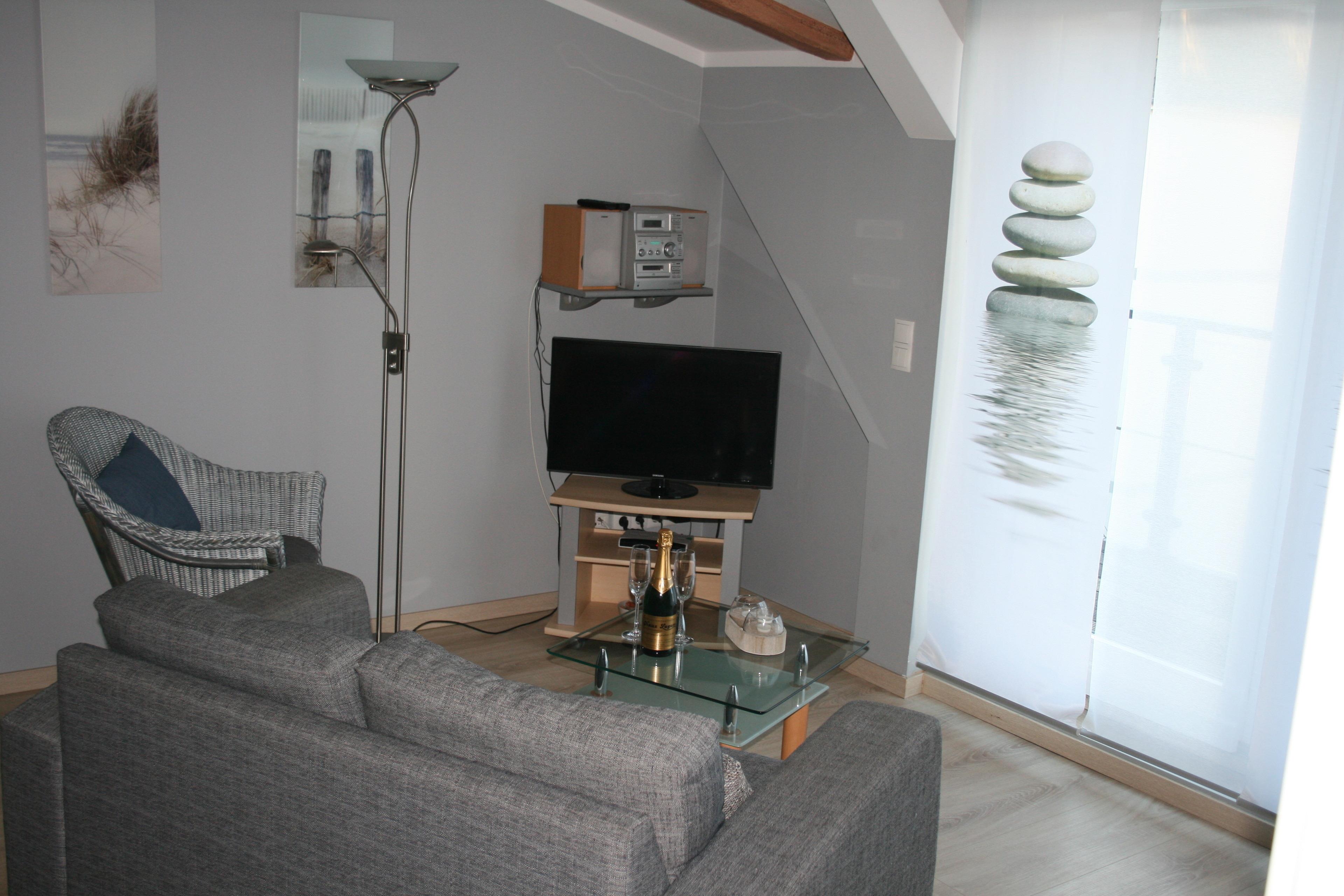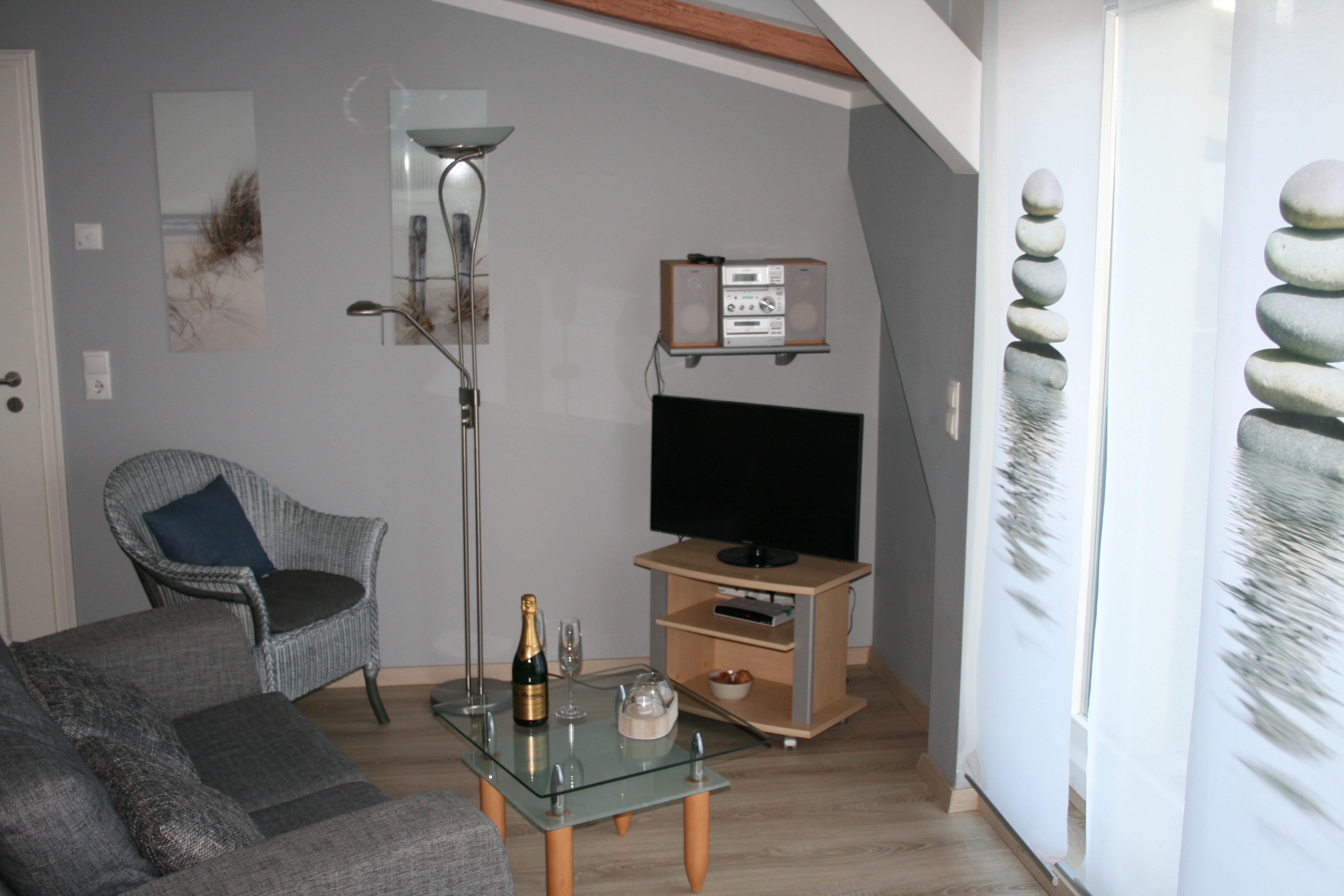 Das Wohnzimmer verfügt über eine gemütliche Sitzgruppe, eine Essecke und eine integrierte Küche (Geschirrspüler, Cerankochfeld, Mikrowelle, Backofen).