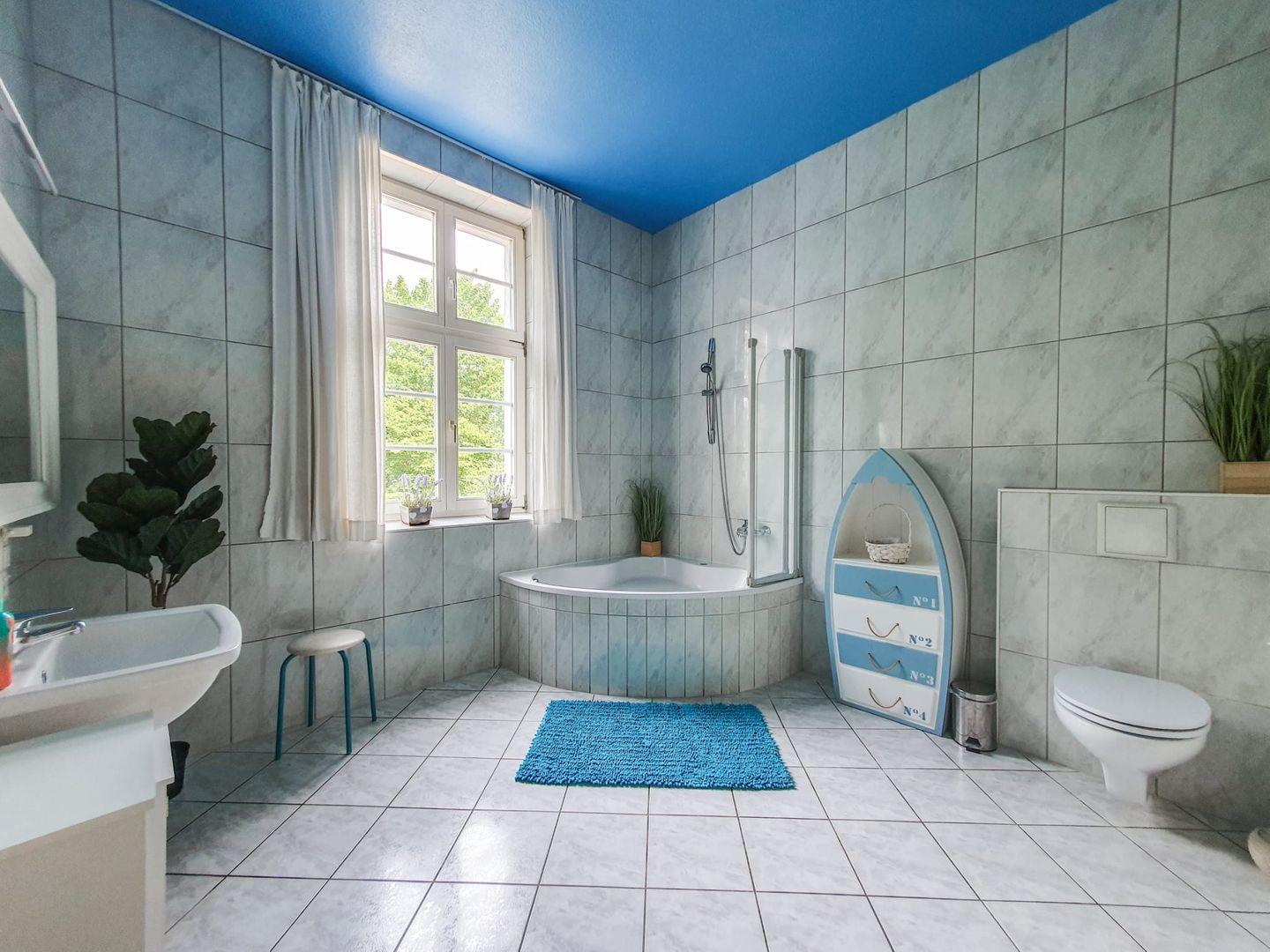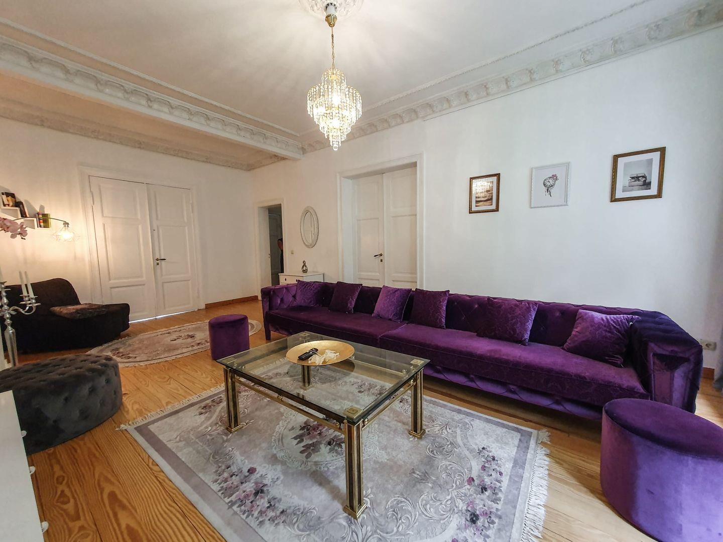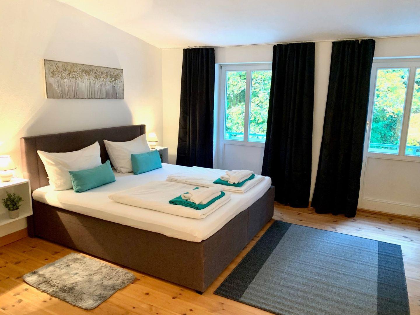 Über das große Treppenhaus gelangt man in die Hochparterre Wohnung. Die großzügig geschnittene Wohneinheit hat 150qm. Das luxuriöses Wohnzimmer mit einer großen Couch einem großen 75Zoll-Smart-TV mit Streamingdiensten, Kamin und einem Schlafsessel. Im Schlafzimmer finden Sie ein Himmelbett sowie einen wieteren Schlafsessel und einen eigenen großen möblierten Balkon mit Blick in den weitläufigen Garten.Weiterhin befindet sich ein kleines Schlafzimmer in der Einheit. Hier steht ein Etagenbett bereit. Das Badezimmer ist sehr großzügig geschnitten mit Eckbadewanne.