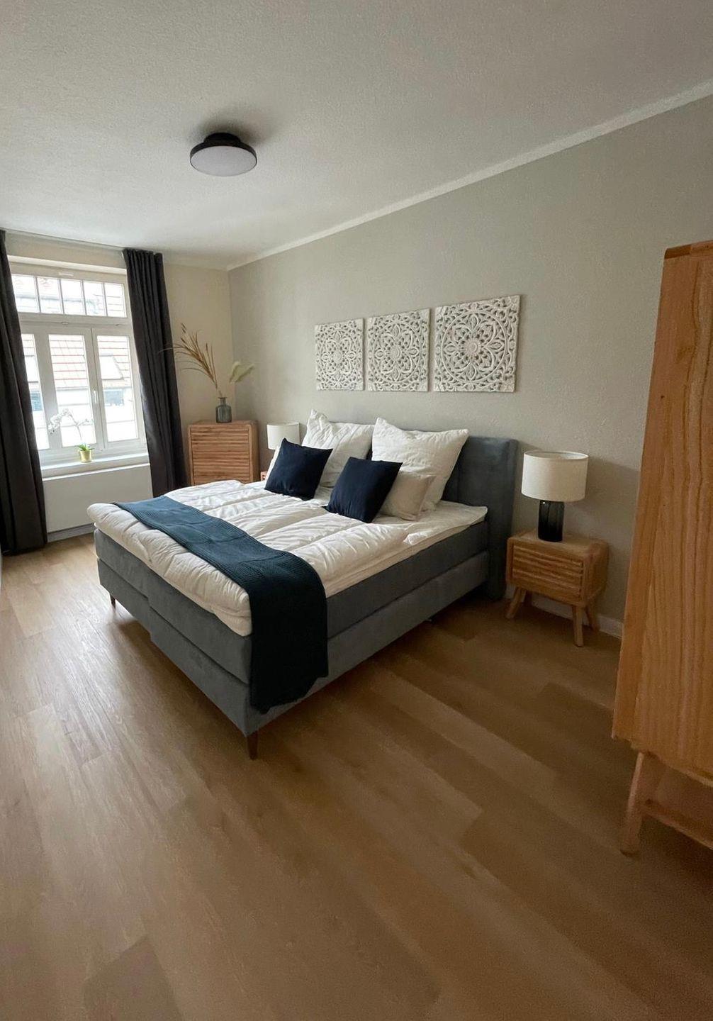 2 separate Schlafzimmer mit jeweils einen großen Kingszie-Boxspringbett lässt unsere Gäste bequem schlafen. Hier kann man die Nacht genießen.