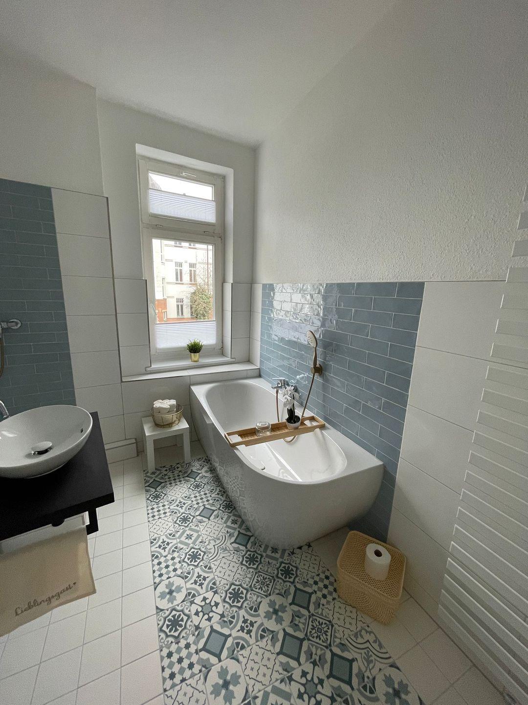 Im Tageslicht-Badezimmer finden Sie ine moderne Badewanne und eine extra Dusche. Neue Badmöbel im stilvollen Ambiente laden zu einem ausgiebigen Badevergnügen ein.