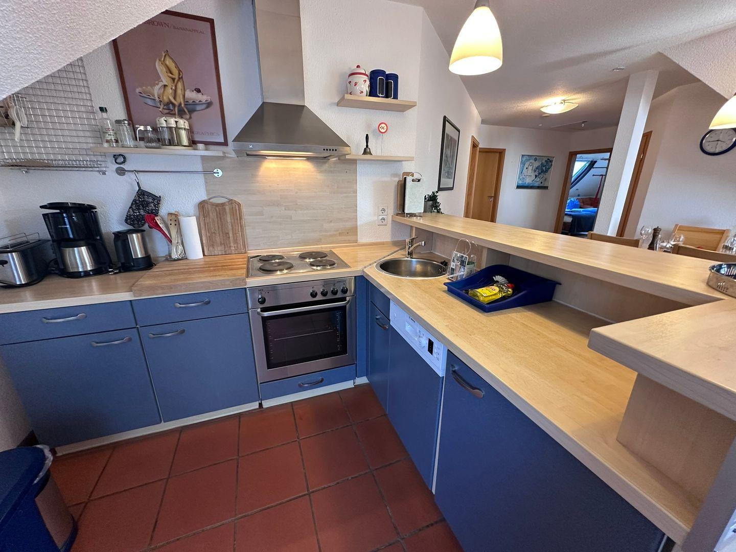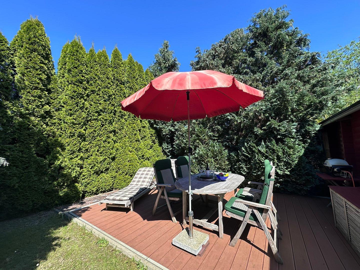 Die offene Küche ist mit hochwertigen modernen Geräten ausgestattet, darunter ein Herd mit Kochfeld, ein Elektrobackofen, eine Spülmaschine sowie eine Kaffeemaschine, Mikrowelle und Toaster. Küchenutensilien, Geschirr und Gewürze sind ebenfalls vorhanden, sodass Sie sich kulinarisch verwöhnen können. Die schöne Terrasse mit Gartenmöbeln und Grillplatz bietet direkt vor der Haustür die Möglichkeit, entspannte Stunden im Freien zu verbringen.