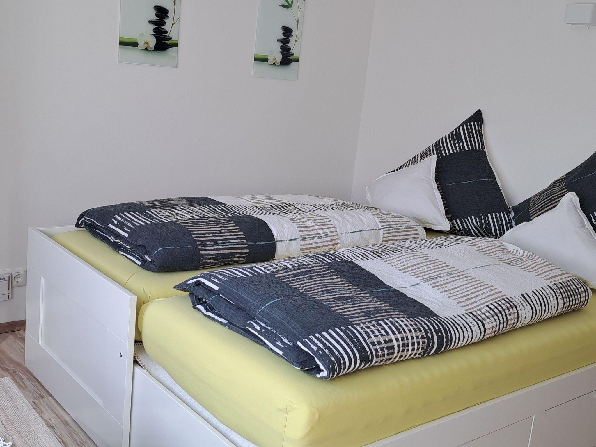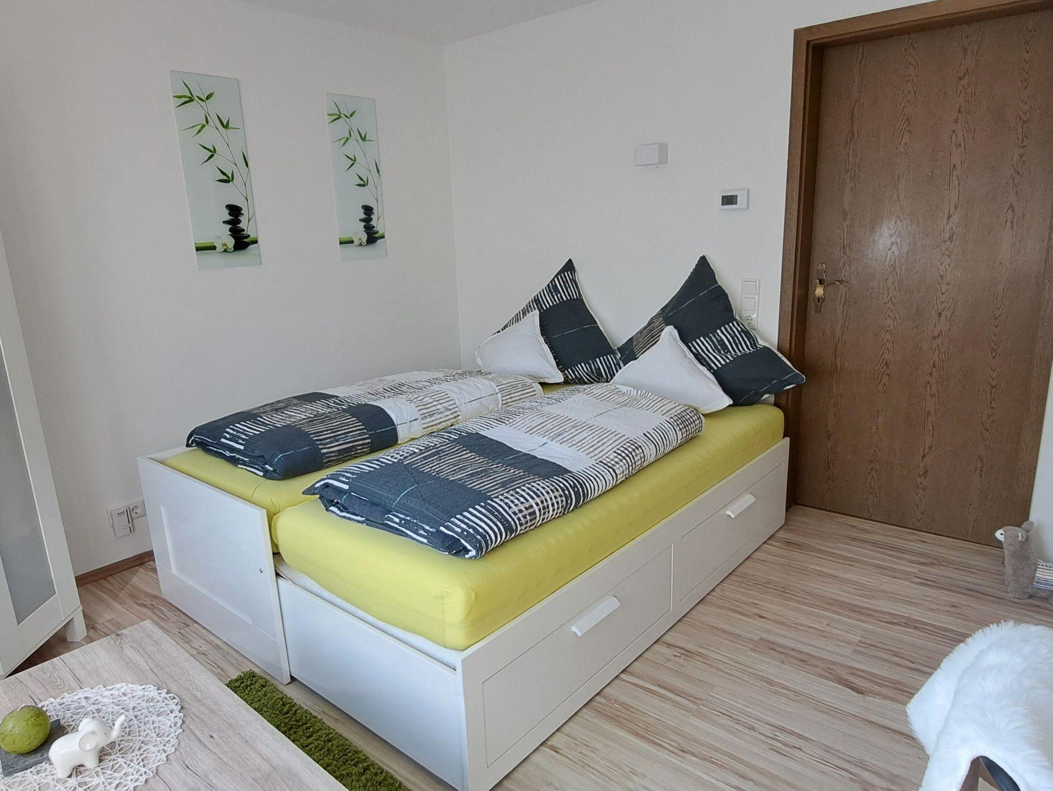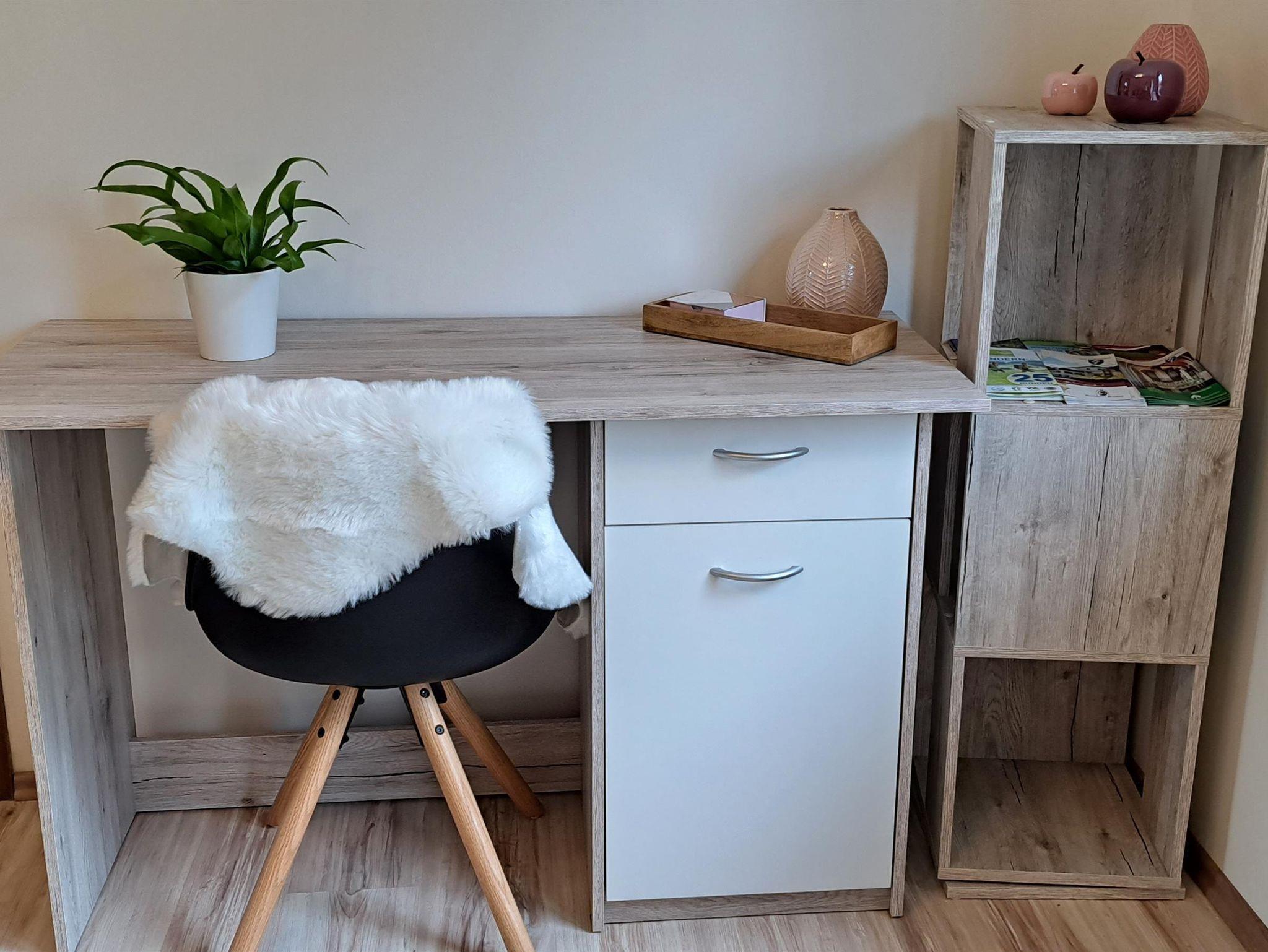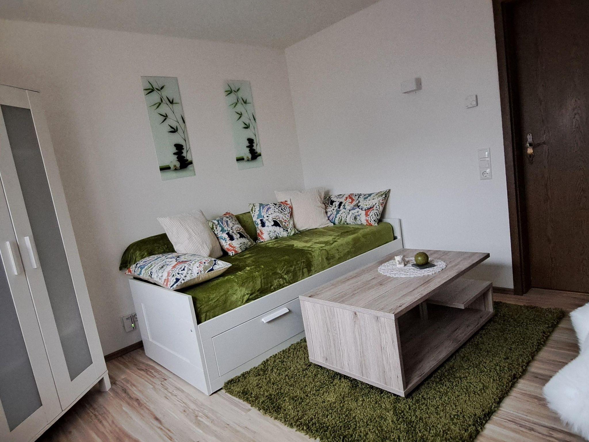 Das kleinere Schlafzimmer verfügt über ein Ausziehbett mit 2 Matratzen. Angrenzend befindet sich das Gäste WC, daher müssen die Gäste nicht durch das andere Schlafzimmer um zur Toilette zu gelangen. In diesem Zimmer befindet sich auch ein Schreibtisch, sodass die Ferienwohnung ideal geeignet ist, Urlaub und Arbeit zu verbinden (Workation im Westerwald).