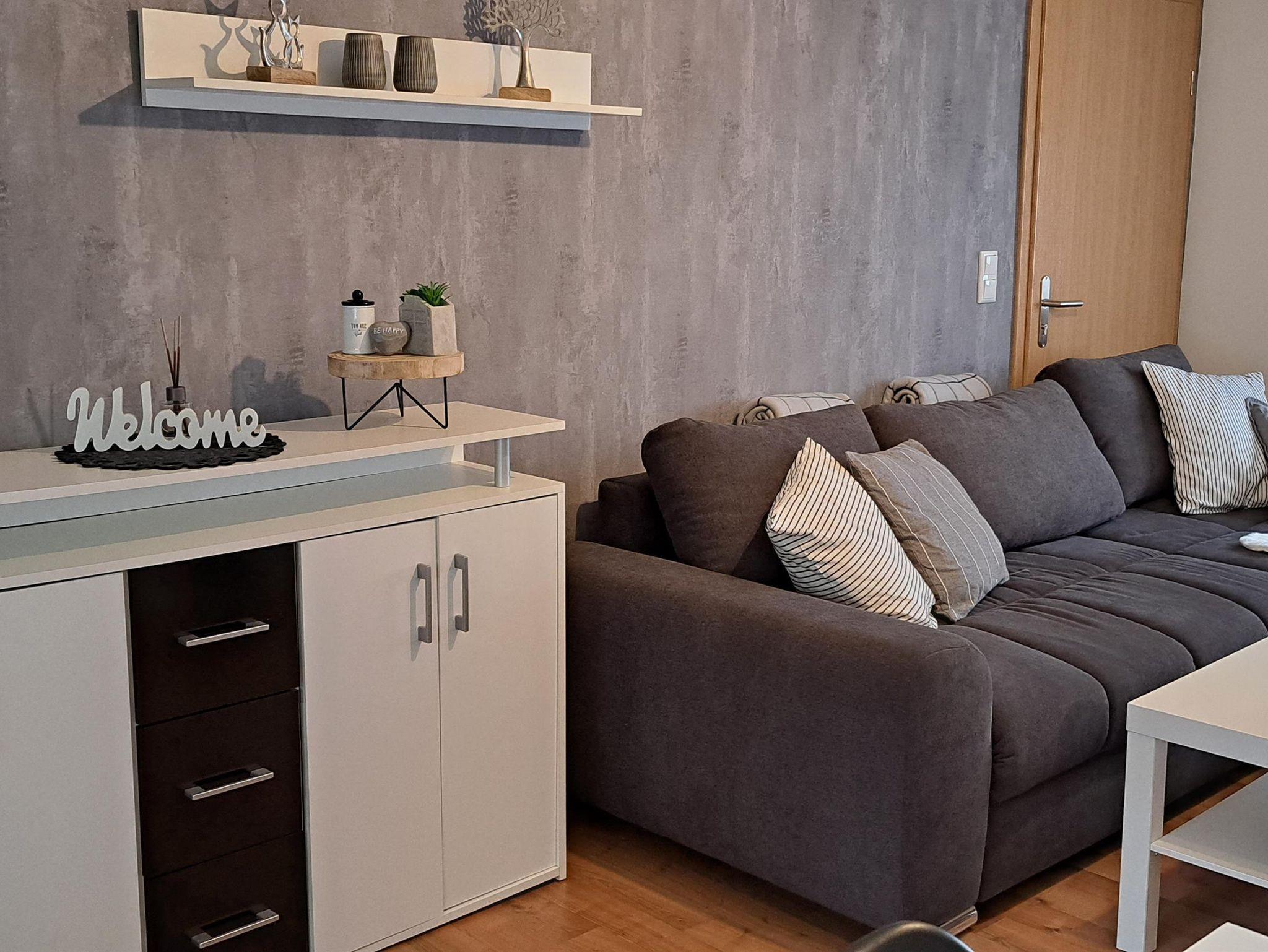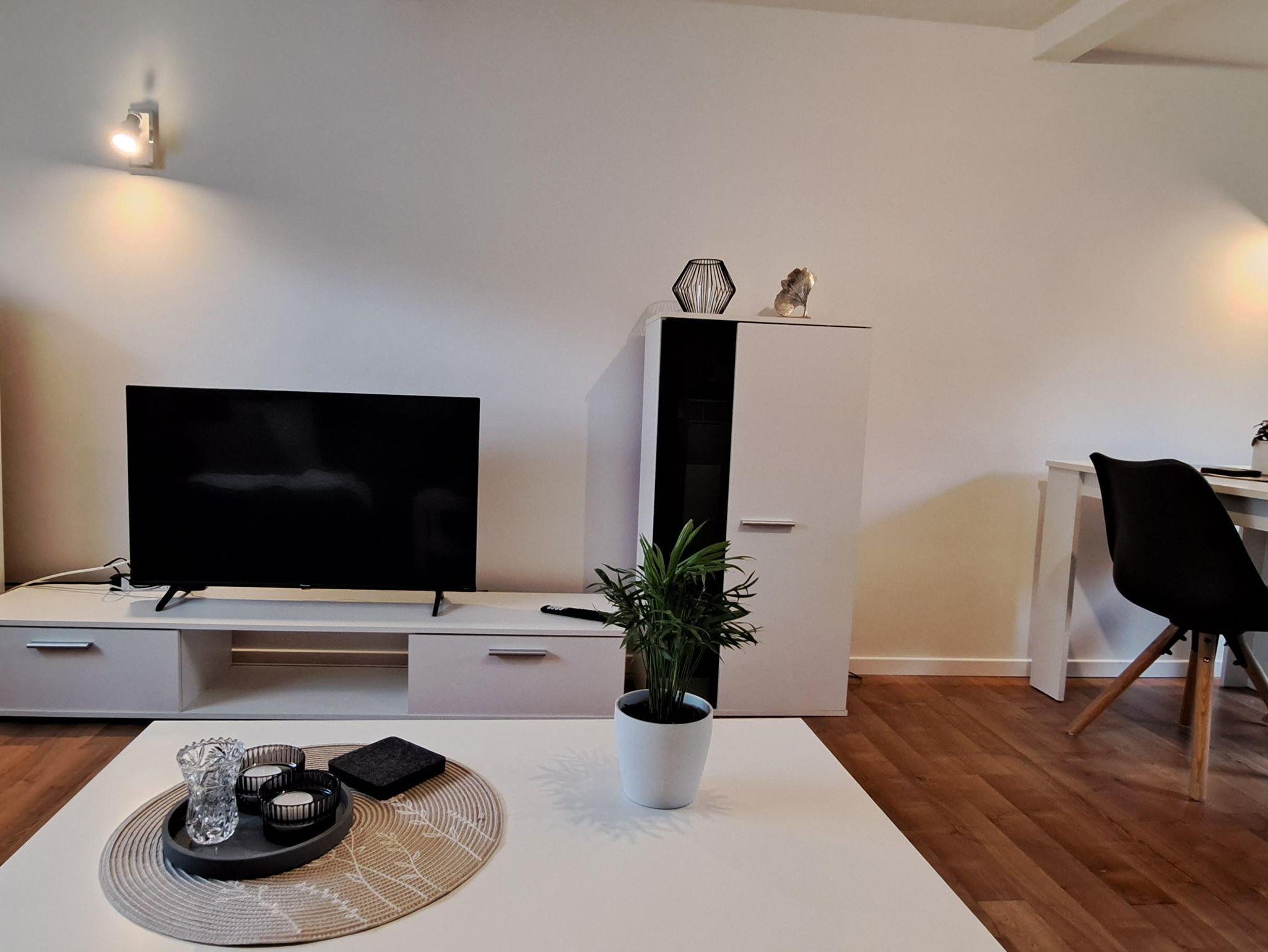Das Wohn- und Esszimmer verfügt über einen Smart TV, ein gemütliches Sofa wo bequem alle Urlauber Platz finden, und einen modernen Essbereich für gemeinsame Stunden.