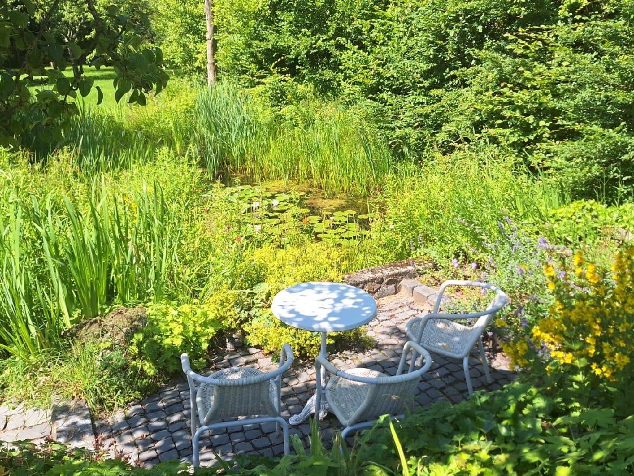 Der uneinsichtige Bauerngarten mit Teich, schönen Sitzplätzen und Feuerstelle schließt sich beiden Bereichen nach innen an und kann für Seminare und Retreats zum Entspannen in Natur und Ruhe oder auch für morgendliches TaiChi oder Yoga genutzt werden.