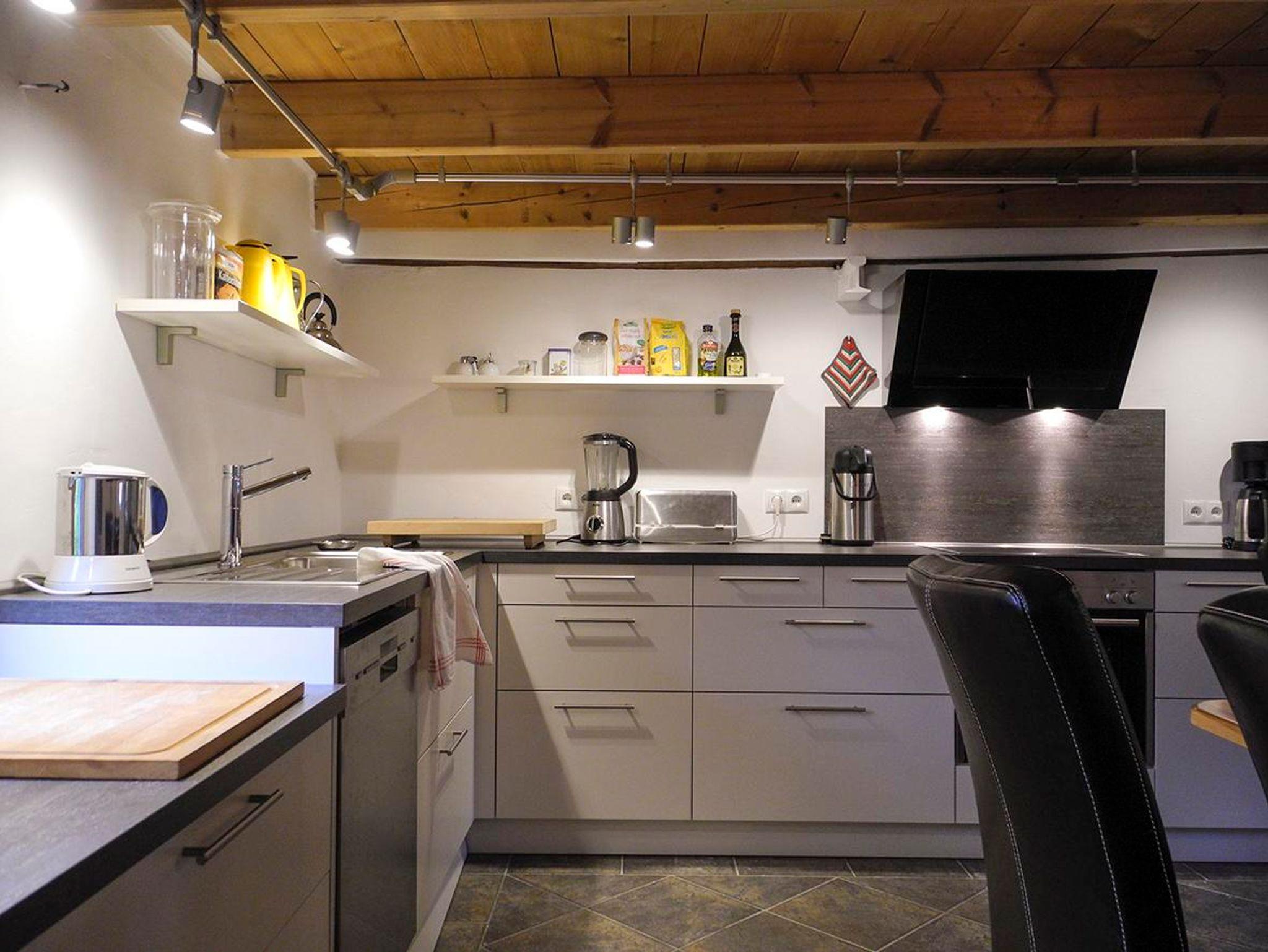 Die Gemeinschaftsküche mit Aufenthaltsbereich im Erdgeschoss, die bei Seminaren für die Versorgung durch eine Köchin oder in jedem Fall für die Selbstversorgung mit gebucht und genutzt werden kann, betritt man durch eine Glasmetalltür. Die modern eingerichtete Küche mit Essplatz liegt zum Hof, der kleine Aufenthaltsbereich zum Vorgarten und hat eine angrenzende, überdachte Terrasse nach vorne hin.