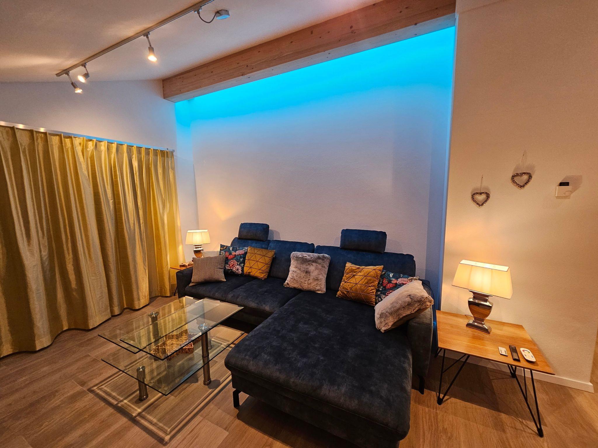 - couch with ottoman, RGB ambient lighting, 55" Smart TV with Magenta TV,