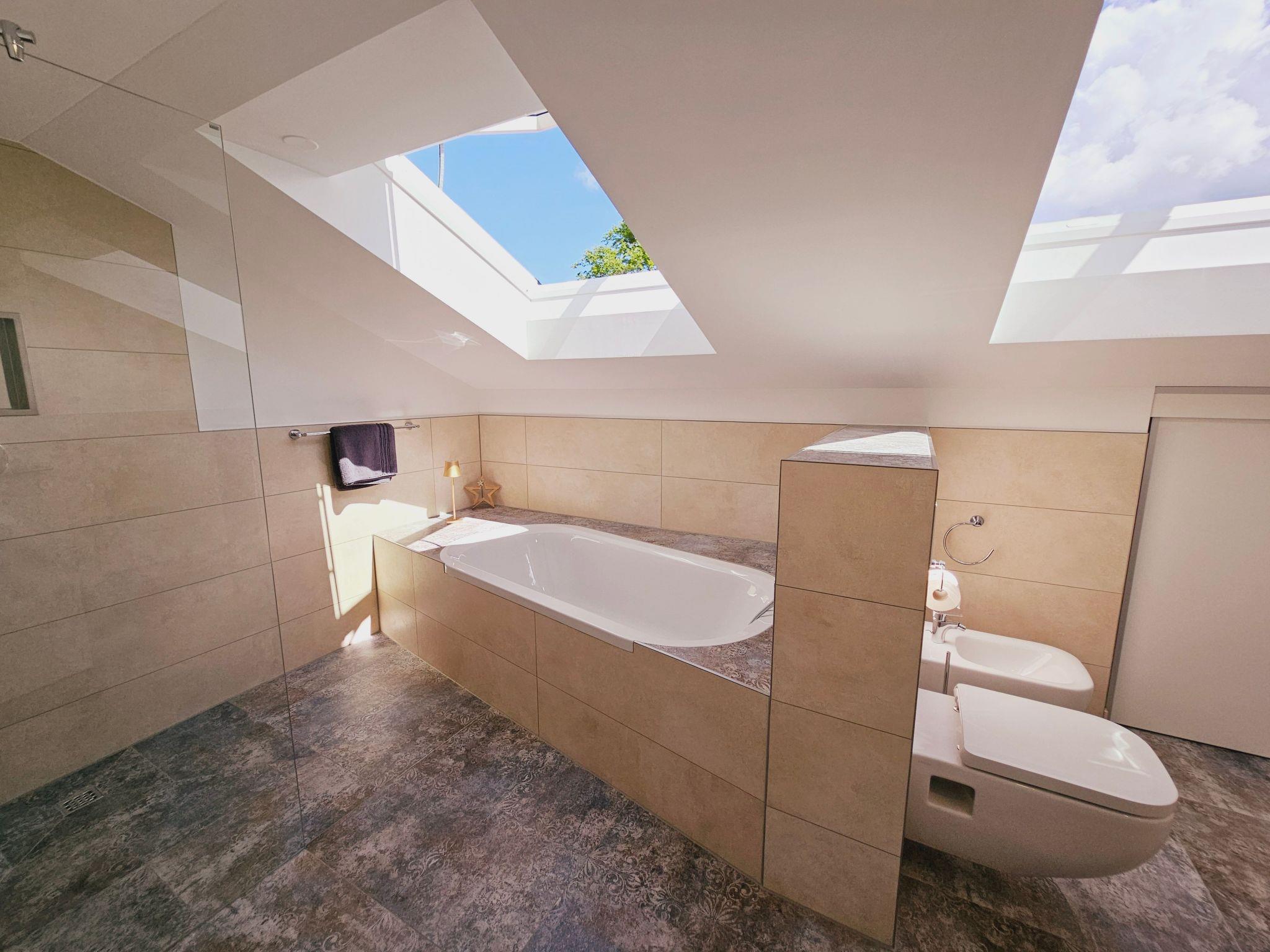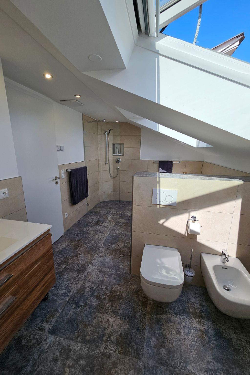 - Bathroom with walk-in shower, bathtub (1.80m x 0.90m), bidet, WC, wider