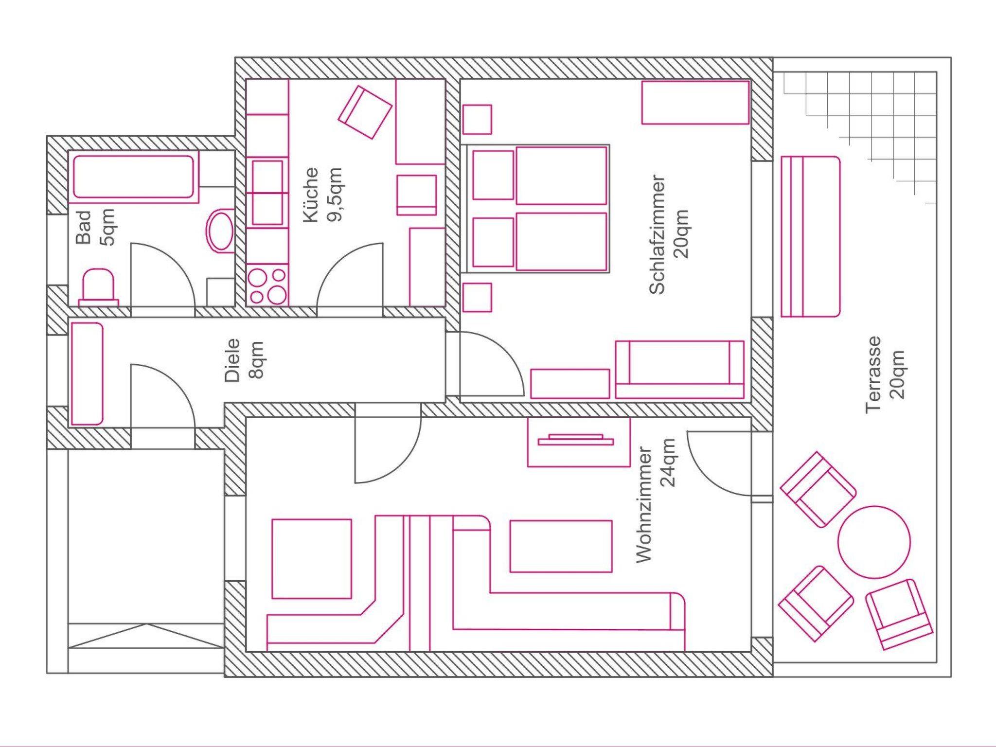 The beautiful 67m² holiday home is very well equipped and offers space for 2 people. In addition to the living/dining room, kitchen, bathroom and bedroom, it has a spacious 20m² covered south-facing terrace and the garden area directly in front of the holiday flat can be used as a sunbathing lawn.