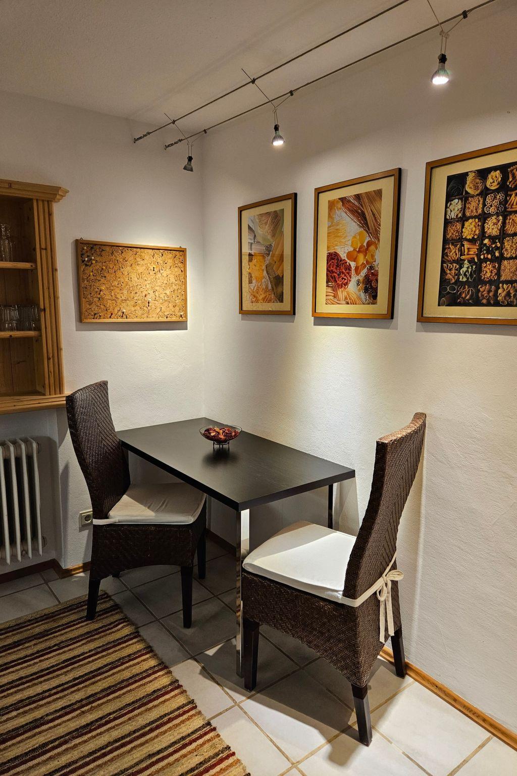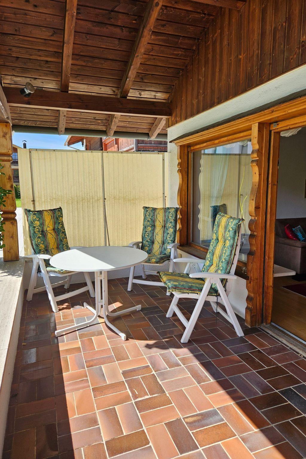 The country house bungalow is furnished in a cosy Bavarian style; for example, the living/dining room has a dining area with corner bench and typical Bavarian jogging table. Adjacent to the living room is the 20m² south-facing terrace and the garden area with cosy seating and loungers. Here you can have breakfast outside in the morning or simply relax in comfort.