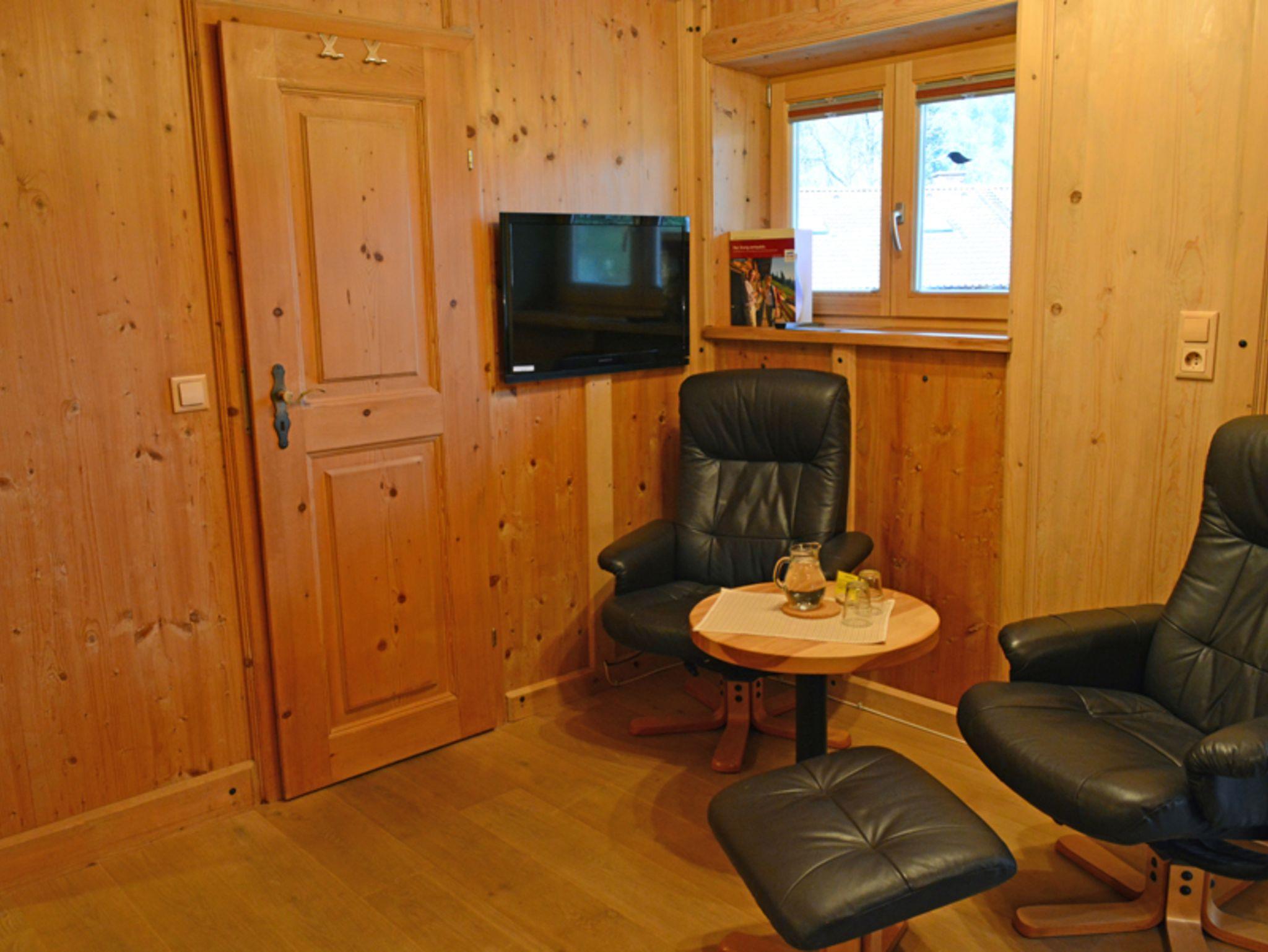 Im Zimmer sorgt ein Eichenboden für warme Füße und in den 2 Leder-Relaxsessel liest sich die Tageszeitung oder das gute Buch viel entspannter. Als Zuckerl wurde auch noch das Bett erhöht und so haben die Koffer auch gleich ihren Platz.
