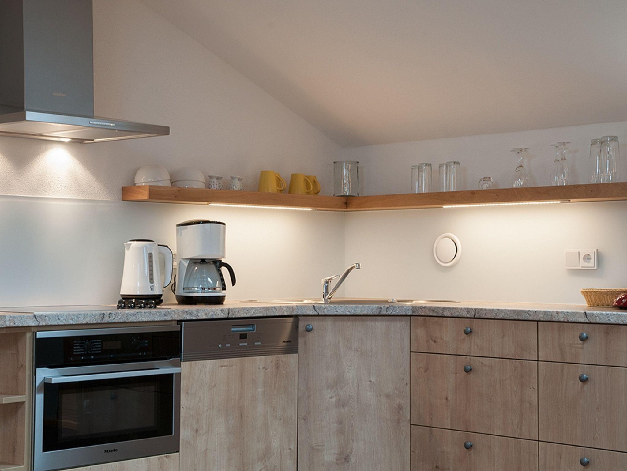 • Küche mit Miele-Geräten (Spülmaschine, Backofen, Mikrowelle), Senseo-Kaffeemaschine und Filterkaffeemaschine