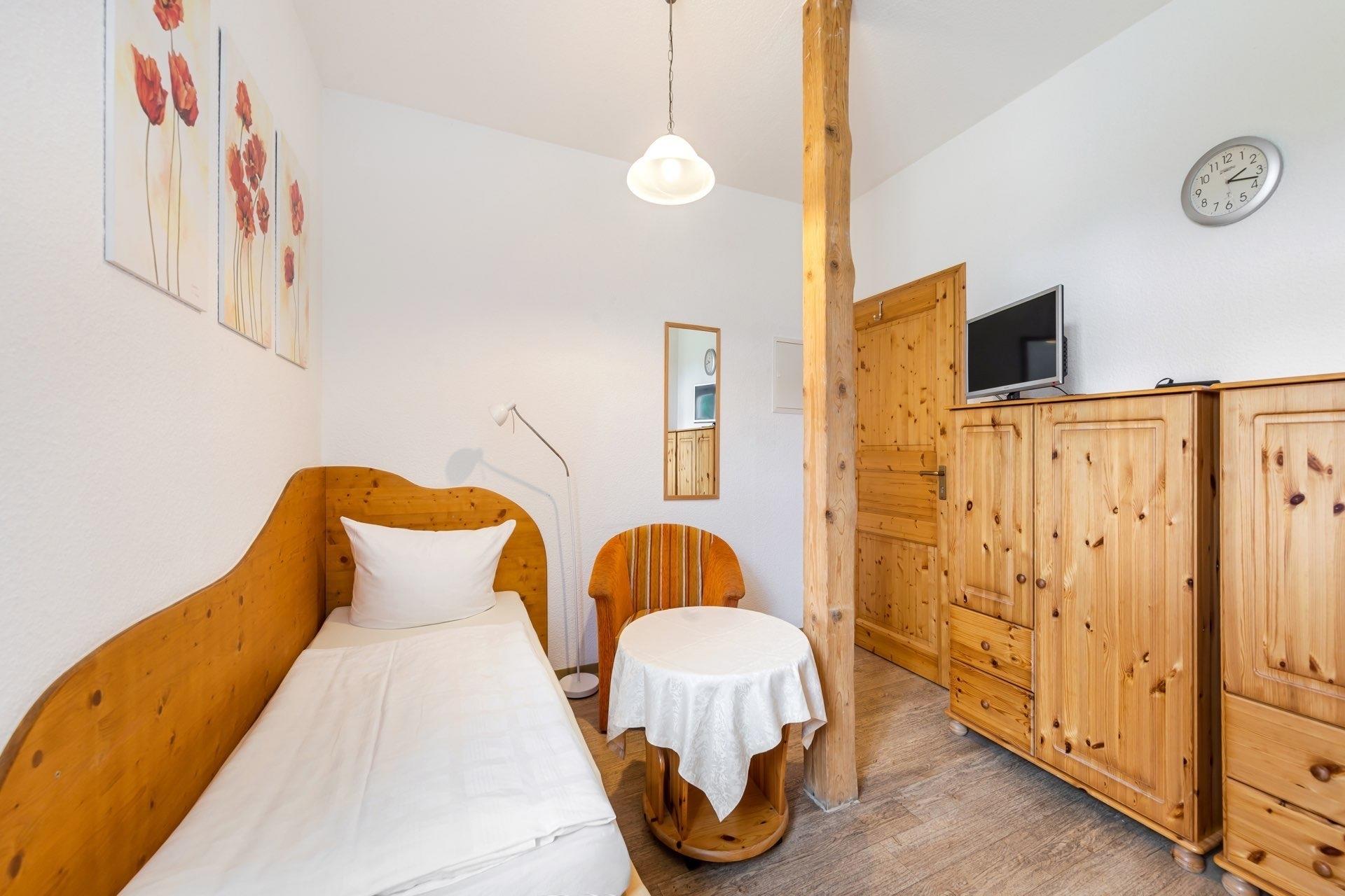 Perfekt für alleinreisende Urlauber oder geschäftlich Reisende. Das gemütliche 14 m² große Zimmer bietet ein Einzelbett (90 * 200 cm). Eine Miniküche mit 2 Herdplatten, Geschirr und einem Essplatz. Das Bad bietet Dusche/WC. Das Zimmer ist über eine Treppe erreichbar. Frühstück kann hinzugebucht werden.
