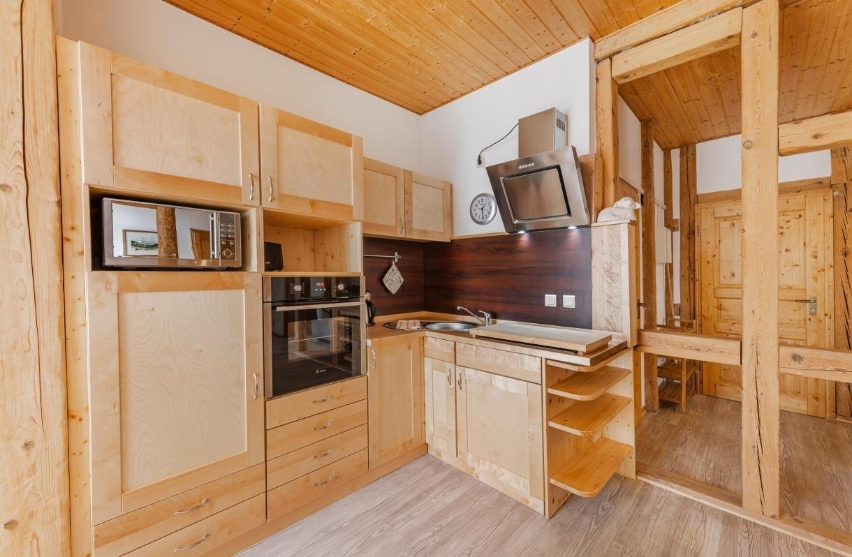 Küchenzeile mit Spüle, Geschirr, Kühlschrank, 2 Herdplatten