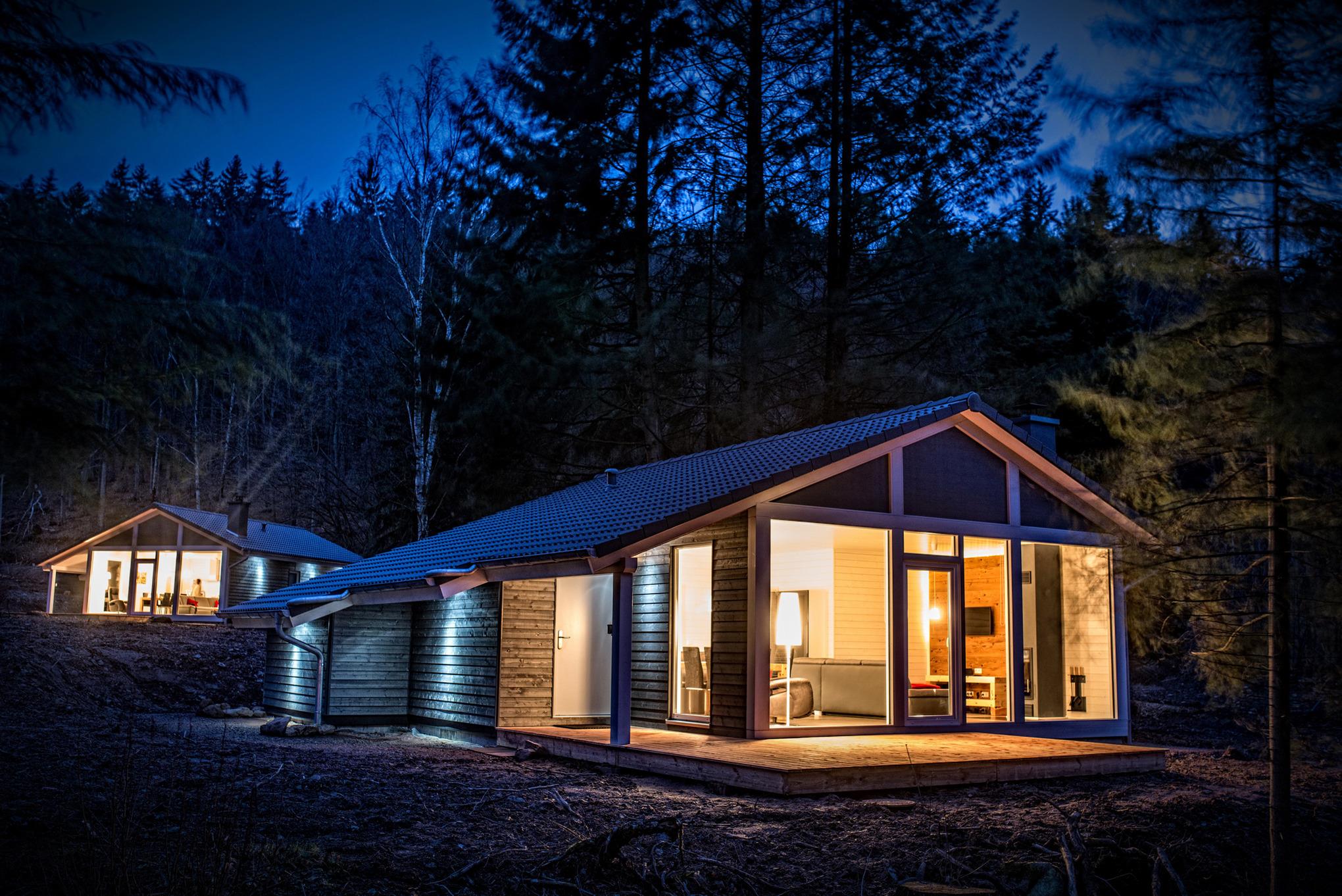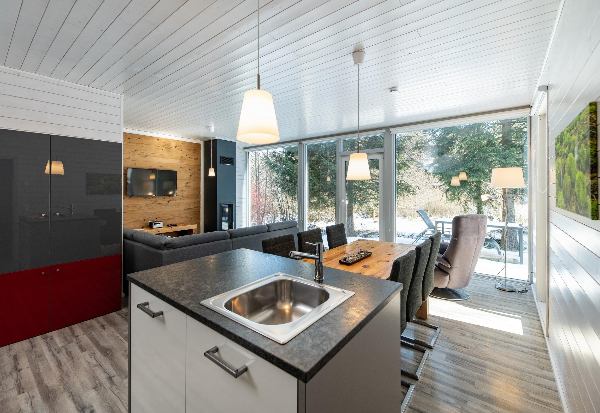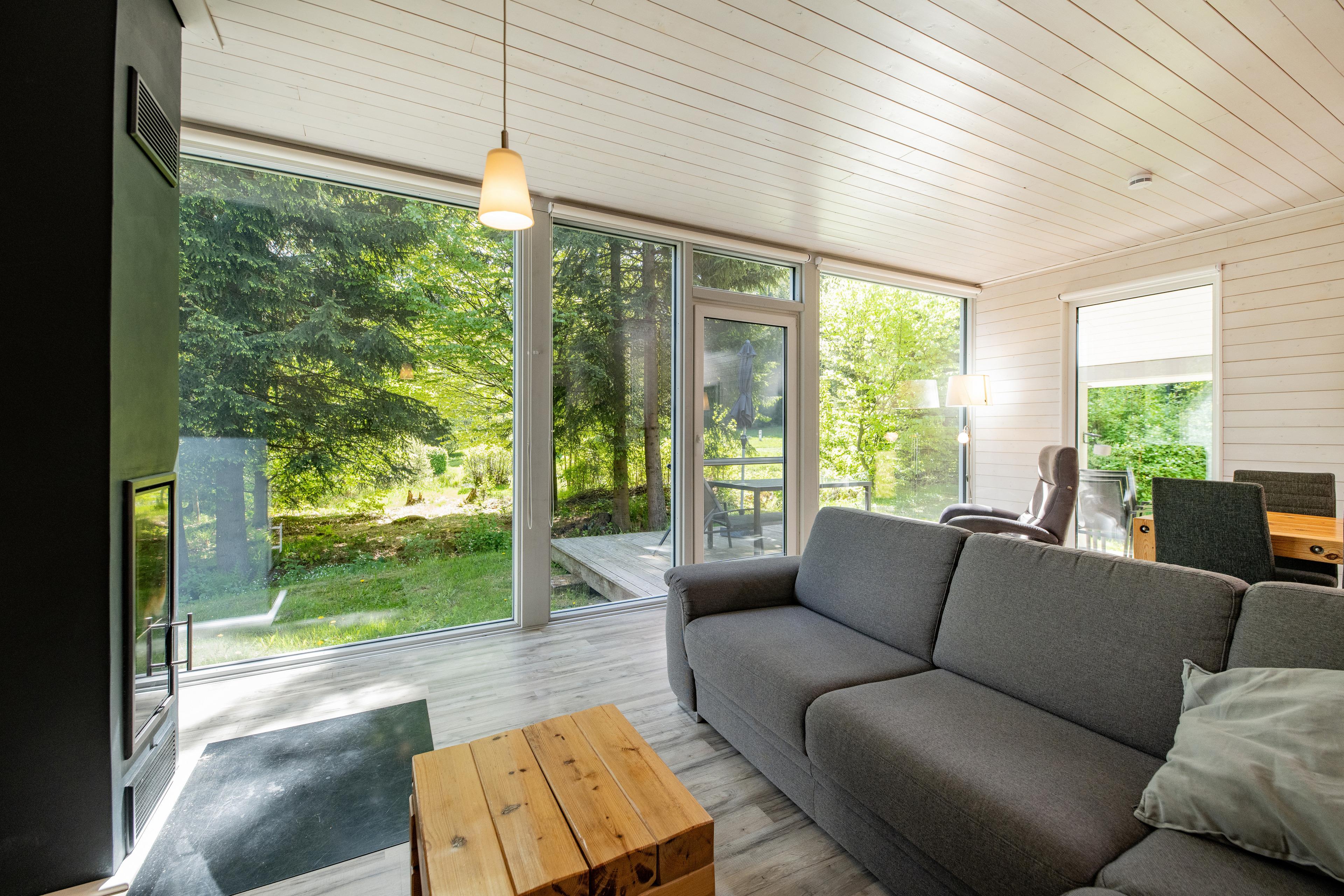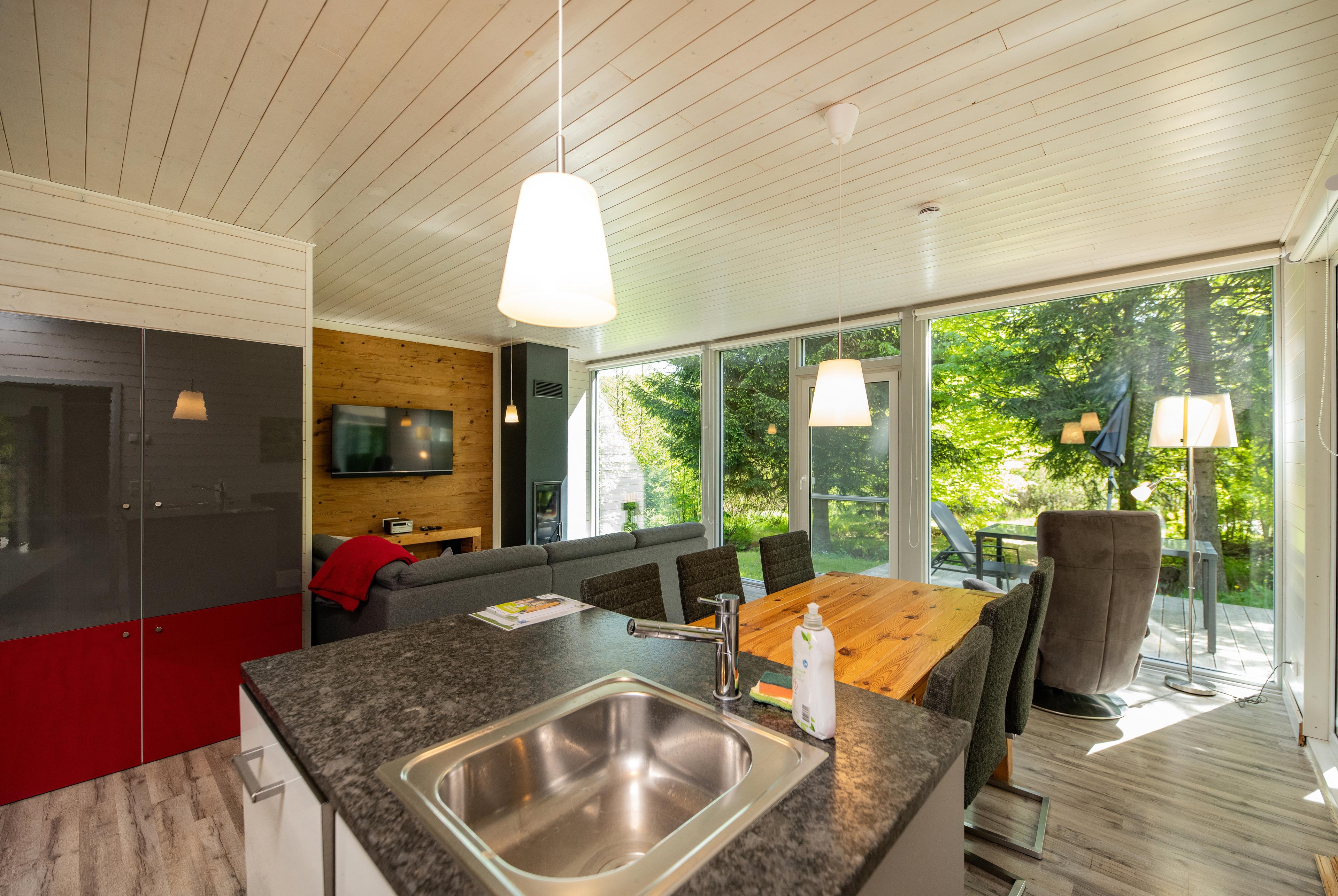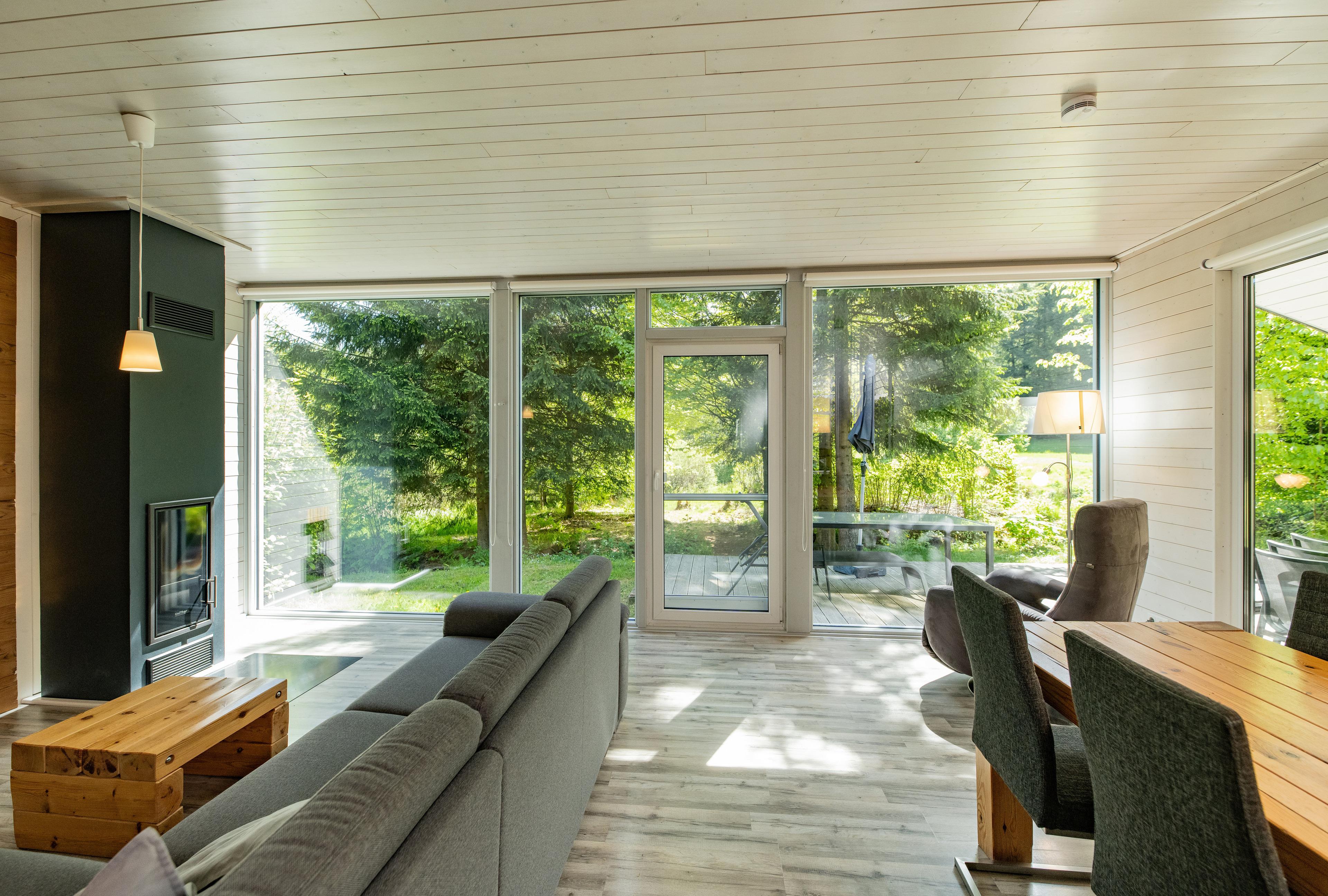 Das Ferienhaus mit einem lichtdurchluteten offenen Wohn- und Küchenbereich, zwei Schlafzimmern und einem Wellness-Bad mit Sauna bietet Ihnen auf 70 Quadratmetern ausreichend Platz für 4 Personen. Die 7 Meter breite Glasfront lässt die Natur beim Essen oder Relaxen teilhaben. In der kalten Jahreszeit vollendet das knisternde Kaminfeuer das Urlaubsfeeling.