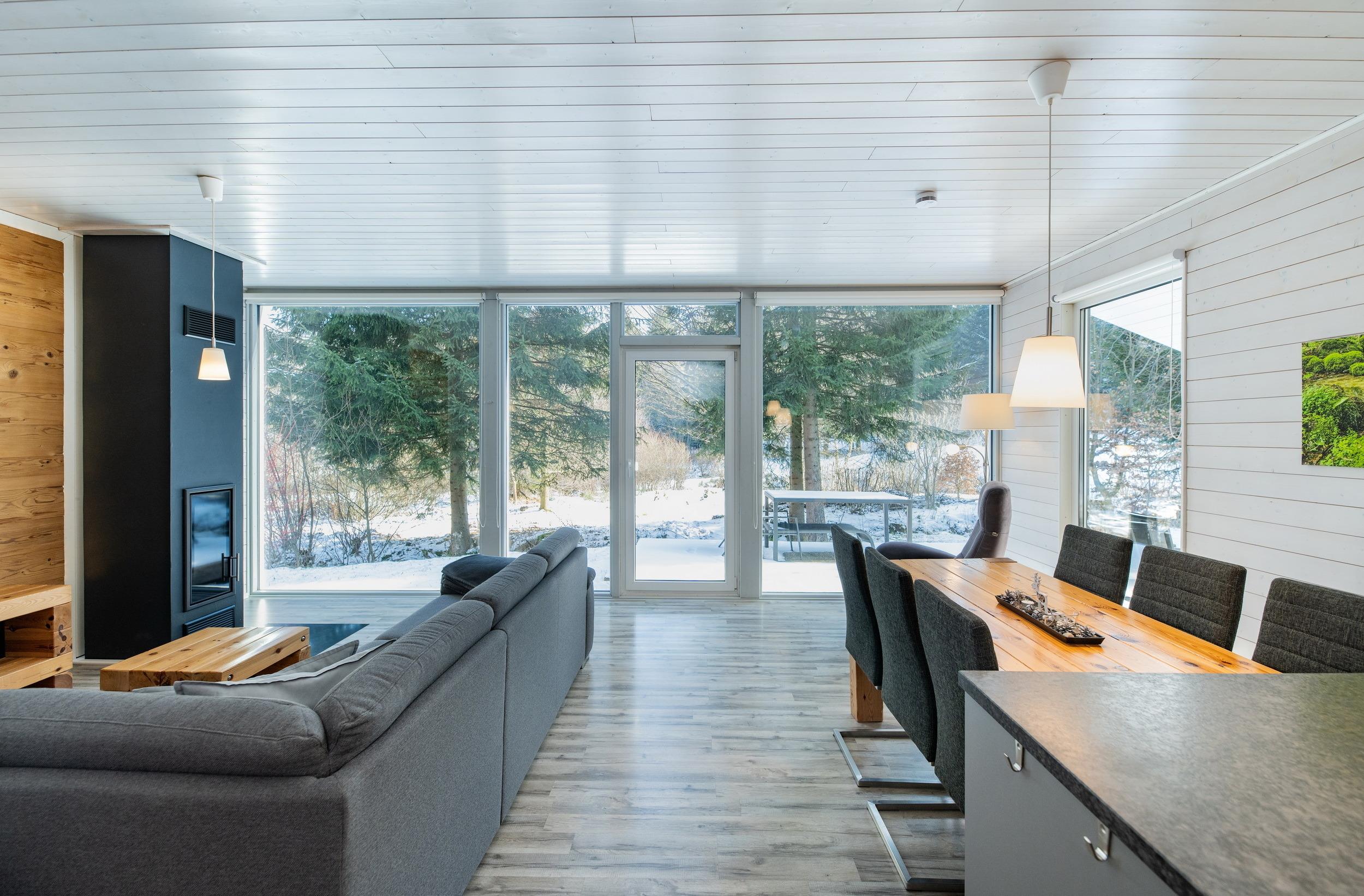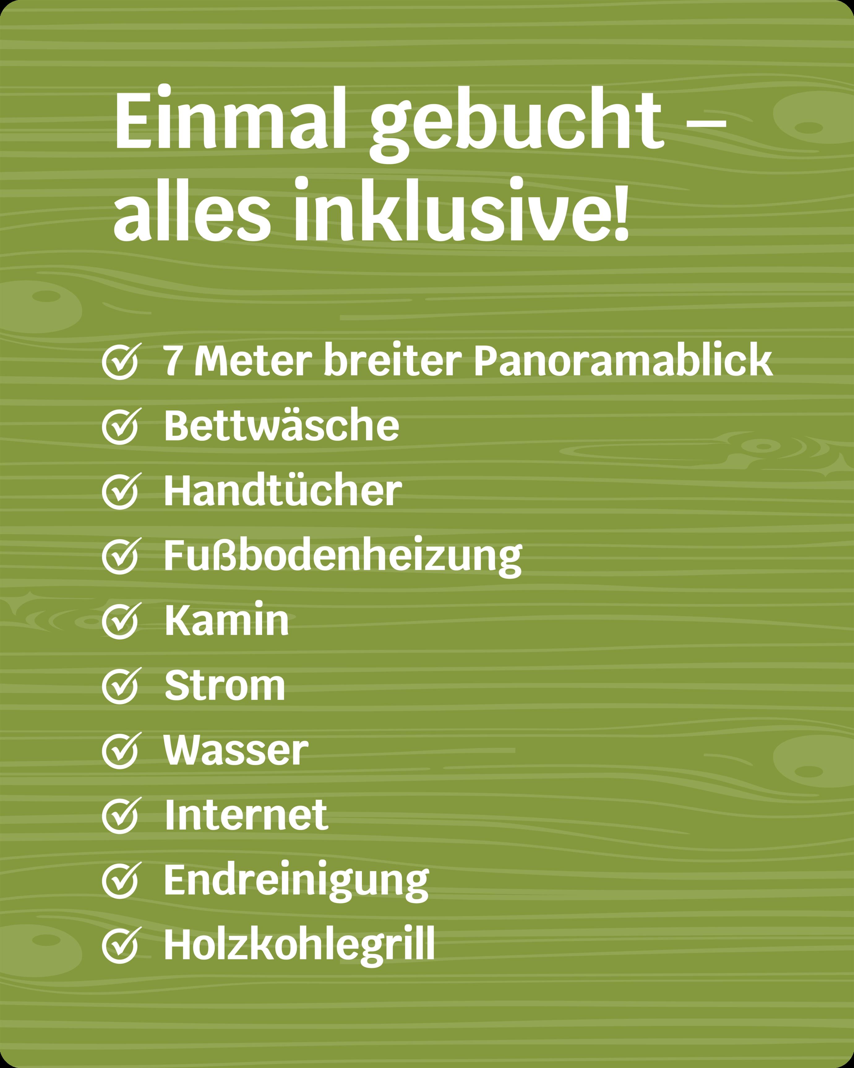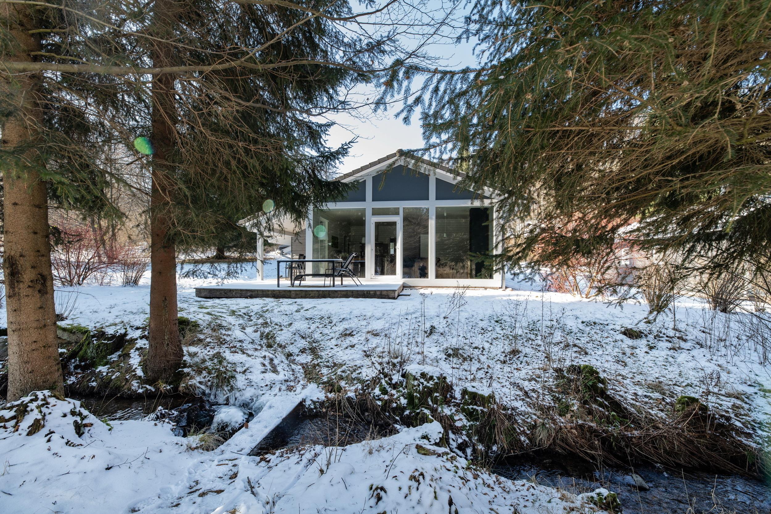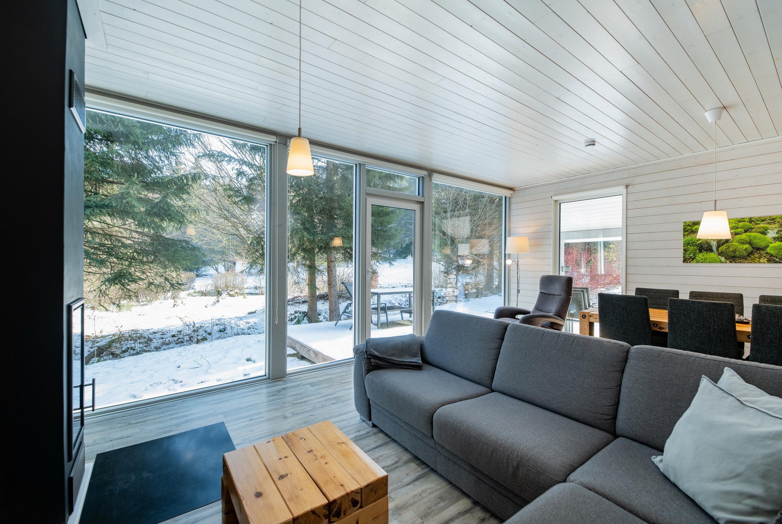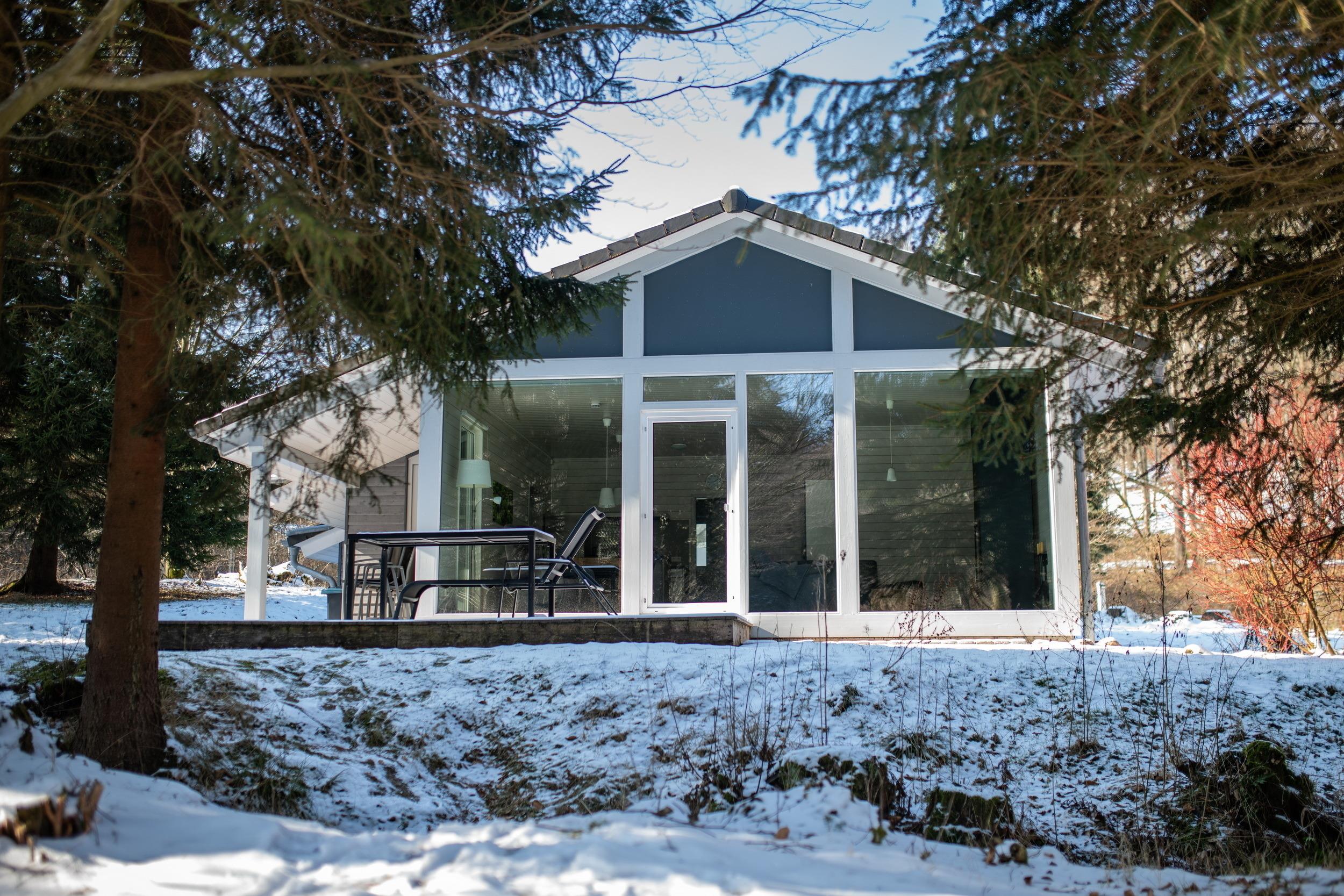 Das Ferienhaus mit einem lichtdurchluteten offenen Wohn- und Küchenbereich, zwei Schlafzimmern und einem Wellness-Bad mit Sauna bietet Ihnen auf 70 Quadratmetern ausreichend Platz für 4 Personen. Die 7 Meter breite Glasfront lässt die Natur beim Essen oder Relaxen teilhaben. In der kalten Jahreszeit vollendet das knisternde Kaminfeuer das Urlaubsfeeling.