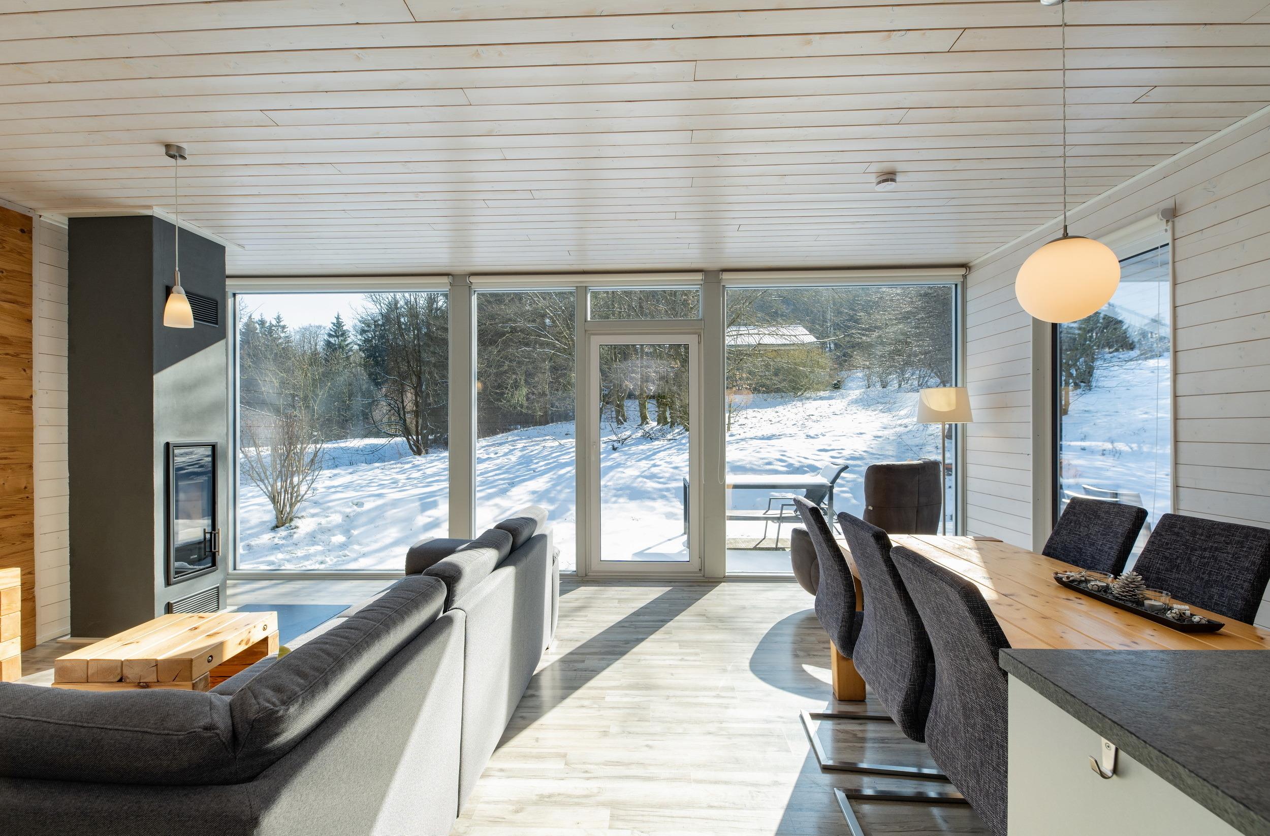 Das Ferienhaus mit einem lichtdurchluteten offenen Wohn- und Küchenbereich, zwei Schlafzimmern und einem Wellness-Bad mit Sauna bietet Ihnen auf 70 Quadratmetern ausreichend Platz für 4 Personen. Die 7 Meter breite Glasfront lässt die Natur beim Essen oder Relaxen teilhaben. In der kalten Jahreszeit vollendet das knisternde Kaminfeuer das Urlaubsfeeling.