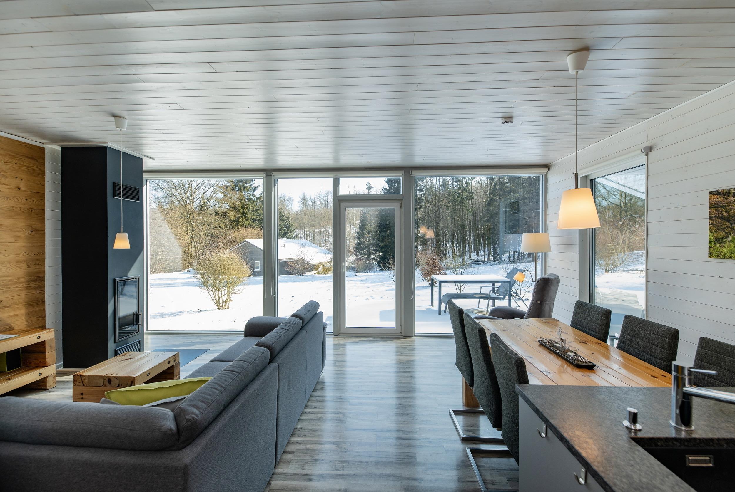 Das Ferienhaus mit einem lichtdurchluteten offenen Wohn- und Küchenbereich, zwei Schlafzimmern und einem Wellness-Bad mit Sauna bietet Ihnen auf 70 Quadratmetern ausreichend Platz für 4 Personen. Die 7 Meter breite Glasfront lässt die Natur beim Essen oder Relaxen teilhaben. In der kalten Jahreszeit vollendet das knisternde Kaminfeuer das Urlaubsfeeling.