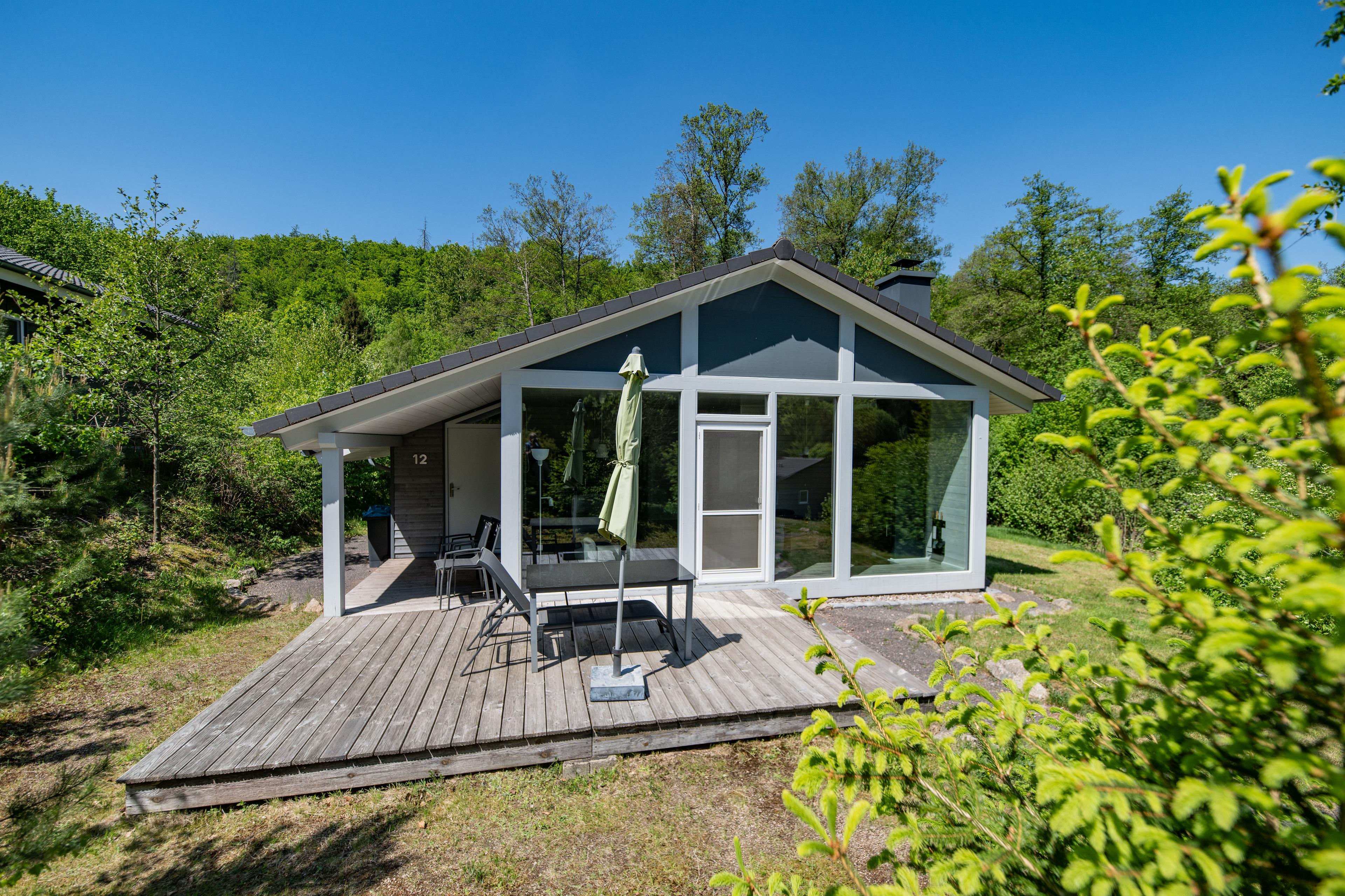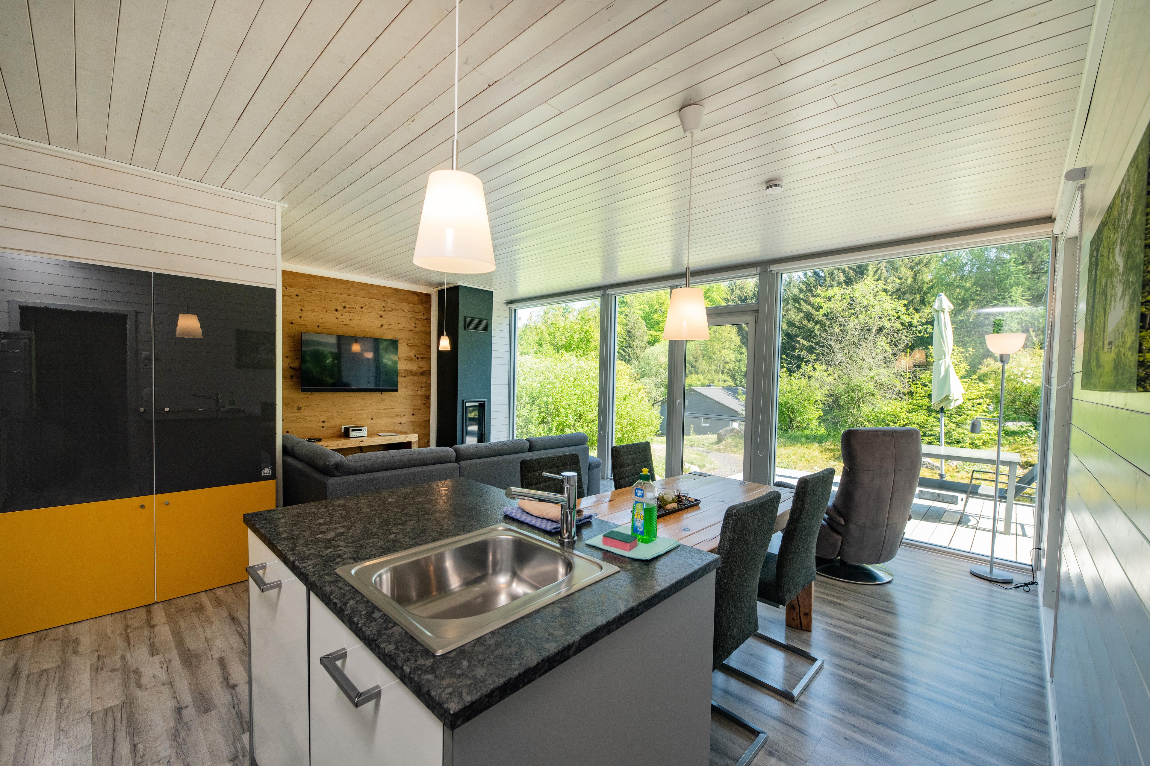 Das Ferienhaus mit einem lichtdurchfluteten offenen Wohn- und Küchenbereich, einem Schlafzimmer und einem Wellness-Bad mit Sauna bietet Ihnen auf 61 Quadratmetern großzügigen Platz für 2 Personen. Die 7 Meter breite Glasfront lässt die Natur beim Essen oder Relaxen teilhaben. In der kalten Jahreszeit vollendet das knisternde Kaminfeuer das Urlaubsfeeling.
