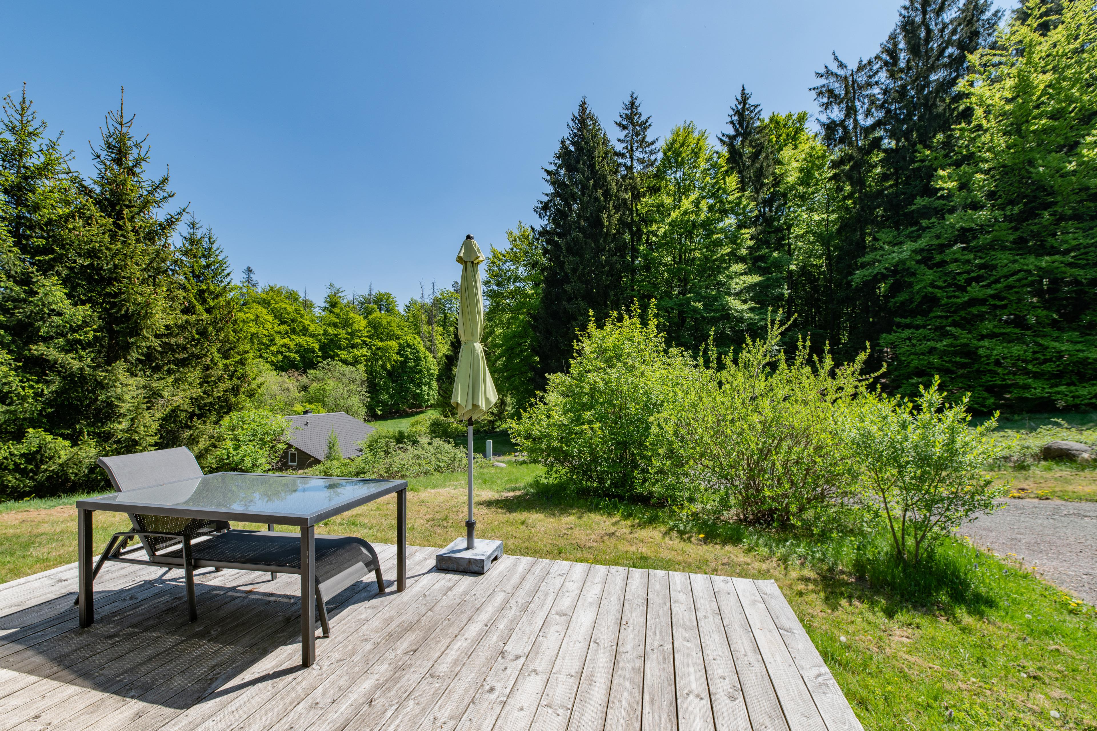Der Wohnbereich mit einer bequemen Couch bietet Ihnen einen freien Blick in die Natur, aber auch auf den Kaminofen und den Fernseher. Zur medialen Unterhaltung stehen außerdem ein DVD Player und eine Mini-Musikanlage mit zur Verfügung. SAT-Anschluß und Internet runden das technische Angebot ab.