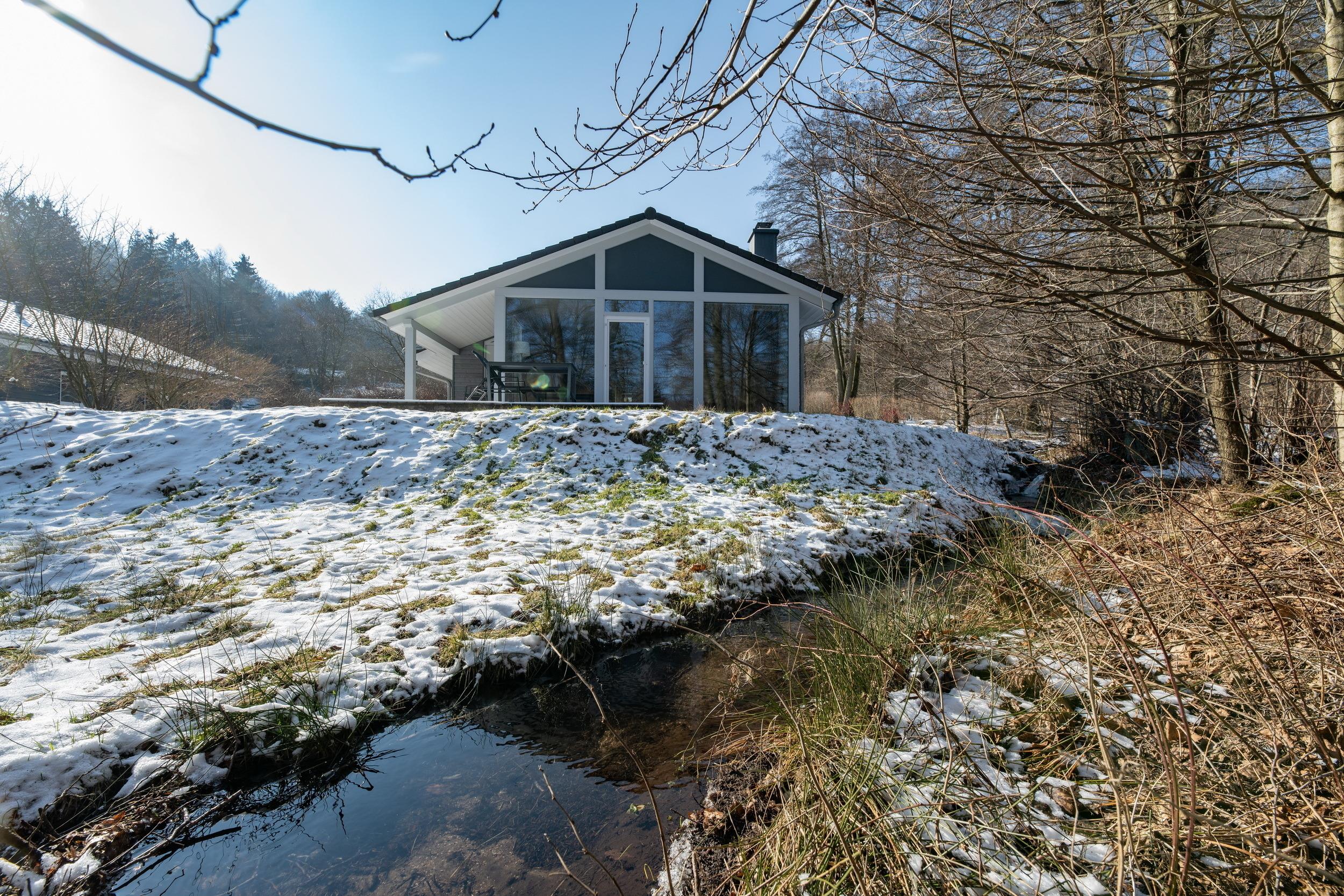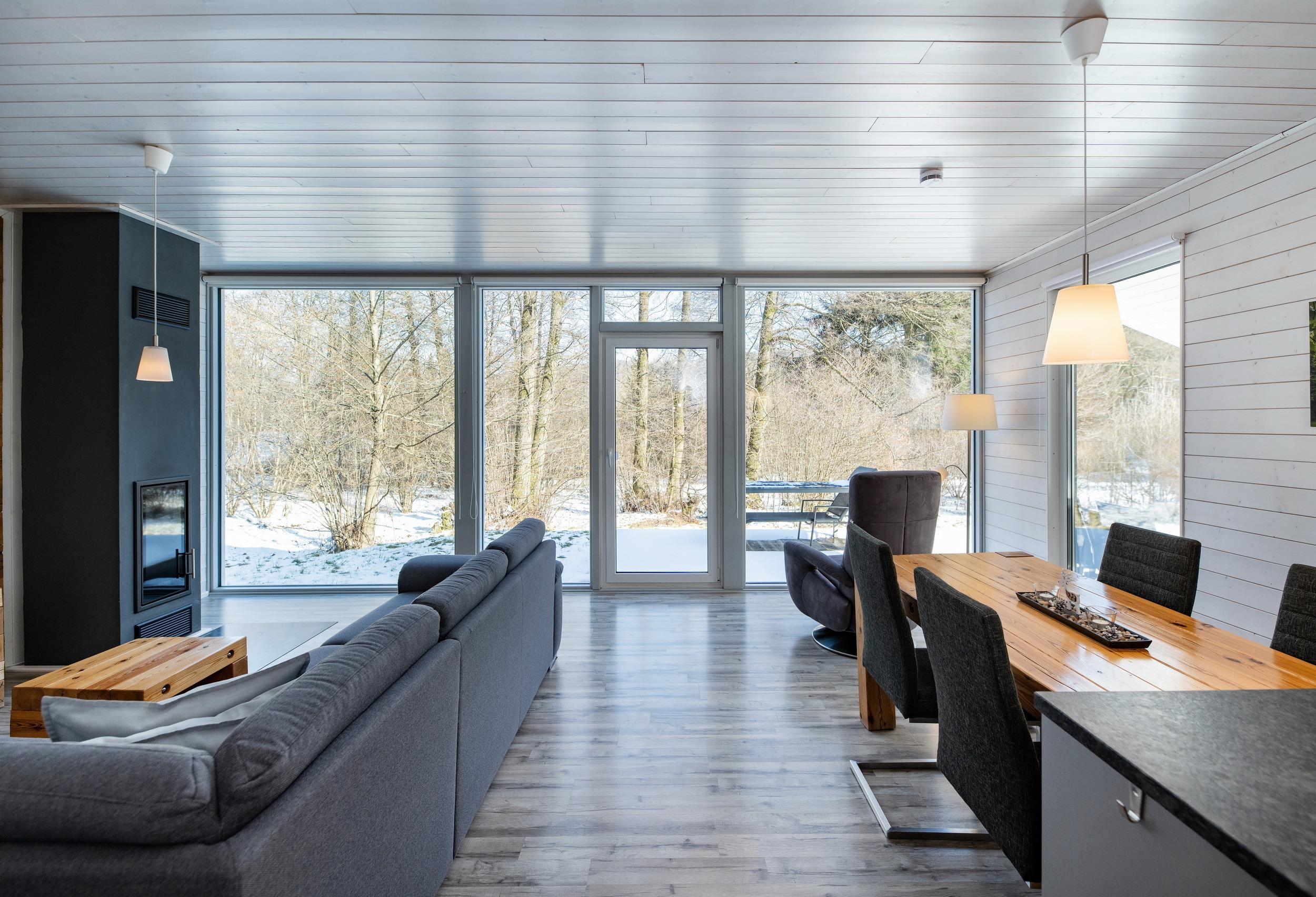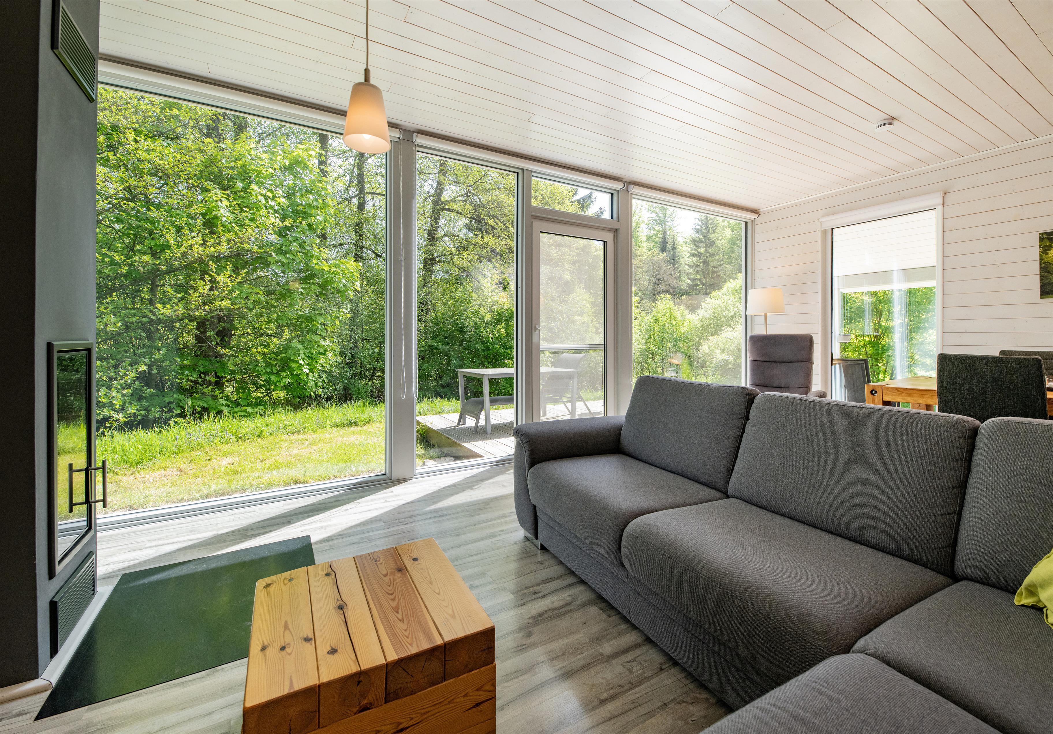 Das Ferienhaus mit einem lichtdurchluteten offenen Wohn- und Küchenbereich, zwei Schlafzimmern und einem Bad bietet Ihnen auf 61 Quadratmetern ausreichend Platz für 4 Personen. Die 7 Meter breite Glasfront lässt die Natur beim Essen oder Relaxen teilhaben. In der kalten Jahreszeit vollendet das knisternde Kaminfeuer das Urlaubsfeeling.