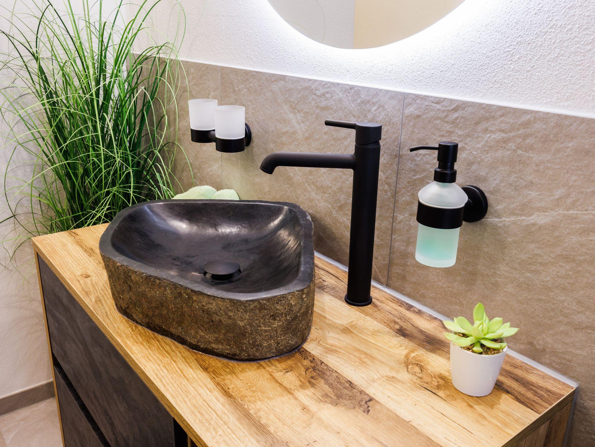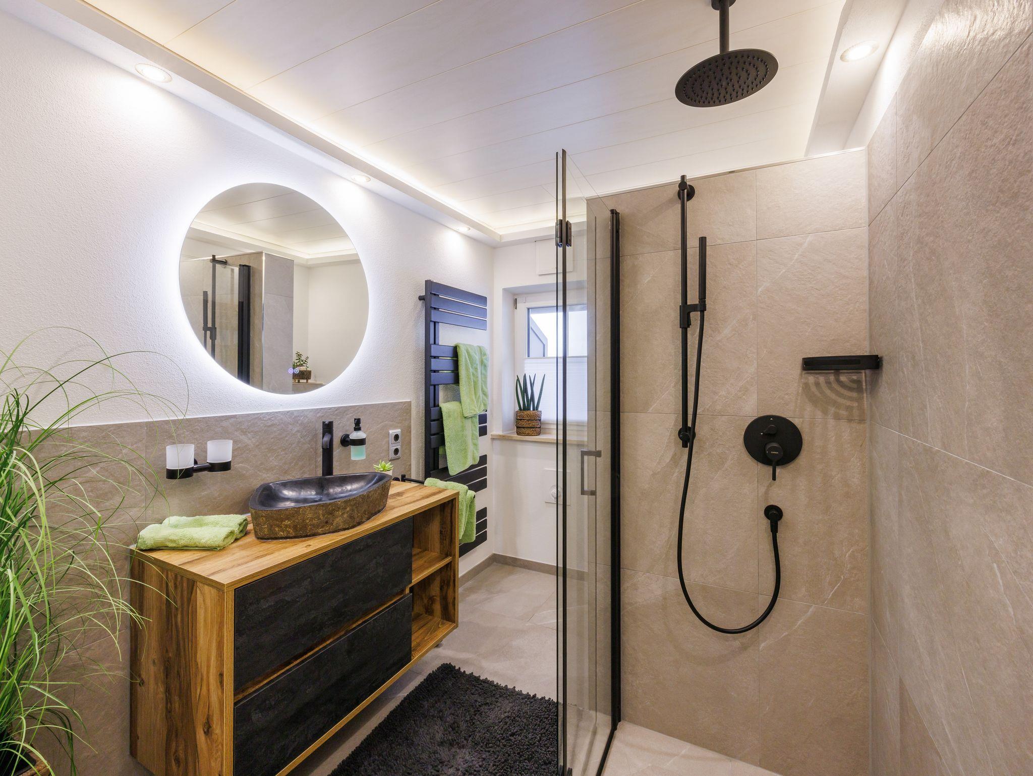 Neues Badezimmer mit Regen-Dusche, separatem WC, Kosmetikspiegel, Haartrockner, Wandheizkörper und Fußbodenheizung.