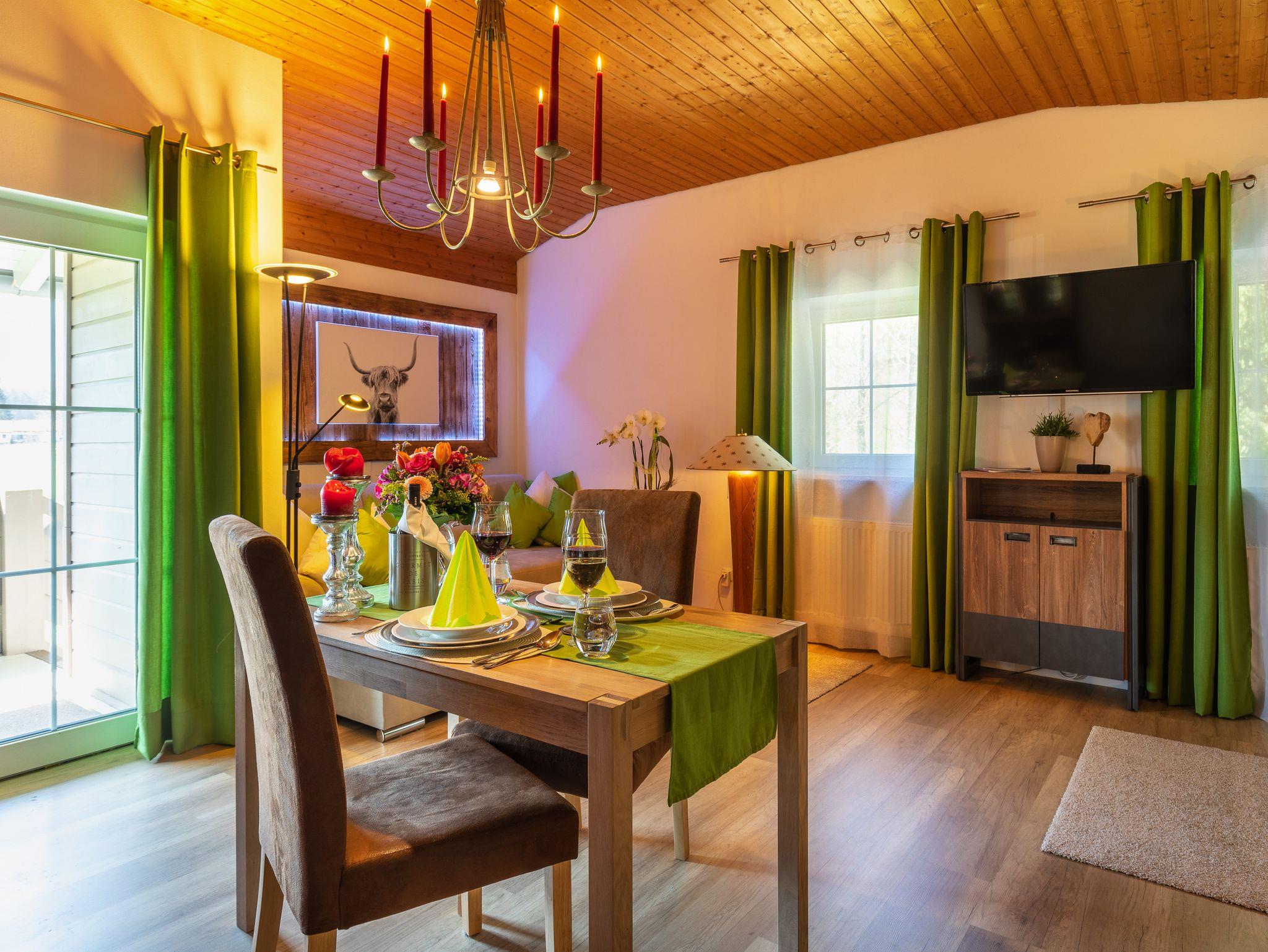 Wohn-/Schlafraum mit gemütlicher Sitzgruppe und separatem Esstisch.