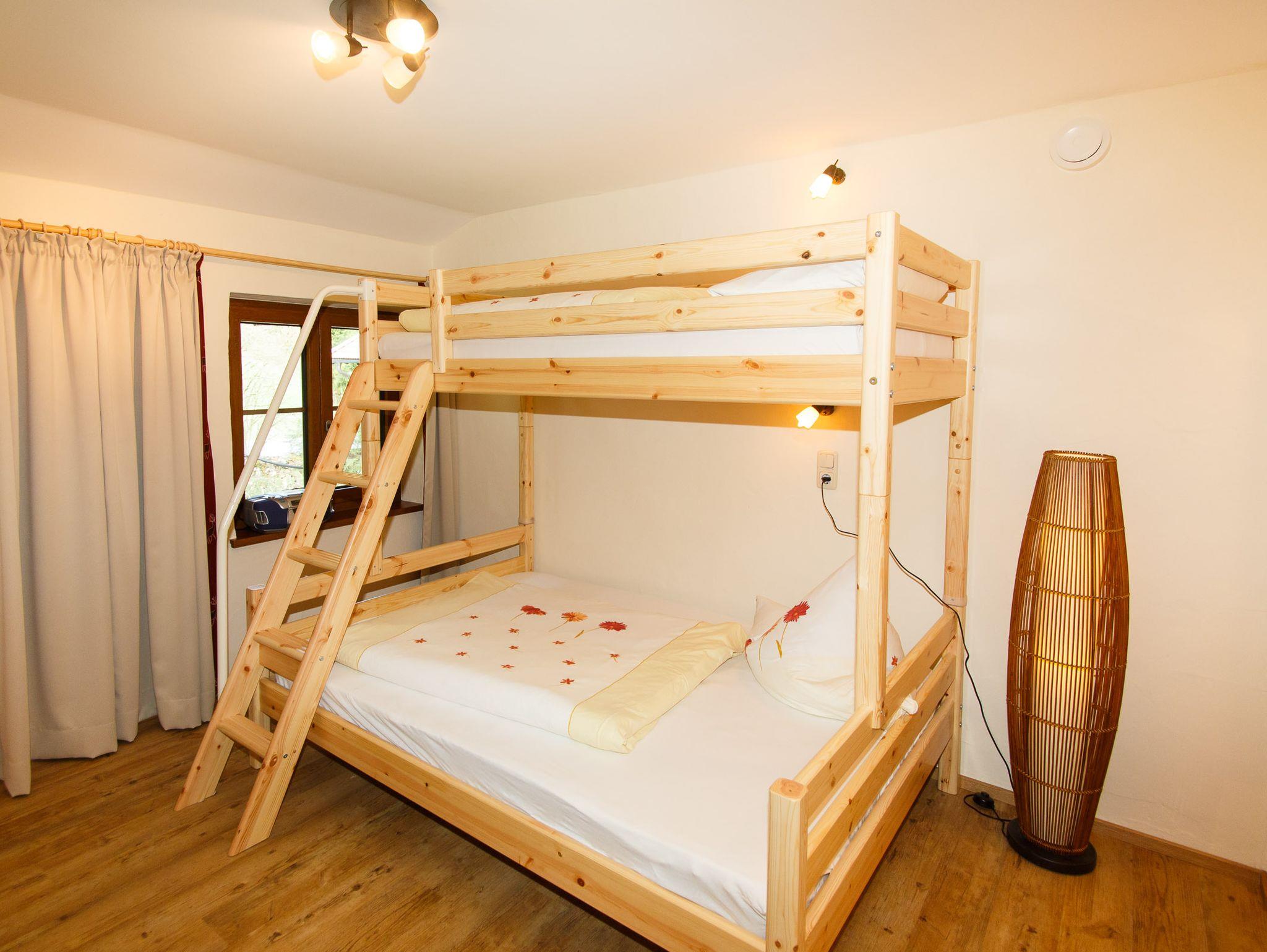 Großzügige Familien-Ferienwohnung für max. 5 Personen mit 89 qm Wohnfläche im Haupthaus 2.OG gelegen mit Südbalkon. 1 Schlafzimmer mit Himmelbett, ein weiteres Schlafzimmer als Kinderzimmer mit Etagenbett (unteres Bett 1,40 breit, oben 90 cm) und einem kleinen Einzelbett. Für eine 5. Person kann sowohl im Kinderzimmer als auch im Elternschlafzimmer ein Kinderreisebett zusätzlich aufgestellt werden. Vollausgestattete Küche (Backofen, Ceranfeld, Geschirrspüler, Kühlschrank mit Gefrierfach und den nötigen Kleingeräten), großes Badezimmer. Moderne Lüftungsanlage, kein Teppichboden.