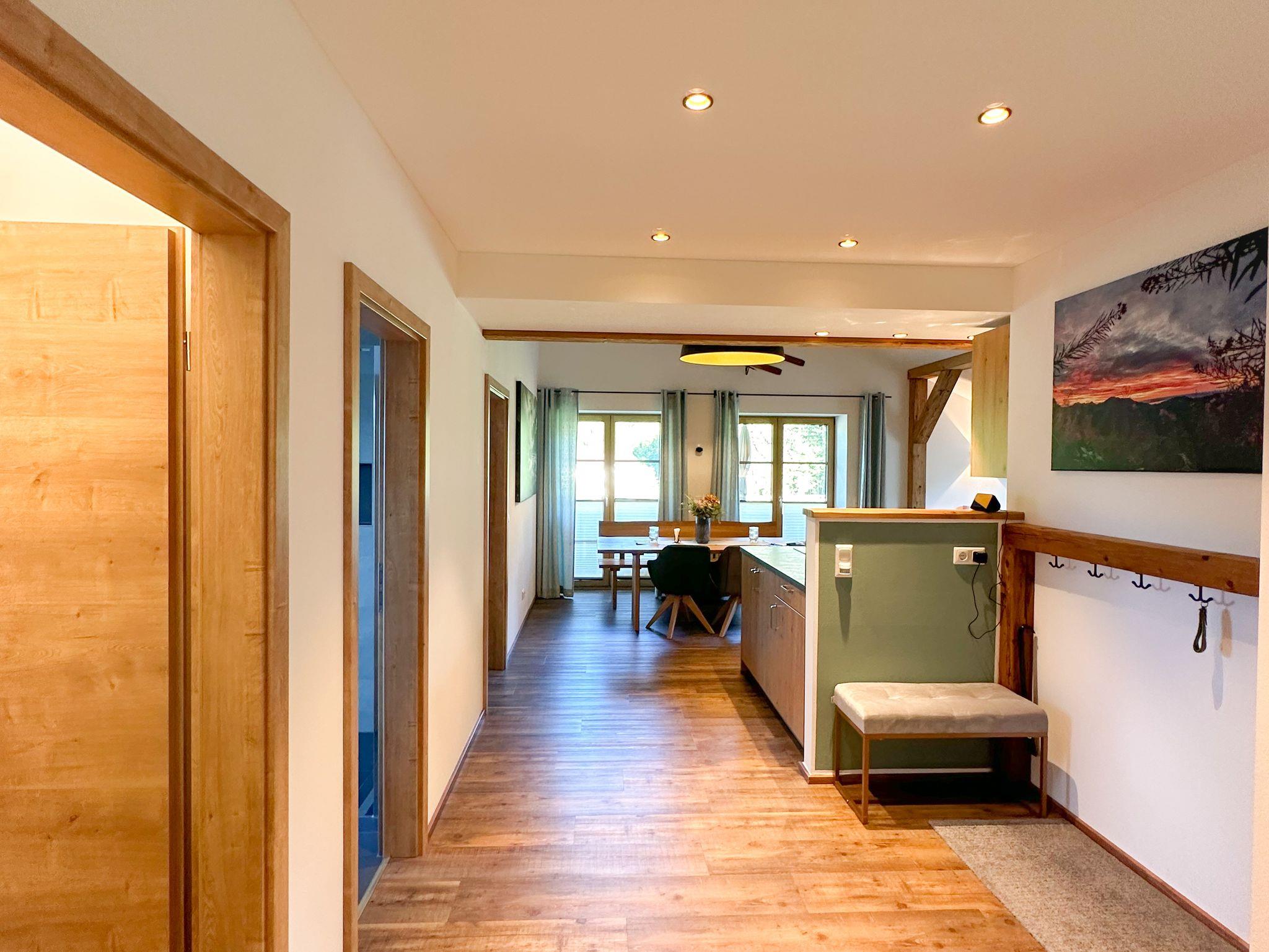 Neu renovierte Ferienwohnung mit schönen Altholz-Elementen. Balkon mit schönem Bergblick. Großzügiger Wohn-Essbereich.