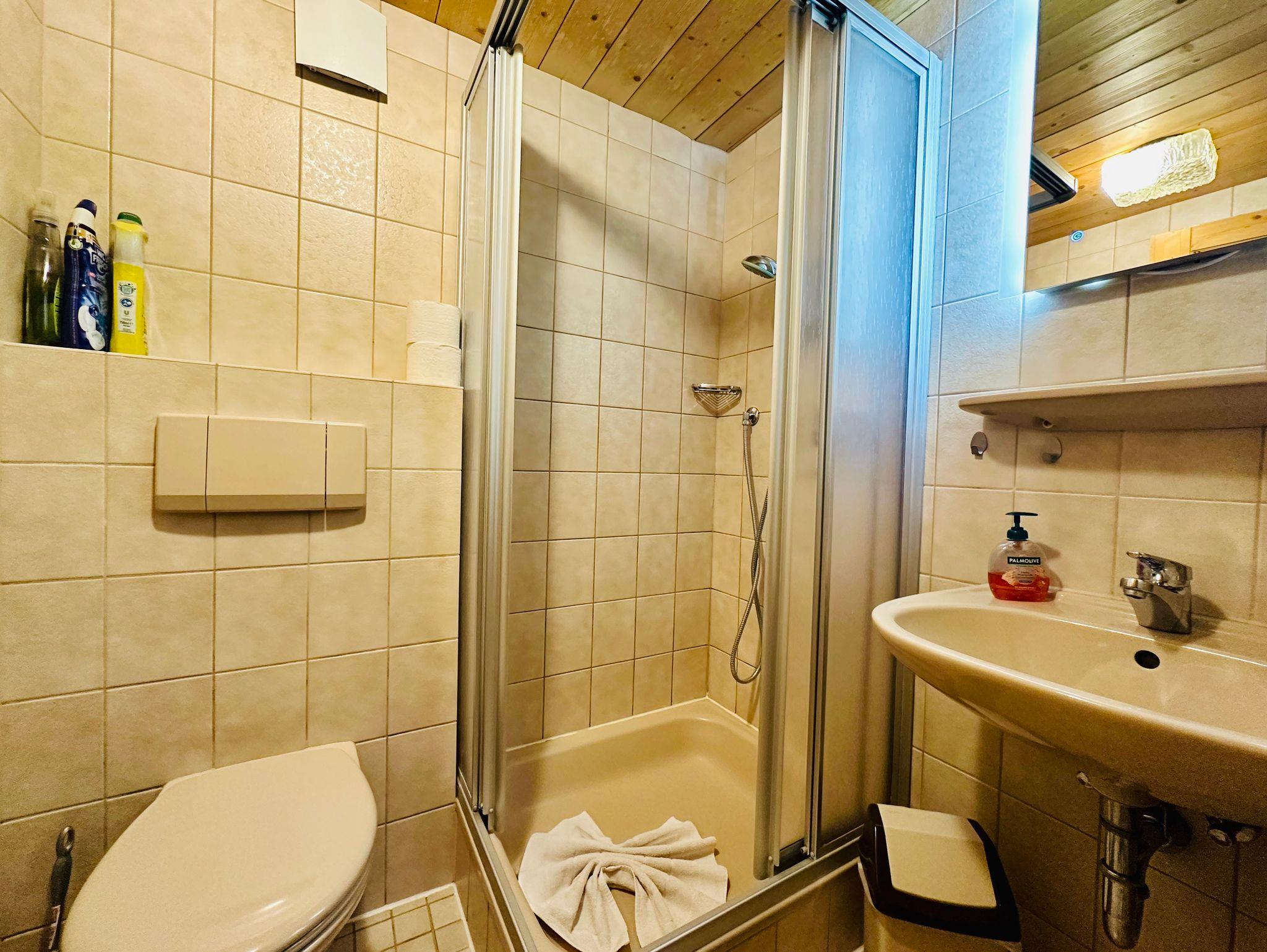 Bad mit Dusche, WC, Waschbecken und Haartrockner vorhanden.