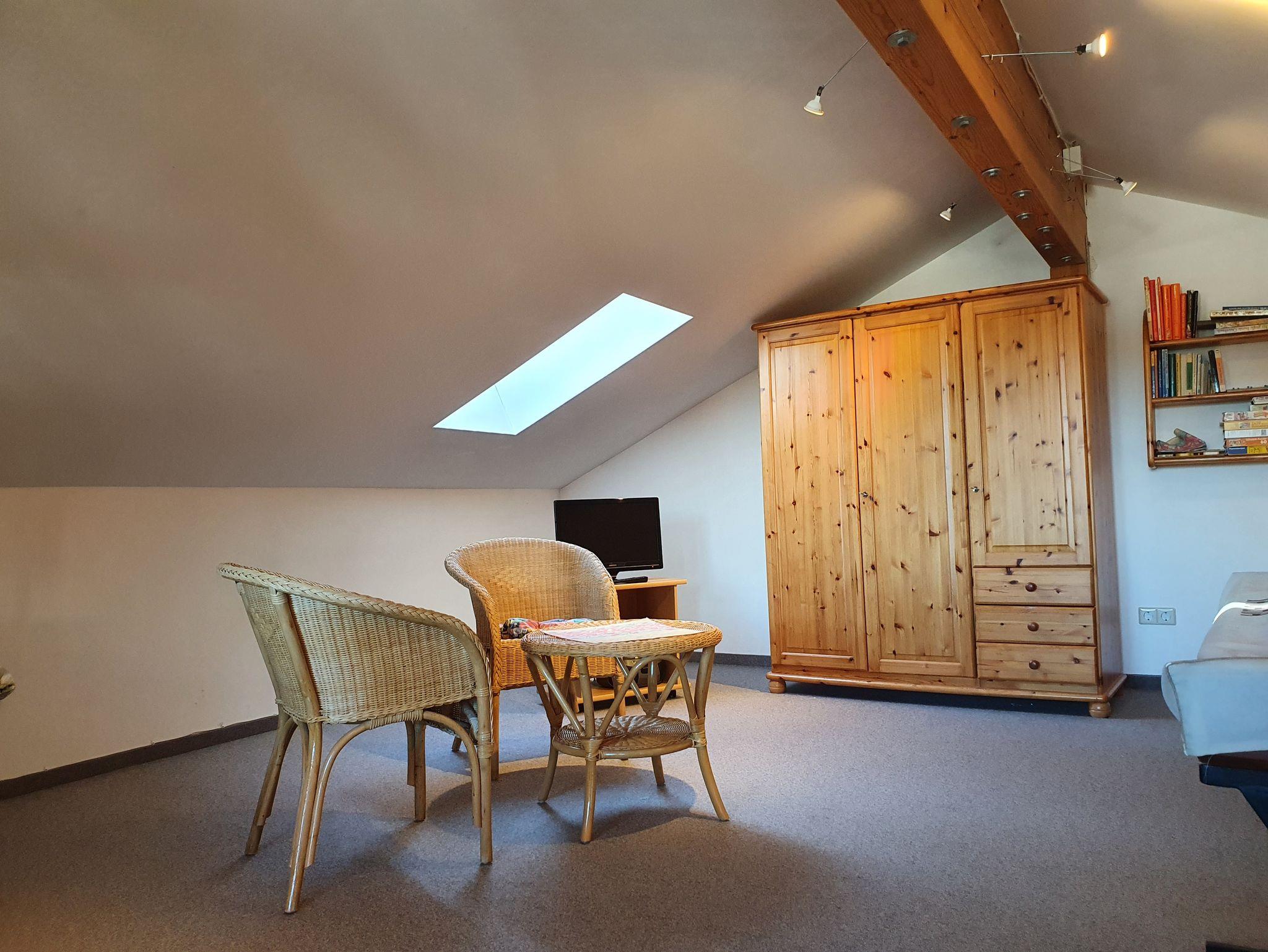 Im Dachgeschoss findet sich ein großes Schlafzimmer mit Fernseher, E-Piano, einer Loggia und reichlich Platz zum Spielen.