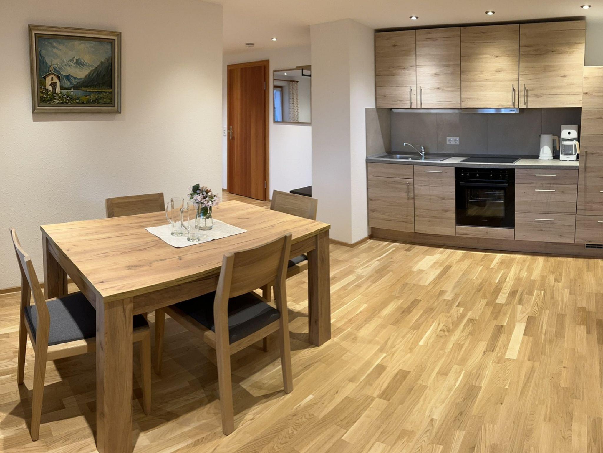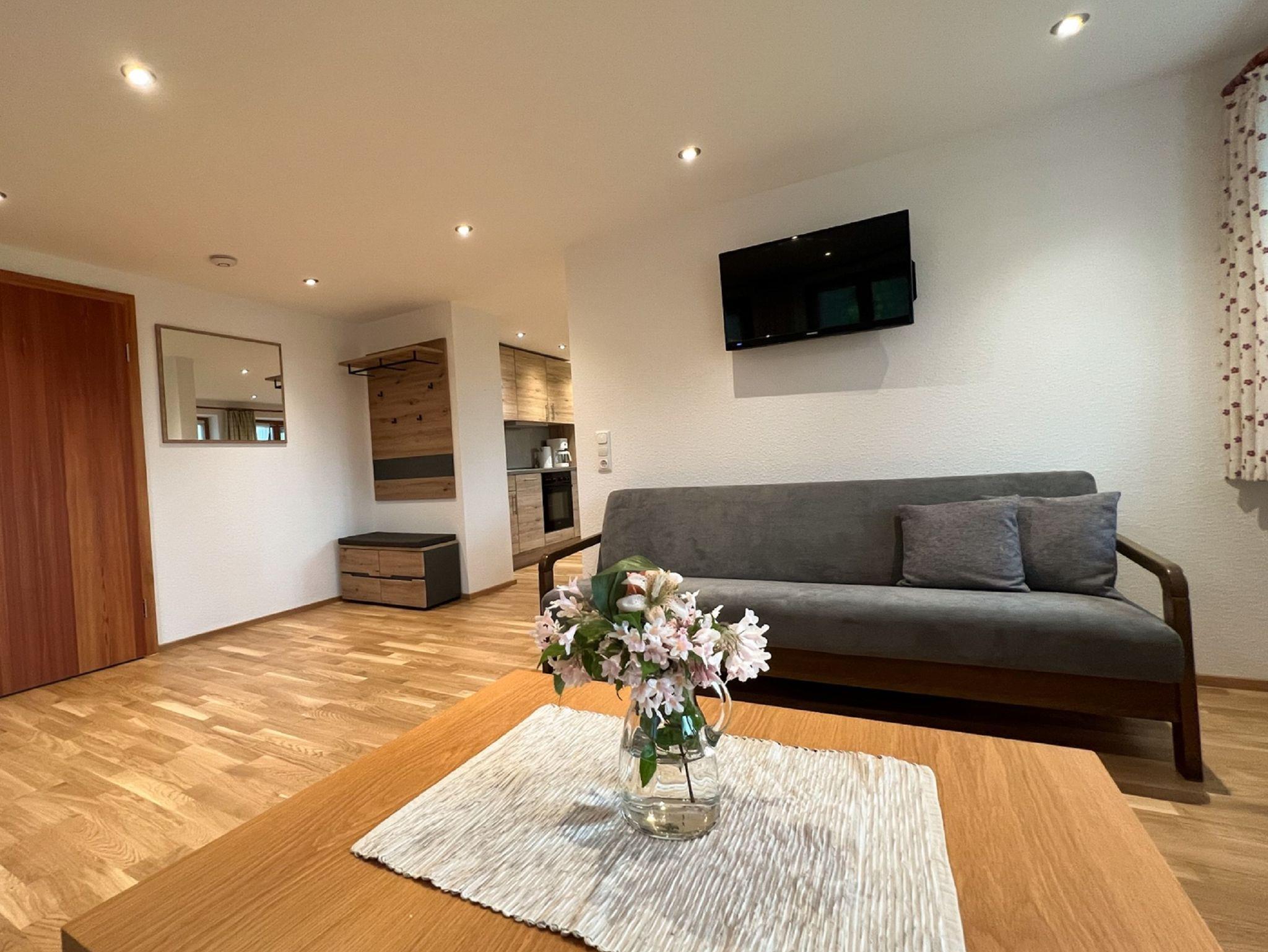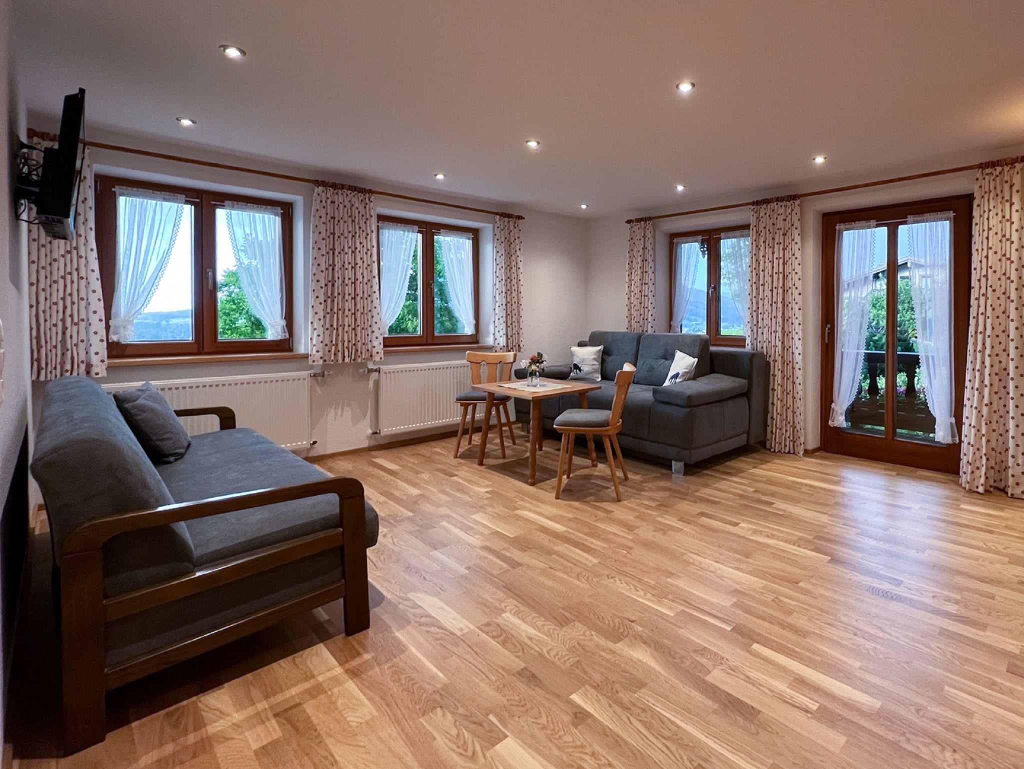 Maurerhof inkl. Chiemgaukarte, Ferienwohnung Zinnkopfblick 55qm Balkon, Wohnzimmer, 1 Schlafzimmer, Küchenzeile