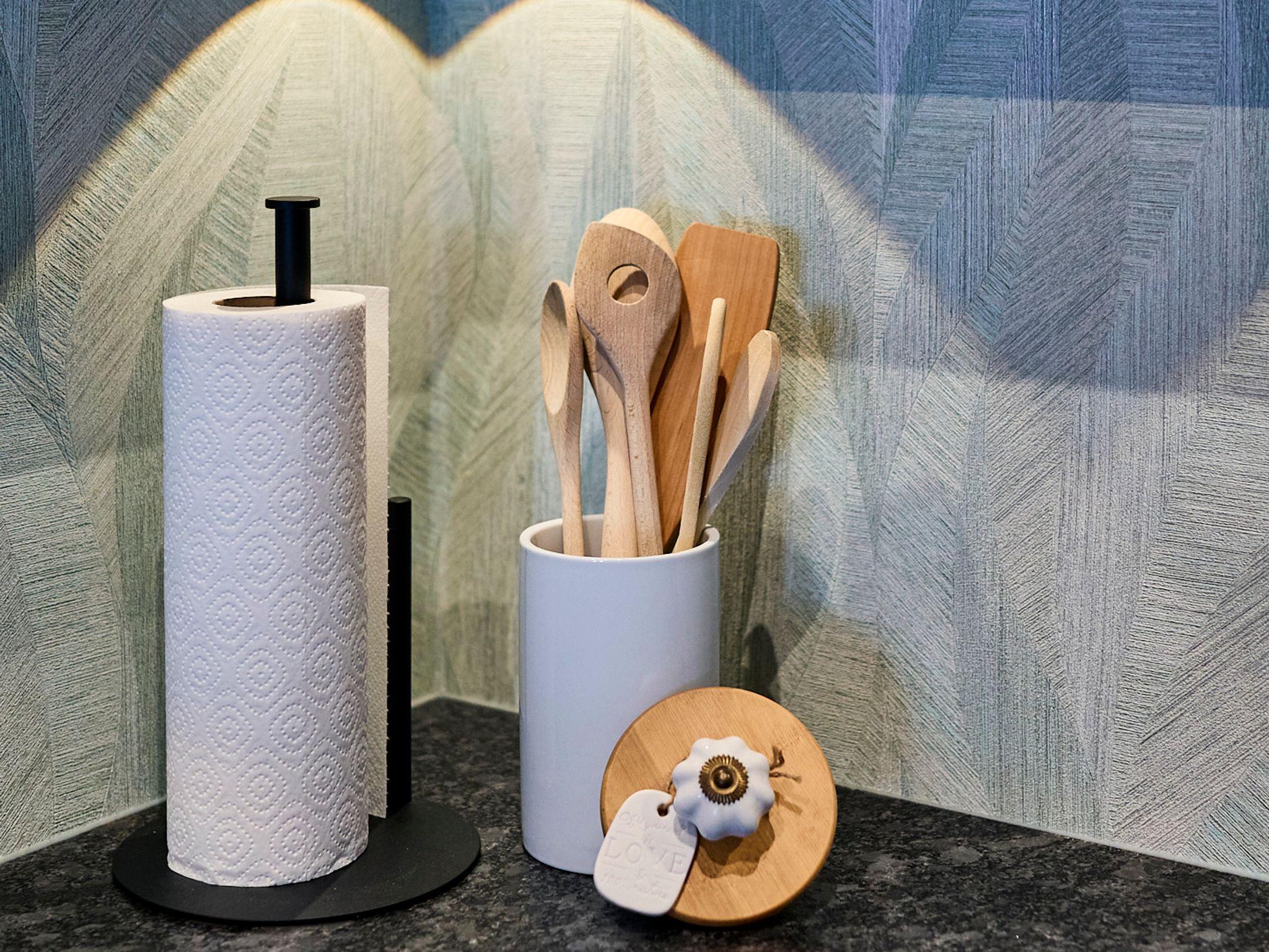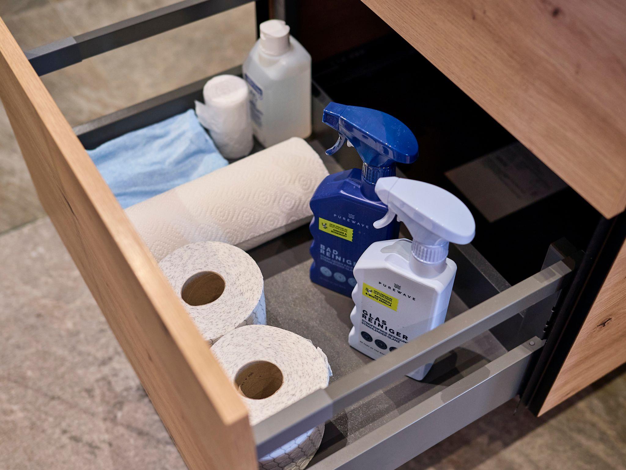 Im Bad sind nachhaltige Reinigungsmittel von Pure Wave, sowie Toilettenpapier vorhanden.