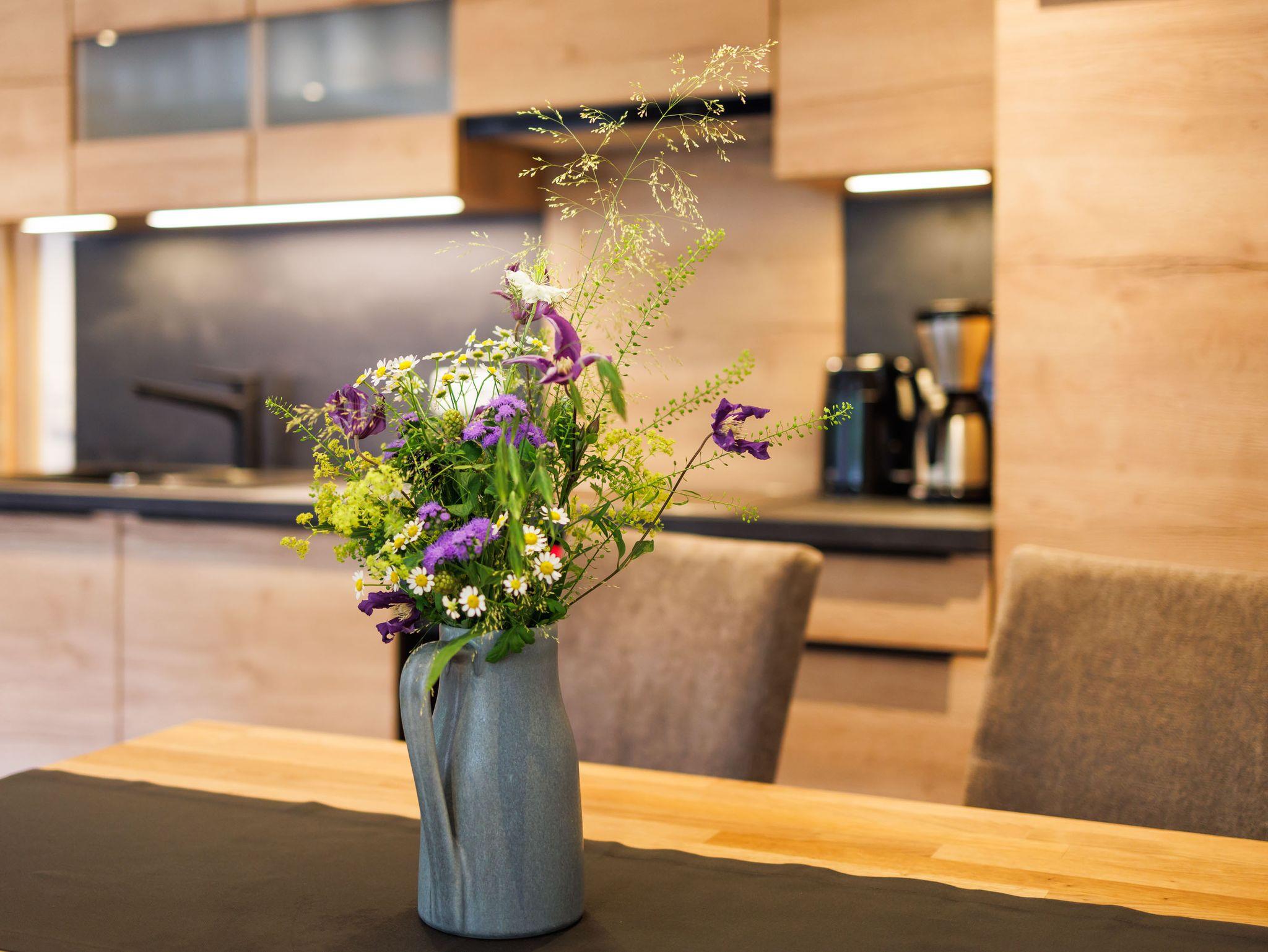 Es erwartet Sie eine renovierte hochwertige, liebevoll eingerichtete, und sehr gemütliche Ferienwohnung. Die Wohnung (60 qm) befindet sich im Erdgeschoß mit Terrasse und eigenem Garten mit Grillmöglichkeit. Der Wohn- Essraum ist mit einer gemütlichen Sitzecke (Flachbildschirm, Kabel-TV, DAB+Radio) ausgestattet. Die voll ausgestattete Küchenzeile verfügt über eine Spülmaschine, Backofen, Wasserkocher, Kaffeemaschine sowie einem Kühlschrank mit Gefrierfach. Die Schlafzimmer sind gemütlich eingerichtet mit geweils einem Doppelbett und einmal mit getrennten Betten. Ein geräumiges Badezimmer mit ebenerdiger Dusche, Waschbecken, Fön und Kosmetikspiegel runden das Bild ab. Die komplette Wohnung verfügt über eine Fußbodenheizung sowie einer Be-u. Entlüftungsanlage und ist somit Allergikerfreundlich. Ein Abstellraum (abschließbar) für Ski und Fahrräder ist vorhanden. Der Parkplatz für Ihr Fahrzeug befindet sich direkt am Haus. In der gesamten Wohnung verfügen Sie über W-Lan. Lebensmittelgeschäfte befinden sich in naher Umgebung und sind gut zu Fuß erreichbar. Bitte haben Sie Verständnis dass wir keine Tiere nehmen.