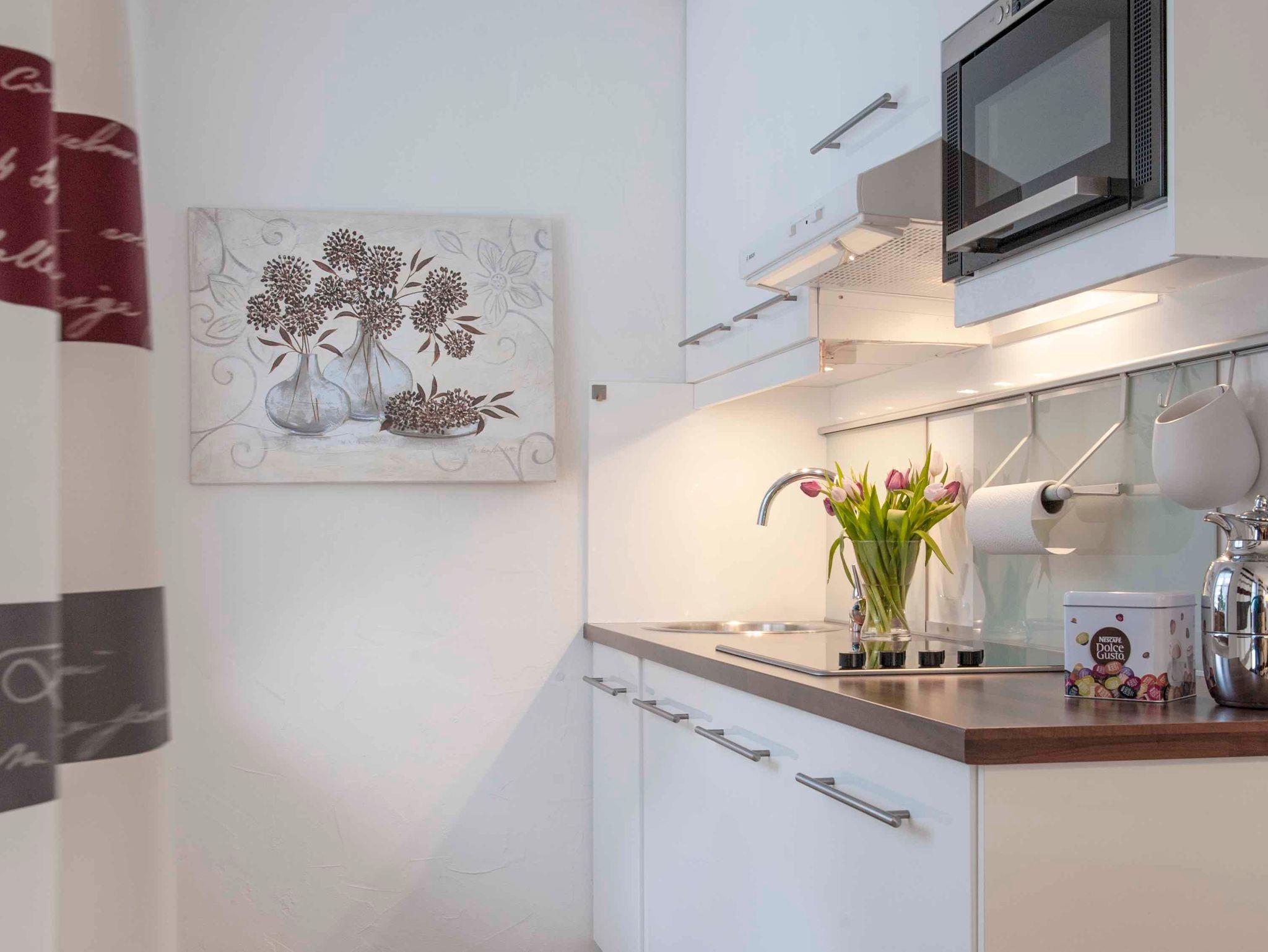 Mit nur 2 weiteren Wohnungen im Haus sichern Sie sich ruhige Urlaubstage in unserer gemütlich eingerichteten Wohnung. Verbringen Sie Ihre Abende bequem auf dem Sofa, das bei Bedarf schnell zu einem Bett umgebaut werden kann, oder aber gemütlich im Sessel. Das Schlafzimmer ist funktionell eingerichtet und hat ausreichend Stauraum. Auch die Küche bietet Ihnen alles Notwendige. Das kleine Duschbad wurde 2019 renoviert und entspricht dem heutigen Standard. Gerne können Sie an kalten Tagen unsere Sauna im Nachbarhaus nutzen und sich dort ausruhen. Neben einem PKW-Stellplatz gibt es auch für Ihre Fahrräder eine Unterstellmöglichkeit. Für Ihre Einkäufe können Sie auf beides verzichten - alles ist fußläufig erreichbar.