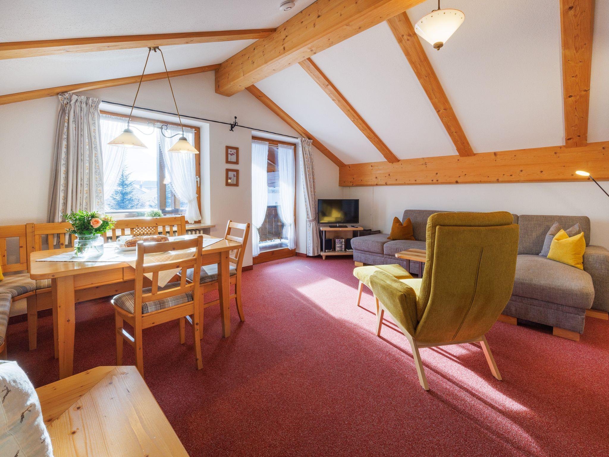 Es erwarten Sie gepflegte, gemütliche Ferienwohnungen bzw. Appartements in verschiedenen Größen, ausgestattet mit Dusche oder Bad/WC, Radio, Kabel-TV, Balkon mit Bergblick, Telefon und z. t. Kachelofen. Auf Wunsch Frühstücksbuffet mit Müsliecke. Ruhige zentrale Lage, 5 Gehminuten zum Ortszentrum. Parkplatz direkt am Haus, Tiefgaragenstellplatz auf Wunsch möglich. Gästehäuser inmitten einer großen Spiel- und Liegewiese. Loipen und Skilift ca. 300 m entfernt. Skiraum mit Schuhtrockner.