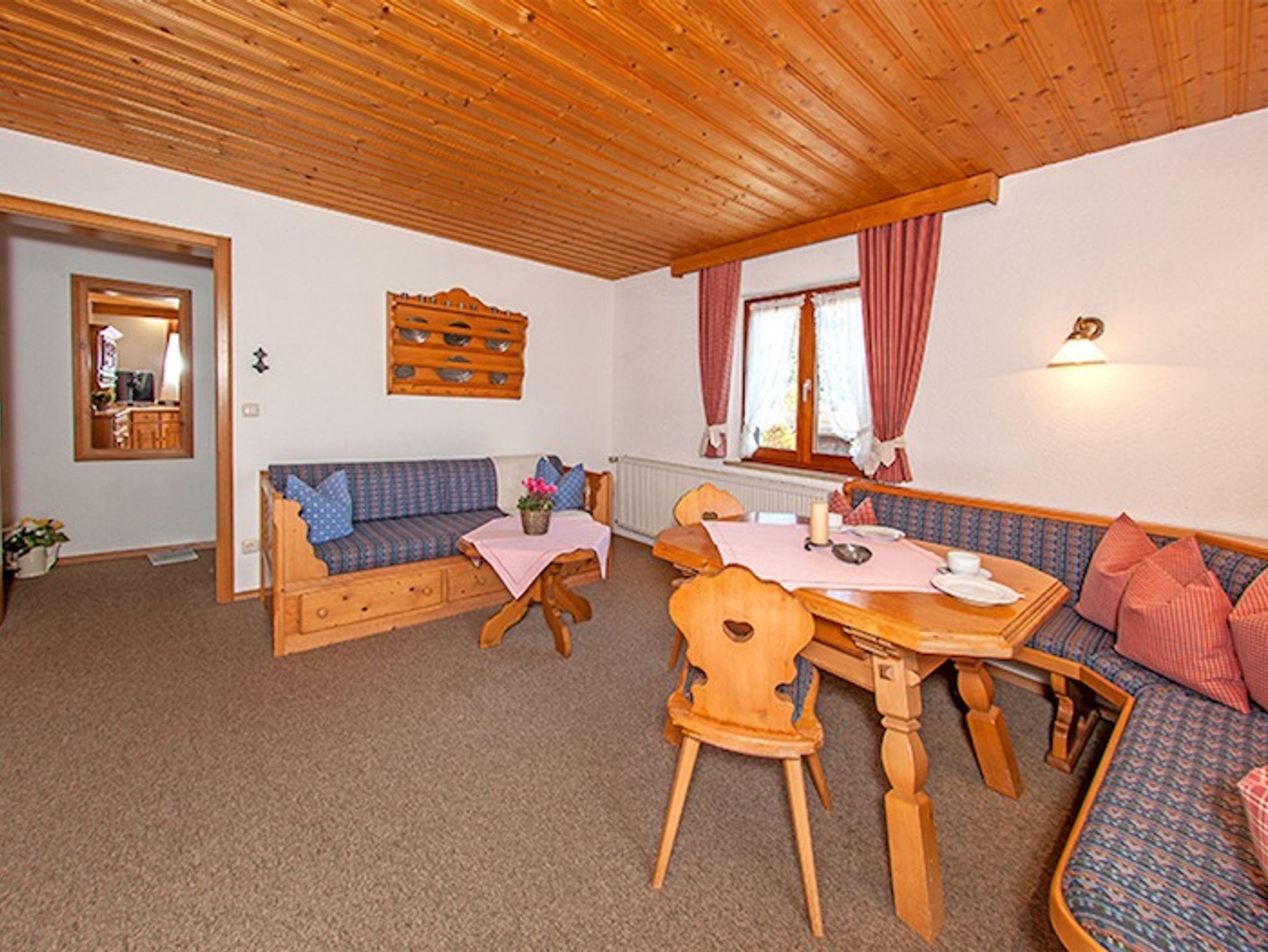 Die geräumige, bayerische Wohnstube ist ausgestattet mit einer kleinen Couch welche als zusätzliche Schlafmöglichkeit für ein Kind geeignet ist | einer geräumigen Eckbank | Anrichte | Flat-TV | DVD Player | Stereoanlage | Direkter Zugang zum kleinen Südbalkon mit traumhaftem Bergblick. Im Gang befindet sich eine kleine, einfache Küchenzeile u.a. mit zwei Platten Herd | Kühlschrank | Kaffemaschine | Toaster | Eierkocher. Das seperate Schlafzimmer verfügt über Doppelbett | Schrank. Kleines Bad mit Dusche | WC | Föhn | Kosmetikspiegel | Kosmetikartikel. WLAN.
