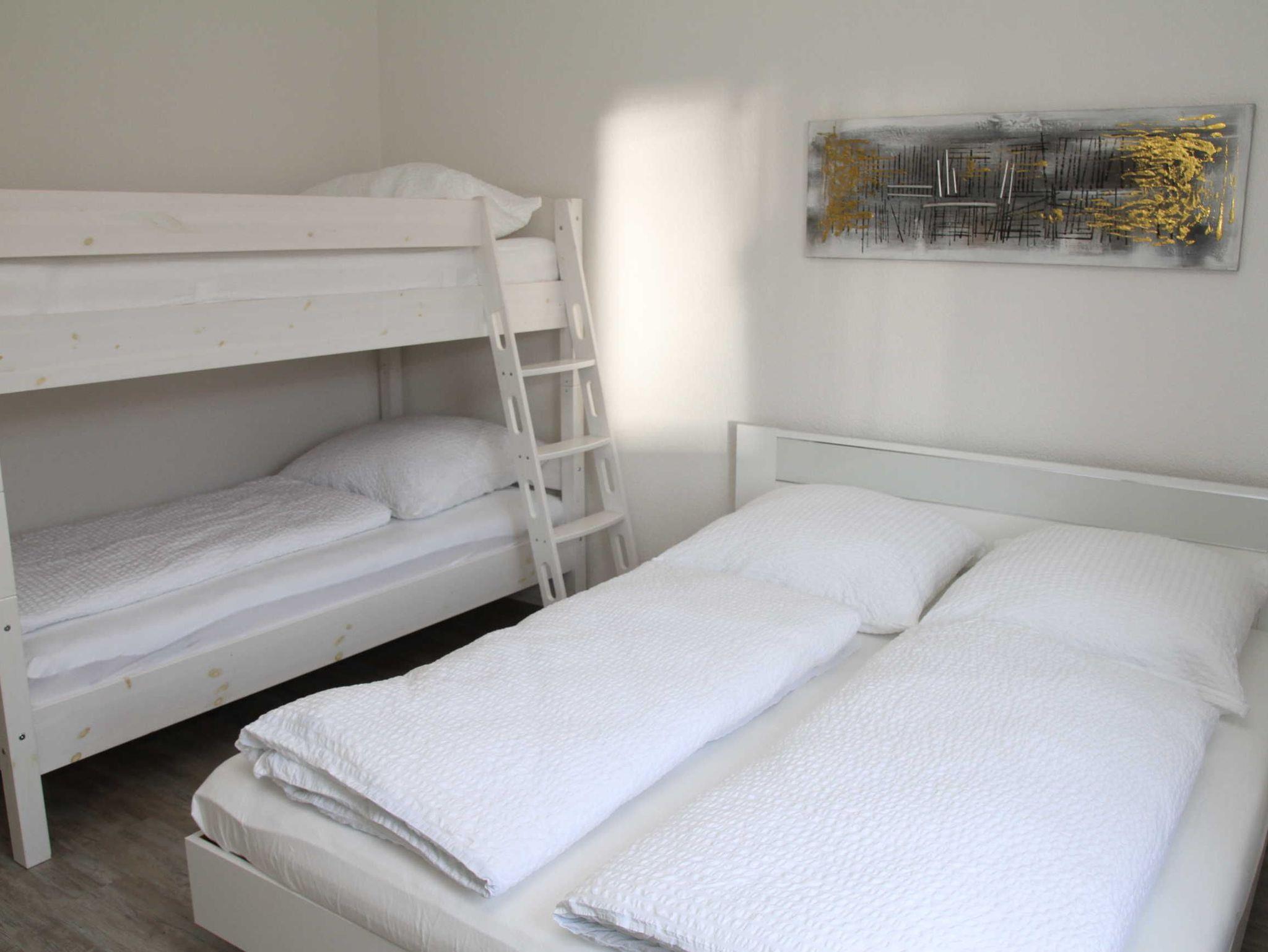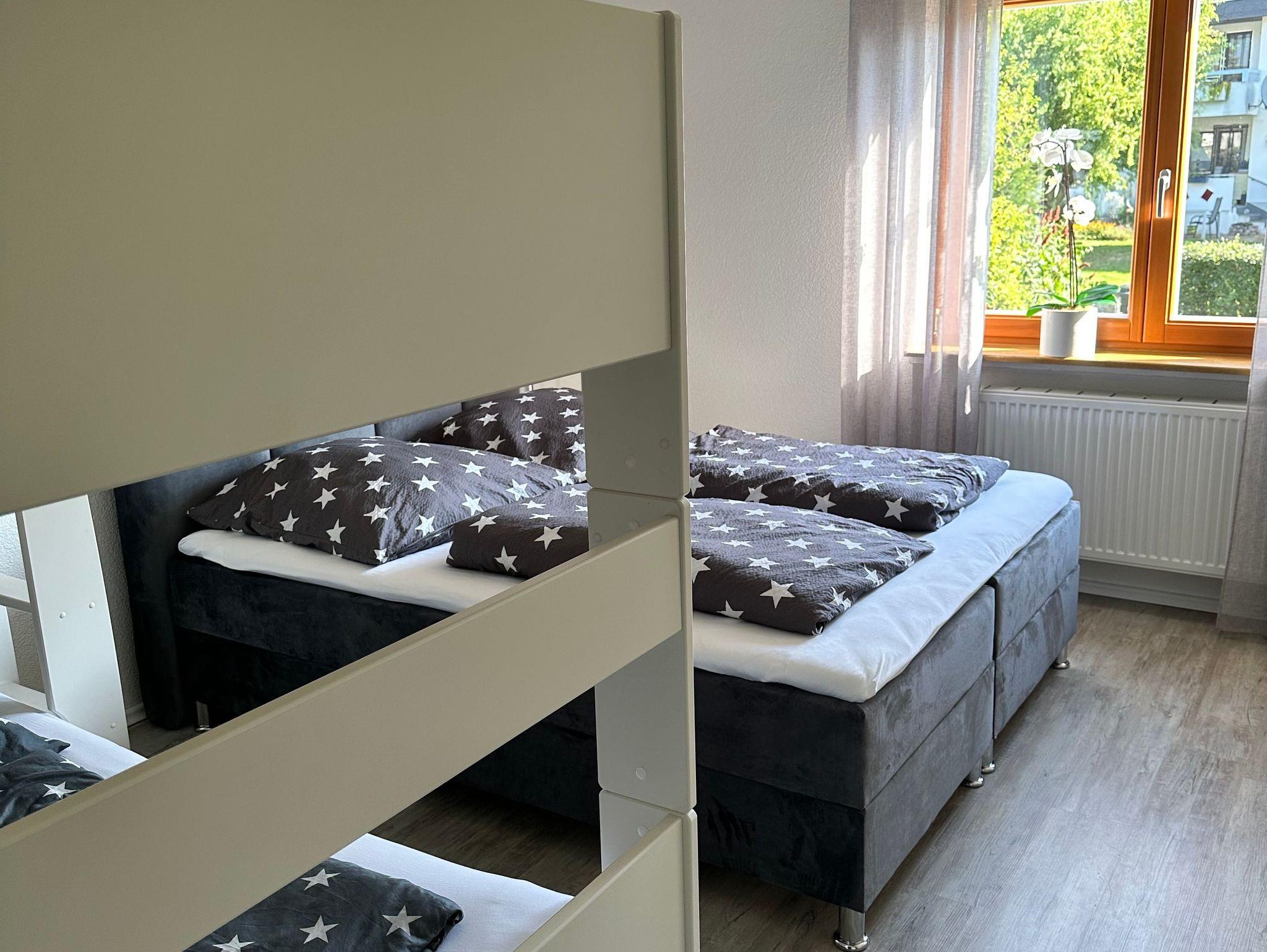 Wohn- und Schlafzimmer: Schlafzimmer mit Boxspringbett 160x200 cm und 1 Etagenbett 90x200 cm, Wohnzimmer mit Schlafsofa 140x200 cm.