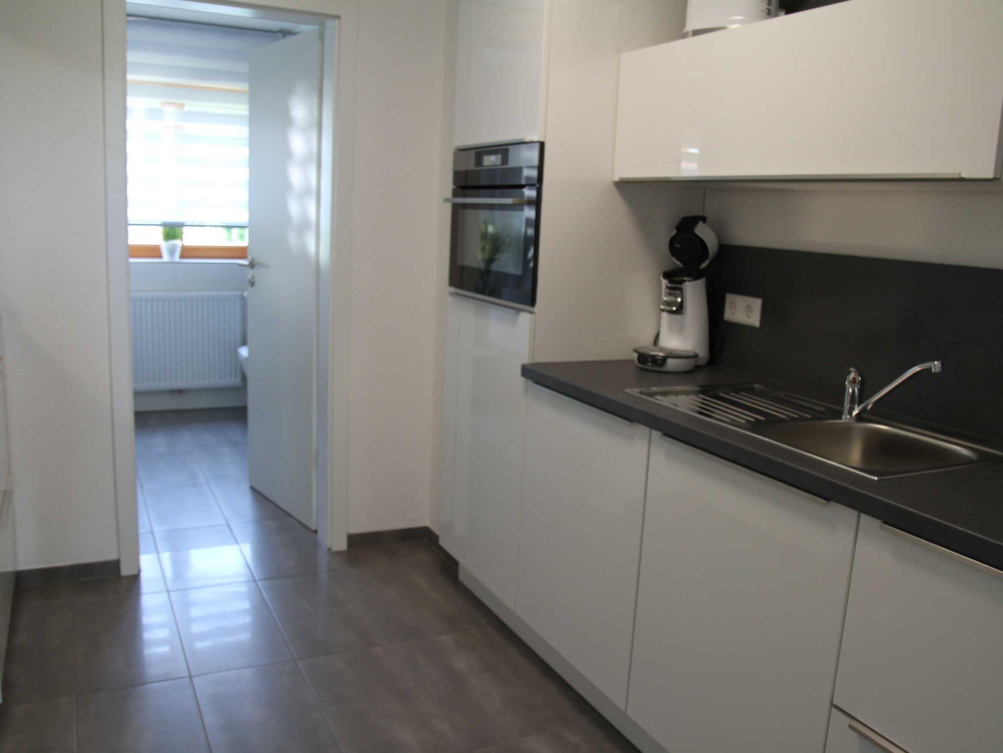 Eine komplett eingerichtete Wohnküche mit kombiniertem Backofen/Mikrowelle, Toaster, Wasserkocher, Kaffee-Pad-Maschine, Spülmaschine, Kühlschrank mit Gefrierfach.